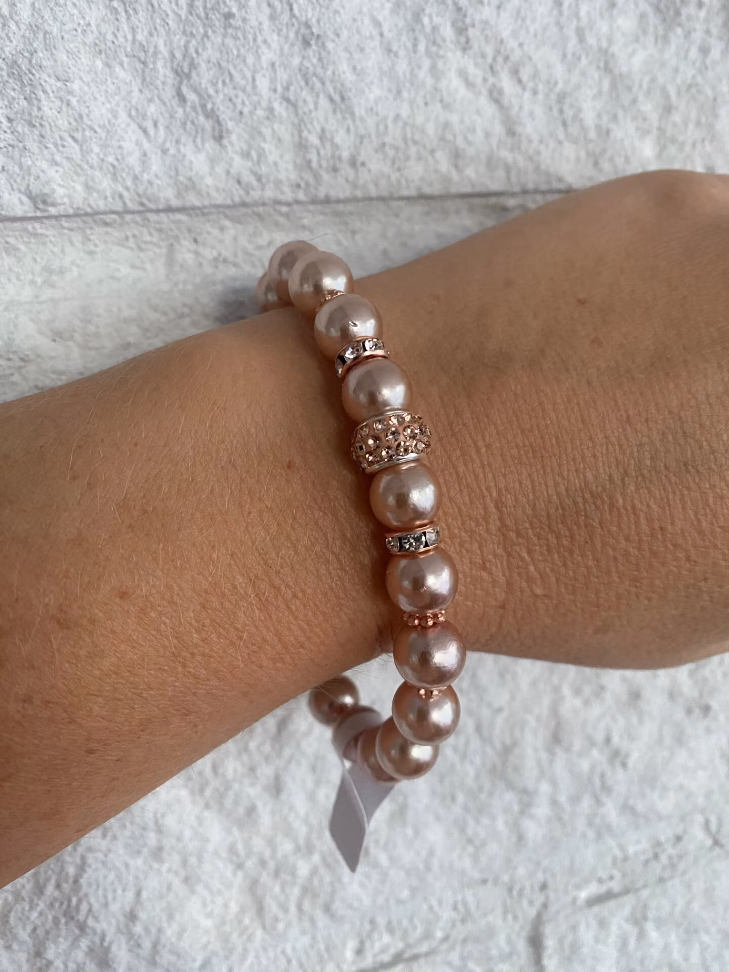 Vackert armband i champagnefärgade pärlor varvat med silverfärgade distanser och två vita oregelbundna sötvattenpärlor, strass och avslutspärla.Pärlor: 6mmVisas