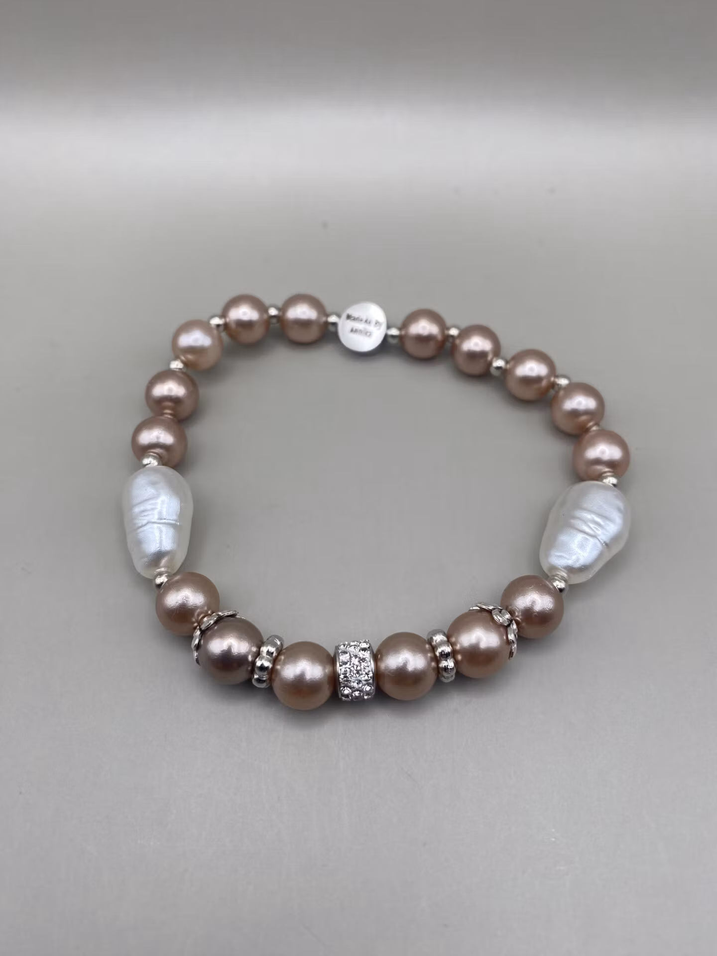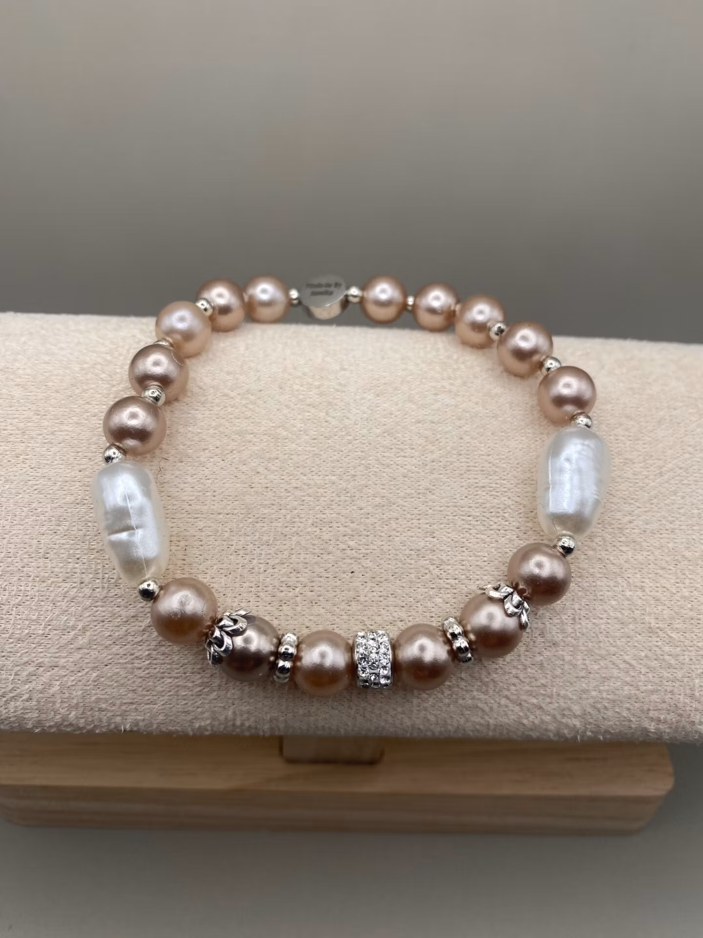 Vackert armband i champagnefärgade pärlor varvat med silverfärgade distanser och två vita oregelbundna sötvattenpärlor, strass och avslutspärla.