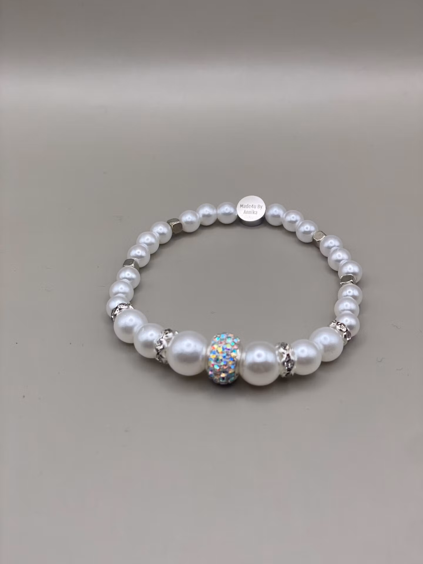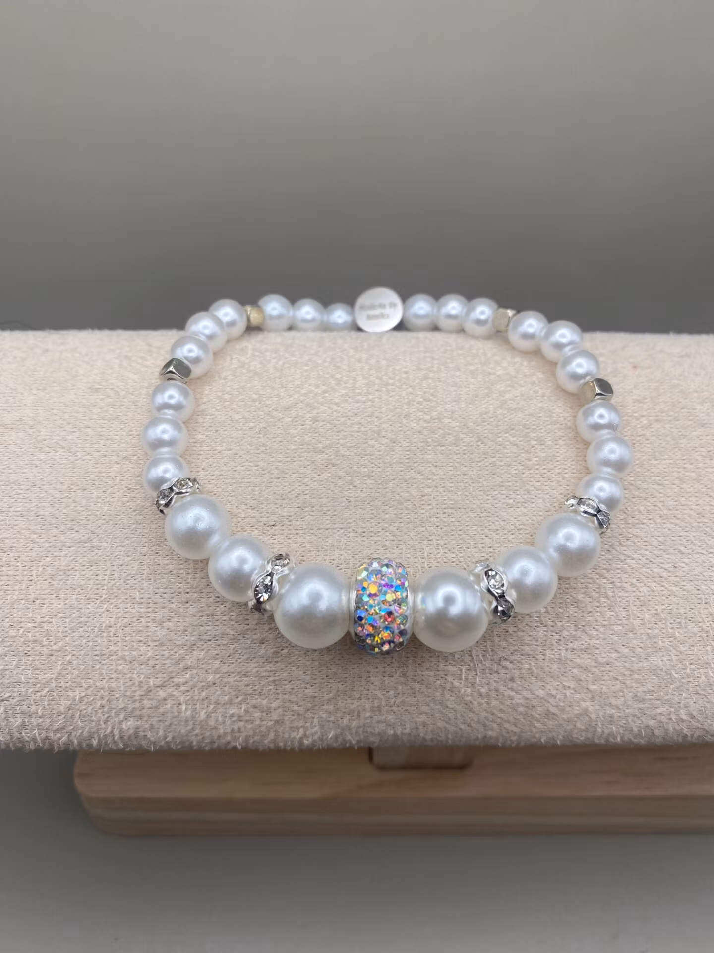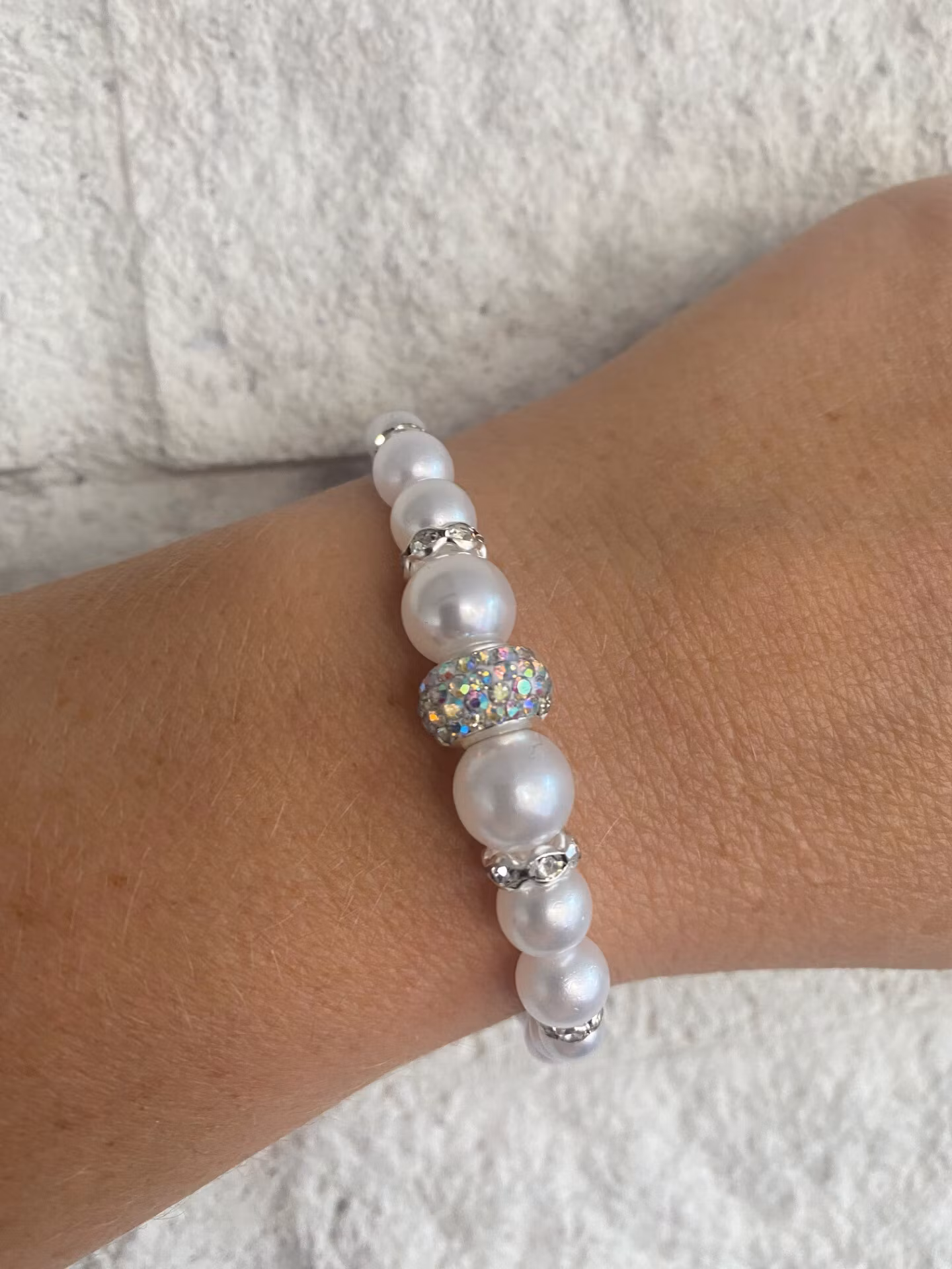 Vackert armband i mönster av kritvita pärlor i olika storlekar och silverfärgade detaljer och strass.