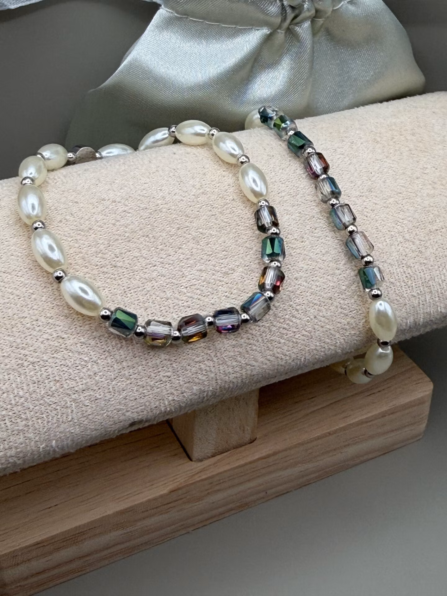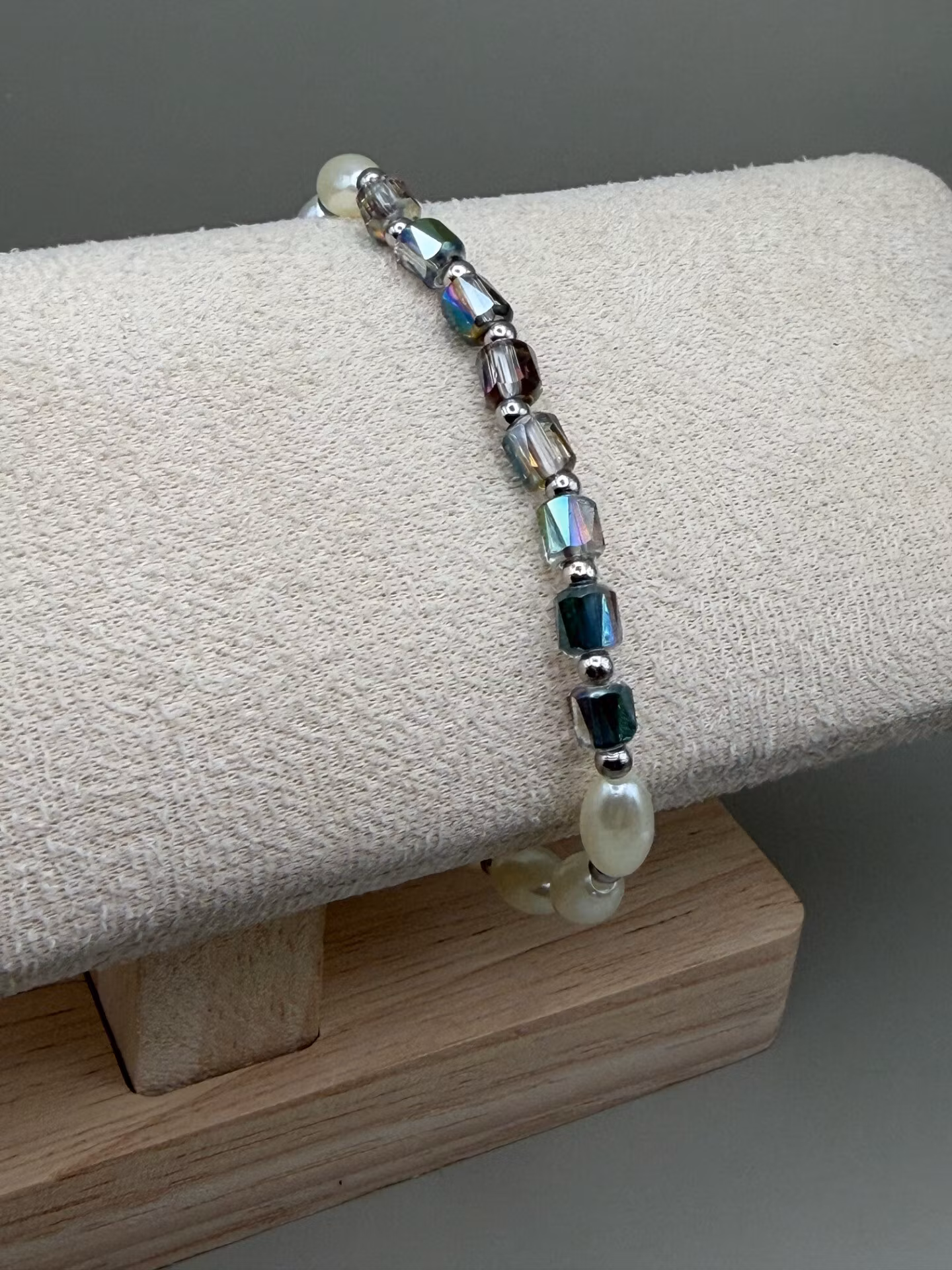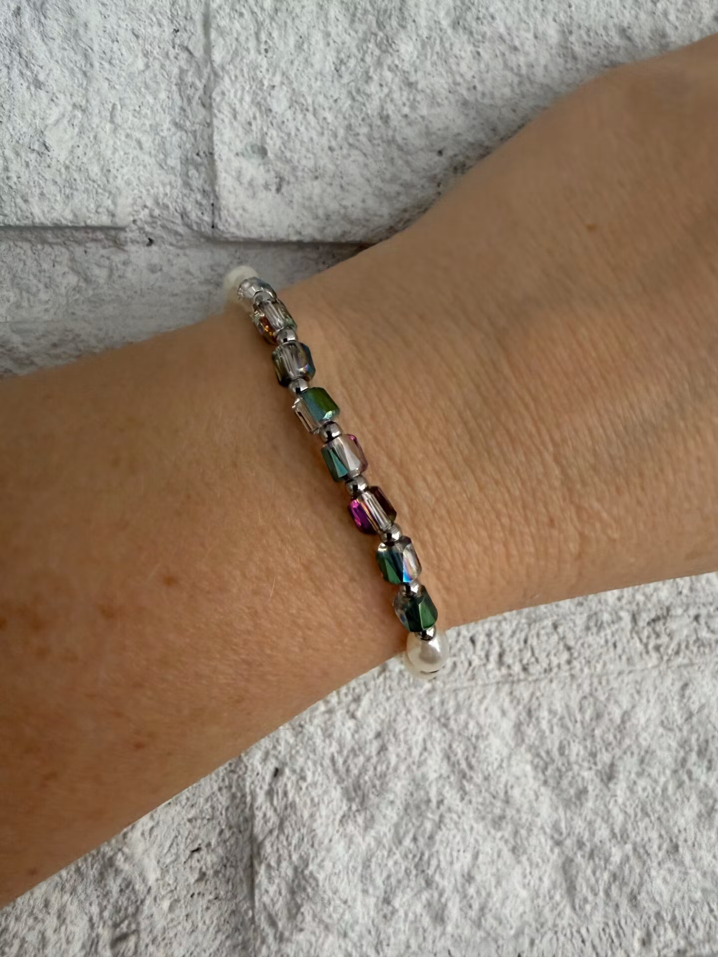 Vackert armband i ett varvat mönster av avlånga, benvita högblanka pärlor och små silverfärgade distanser. Som blickfång bryts mönstret av avlånga facetterade glaspärlor som skimrar vackert i ljuset, även de varvade med silverfärgade detaljer. Armbandet avslutas, som alltid, med min signaturpärla.