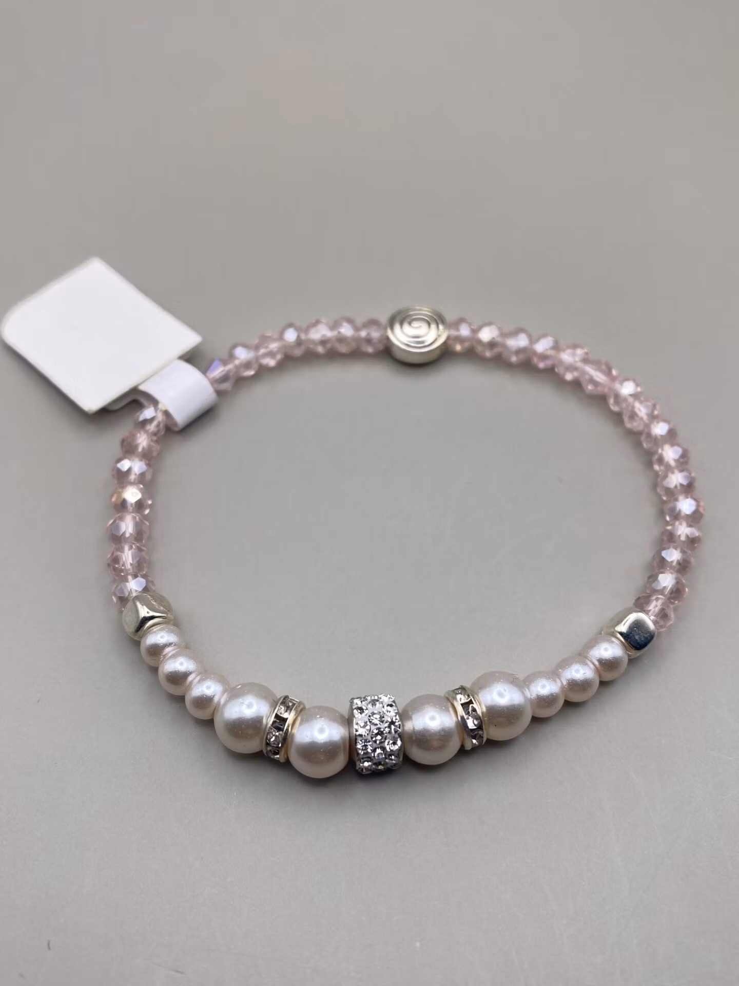 Armband i härligt svagt ljusrosa pärlor, varvat med silverfärgade detaljer och strass i blickfånget, ljusrosa glaspärlor runt om.