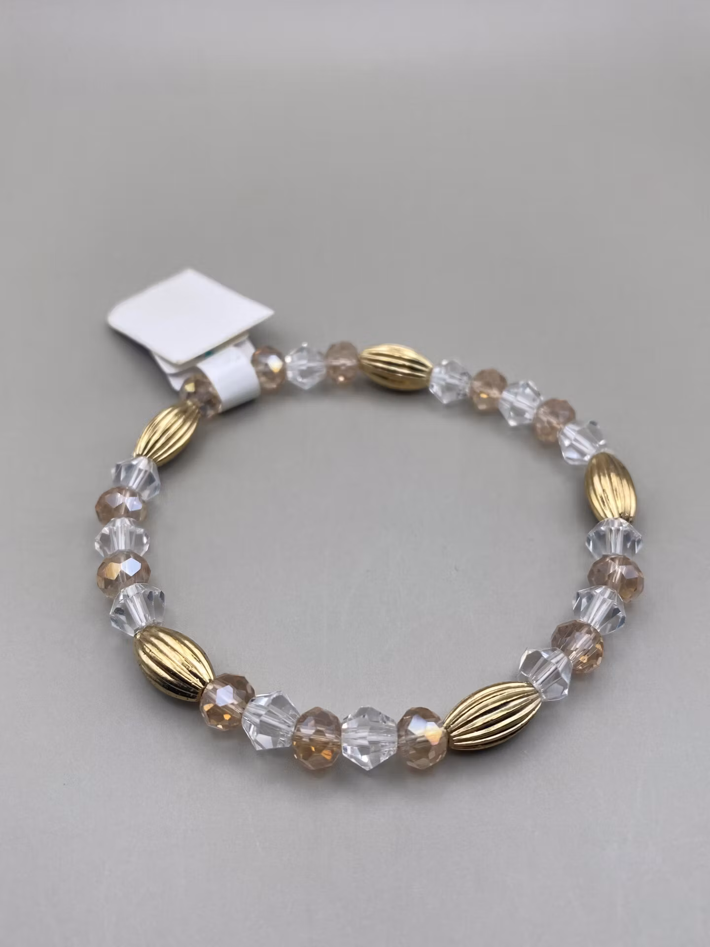 Armband i champagnefärgade glaspärlor varvat med genomskinliga glaspärlor, guldfärgade dekorationer runt om.