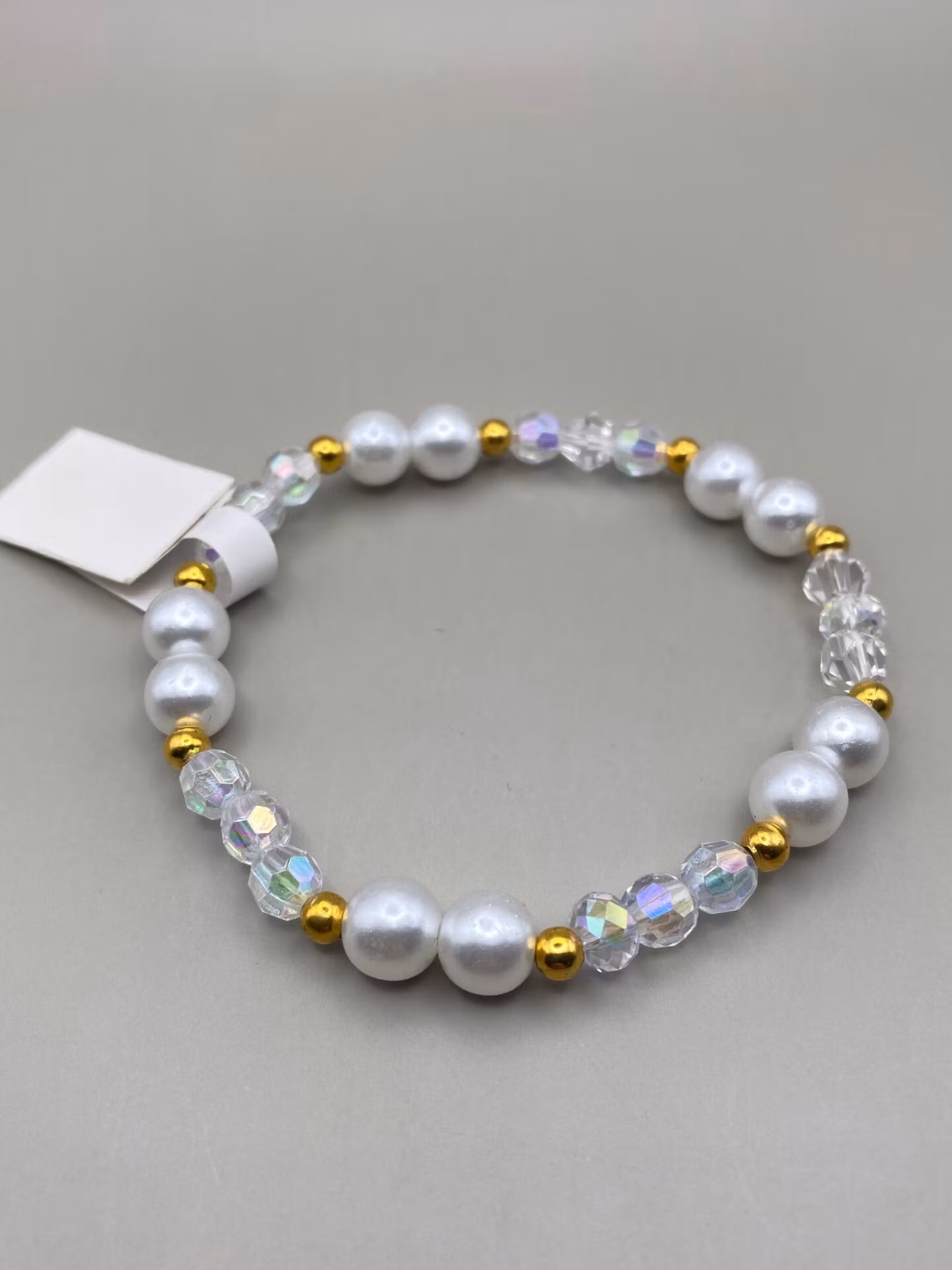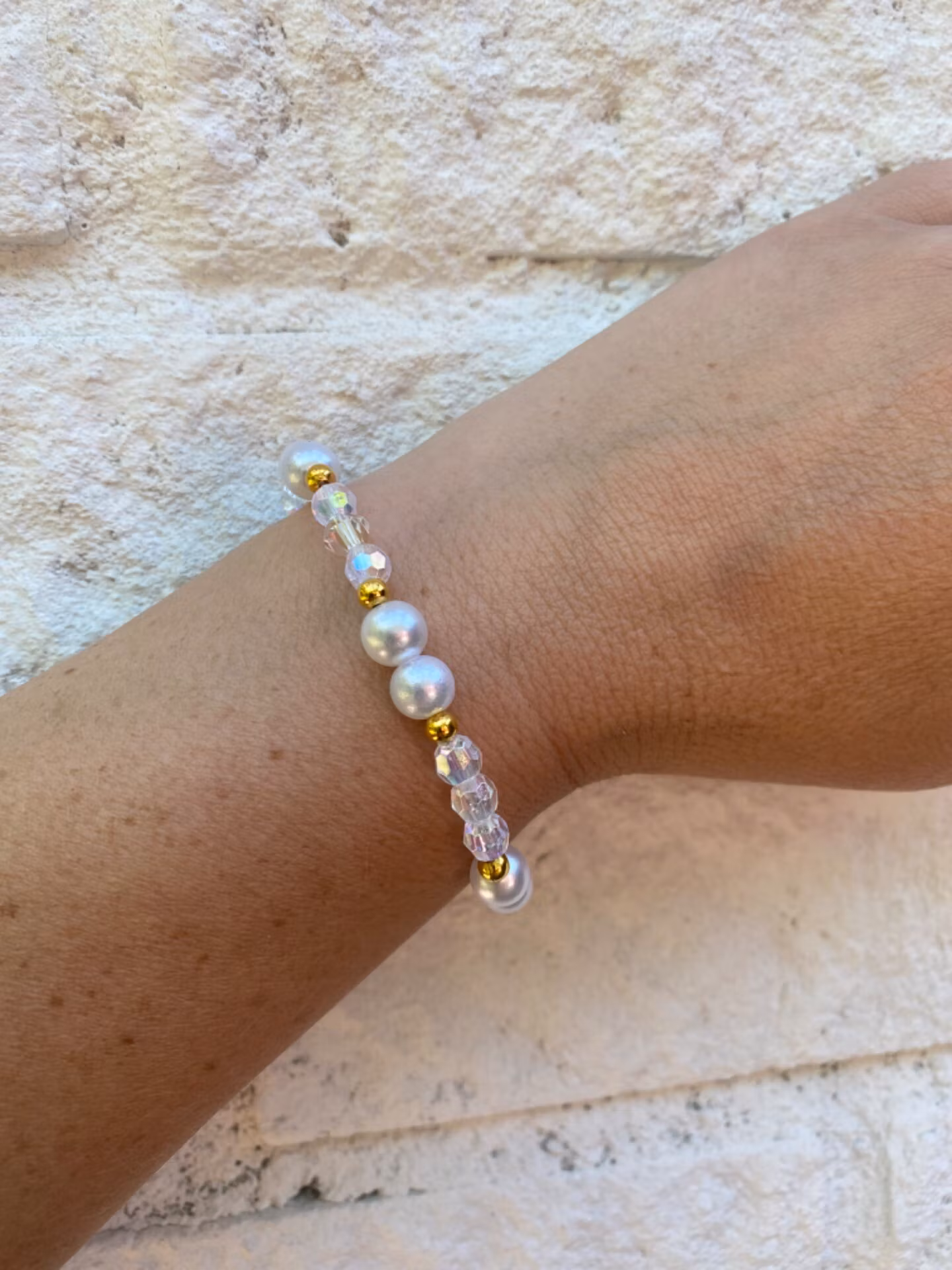 Armband i kritvita vaxade pärlor, varvat med genomskinliga glaspärlor och guldfärgade detaljer