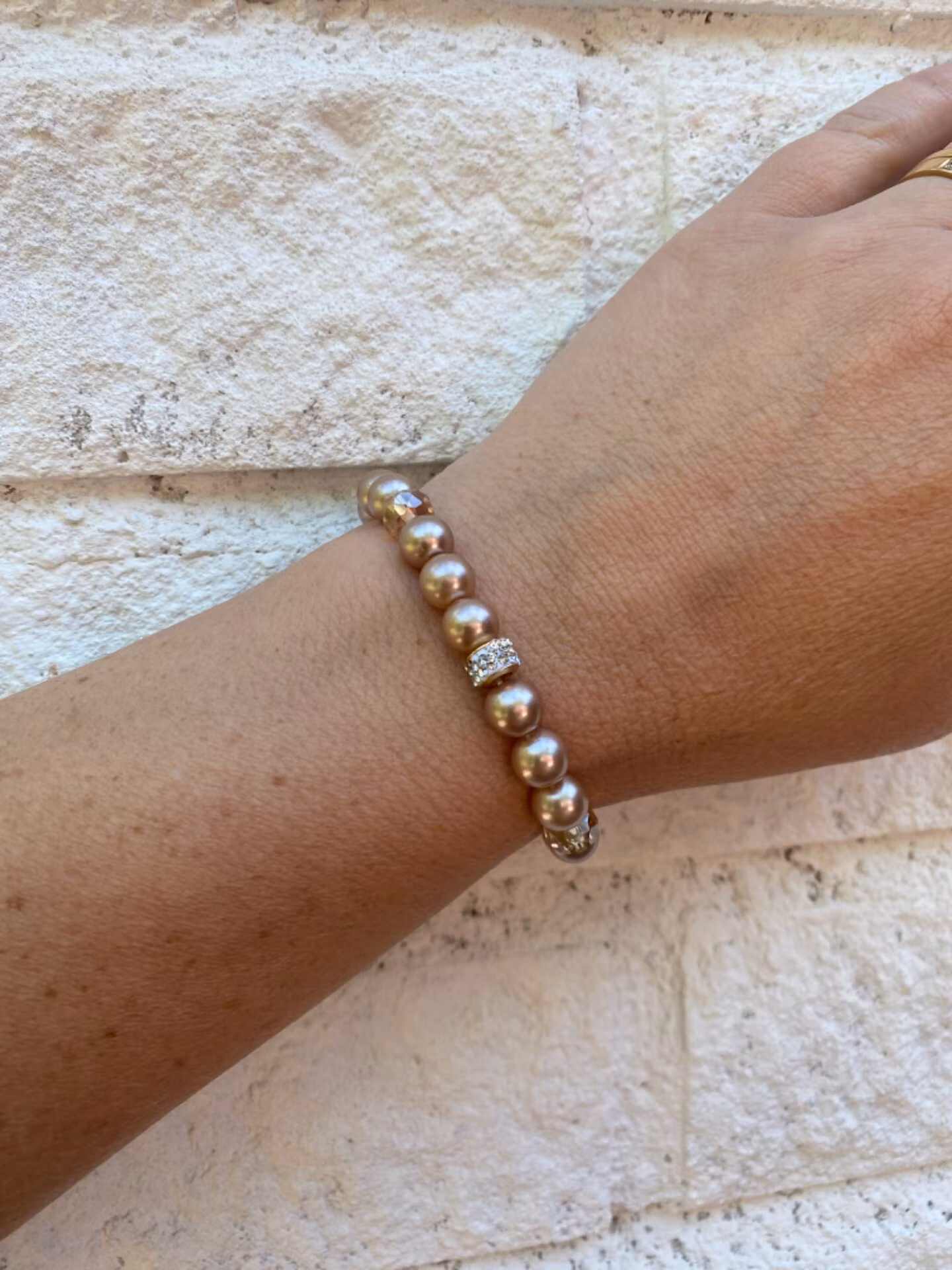 Armband i champagnefärgade pärlor med glaspärlor och strassdetaljPärlor 8mmVisas produkten "Tillfälligt slut" efter att du lagt den i din kundkorg, betyder det