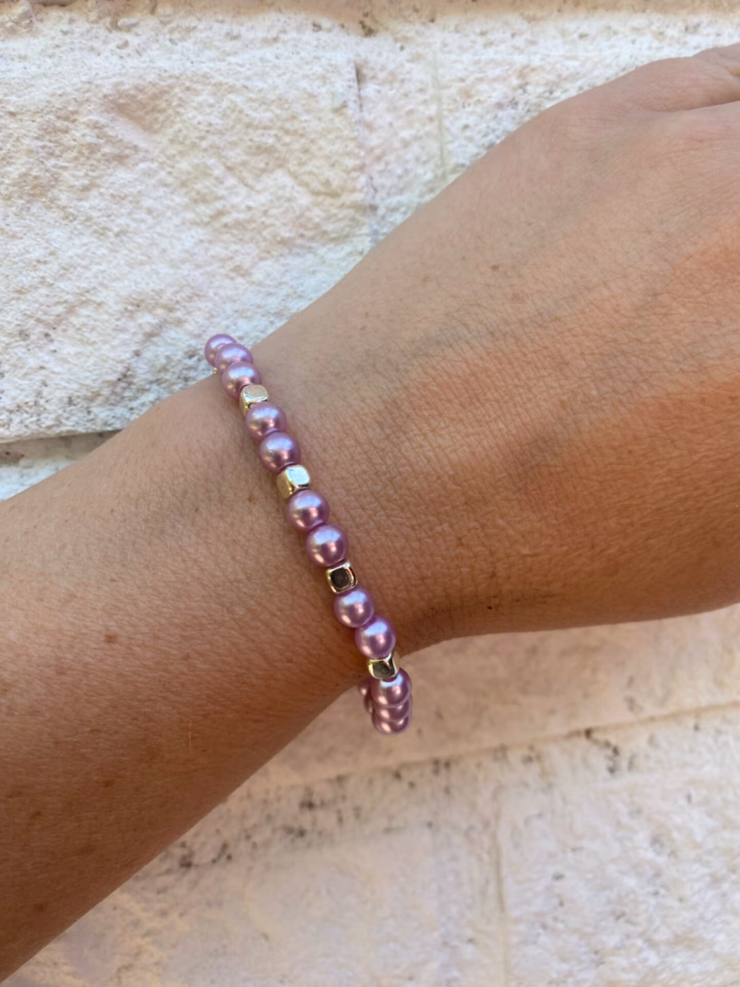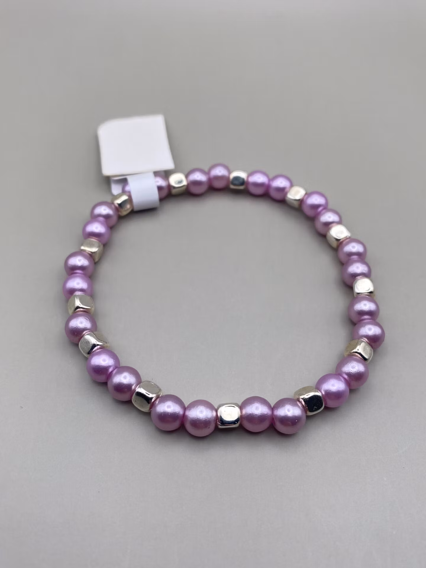 Armband av ljuslila pärlor varvat med silverfärgade fyrkantiga pärlor