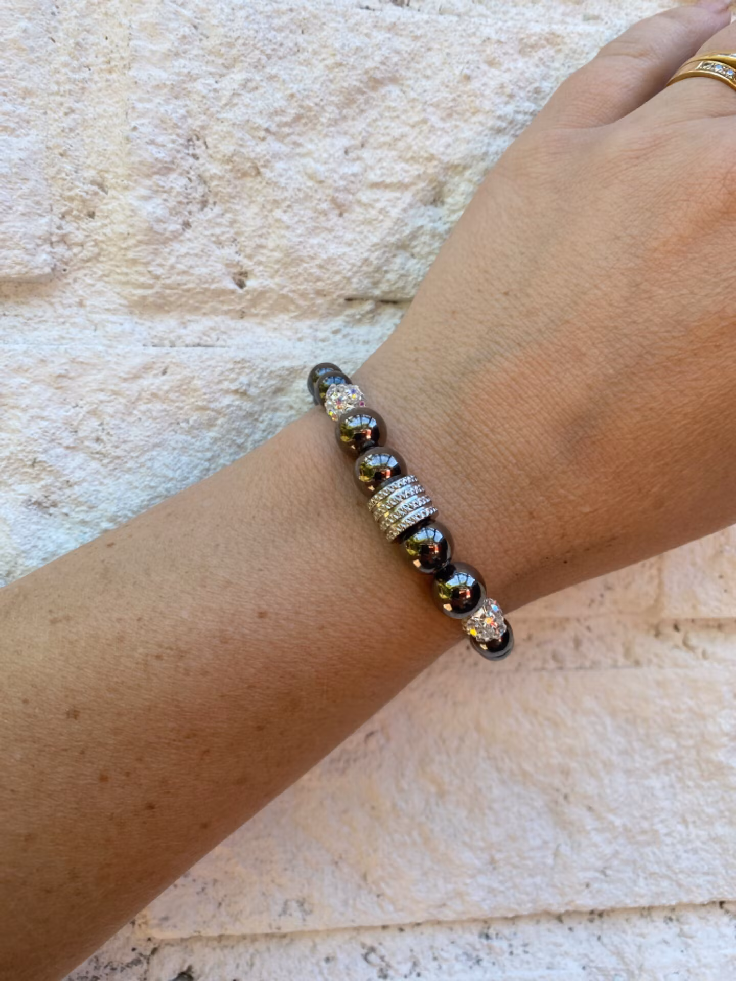 Armband i metallasvarta pärlor, aningens större i blickfånget och med mörkgrå silverfärgad detalj och glitterbollar.