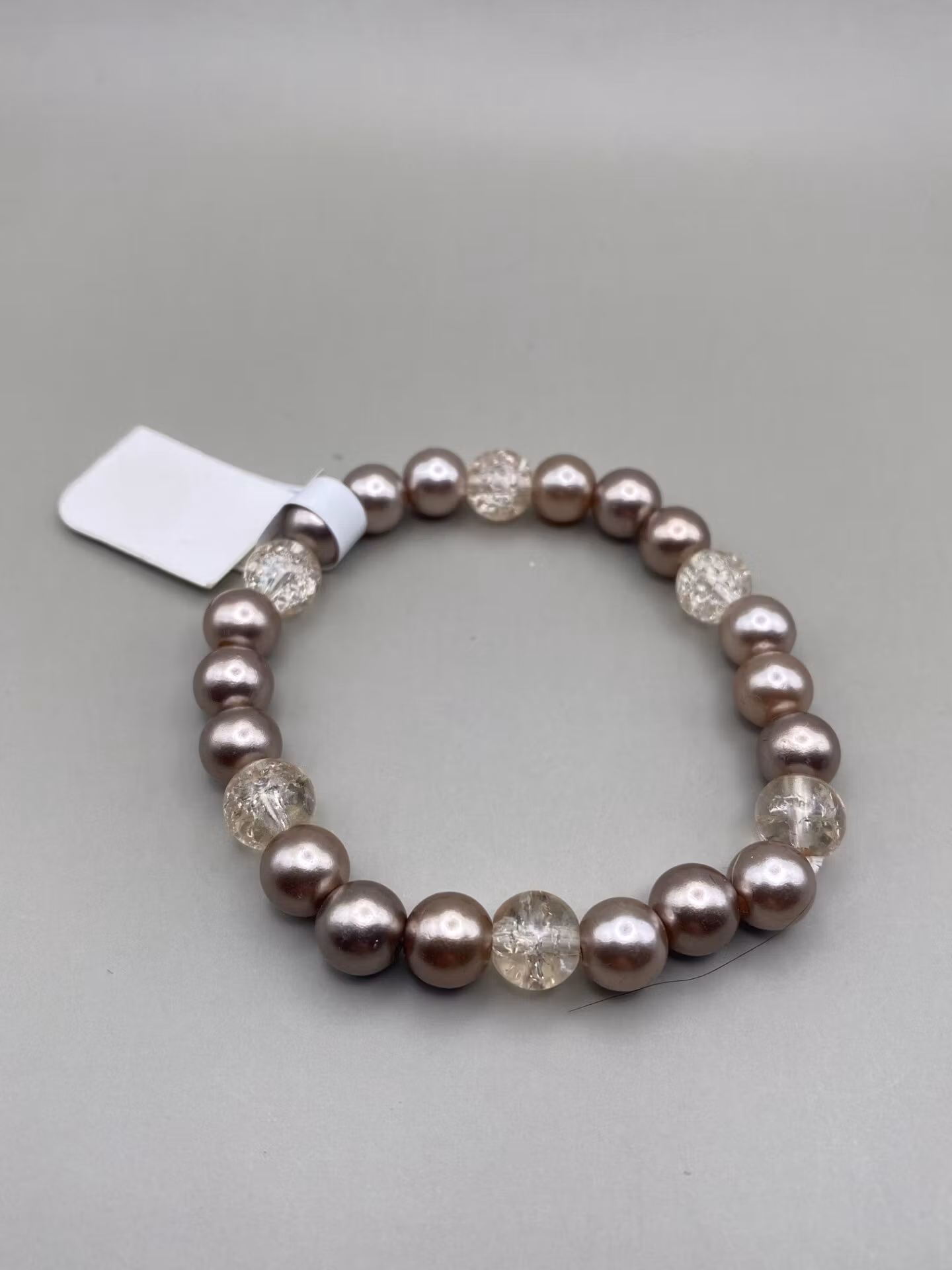 Armband i mellanstora champagnefärgade pärlor varvat med beiga glaspärlor med bubbligt mönster