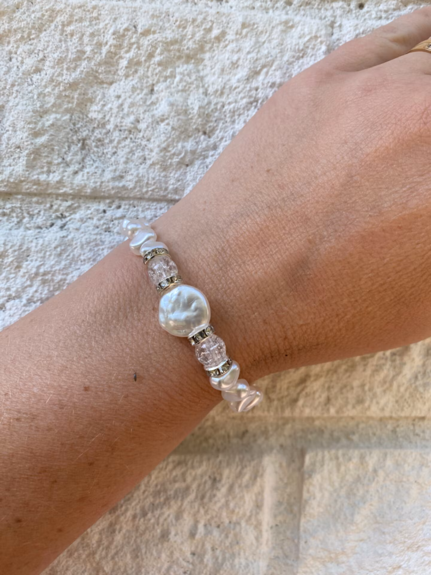 Armband i kritvita oregelbundna glansiga pälrlor, större platt pärla i blickfånget, med silverfärgade strassdetaljer och genomskinlig/vita glaspärlor
