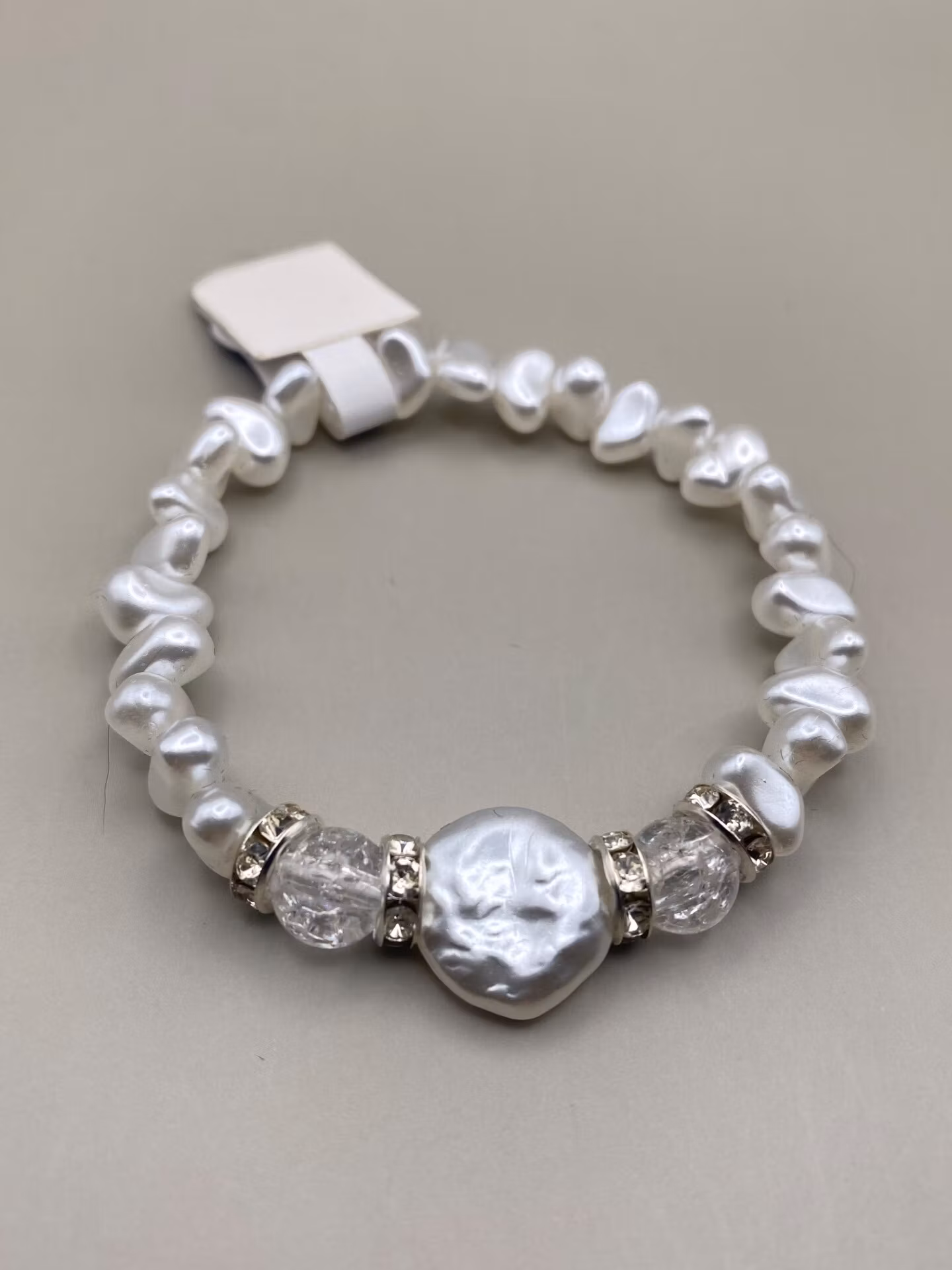 Armband i kritvita oregelbundna glansiga pälrlor, större platt pärla i blickfånget, med silverfärgade strassdetaljer och genomskinlig/vita glaspärlorFinns även