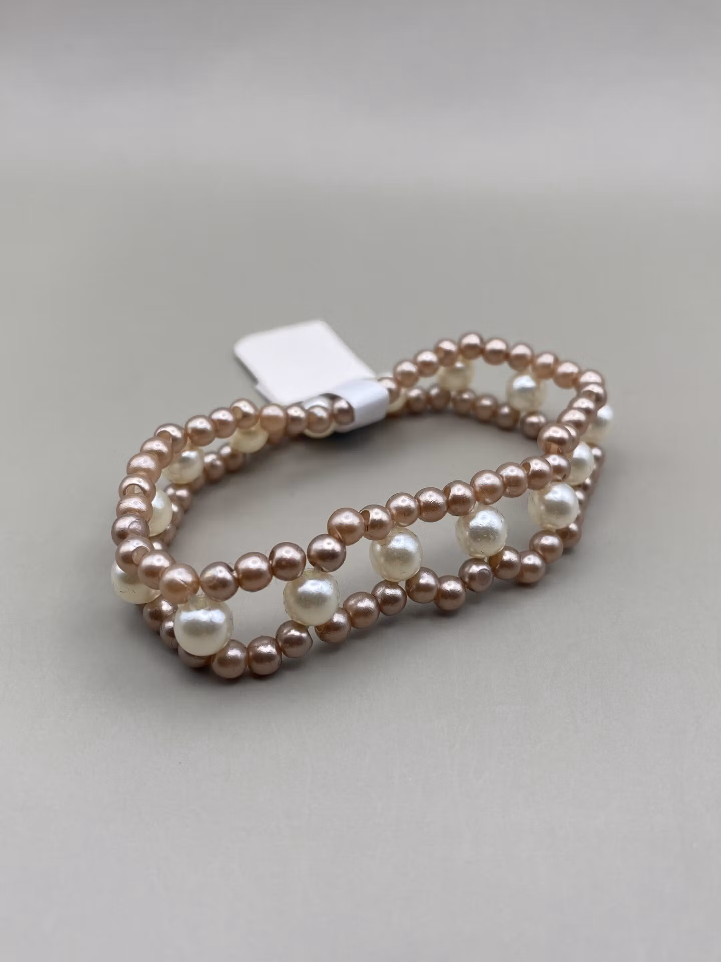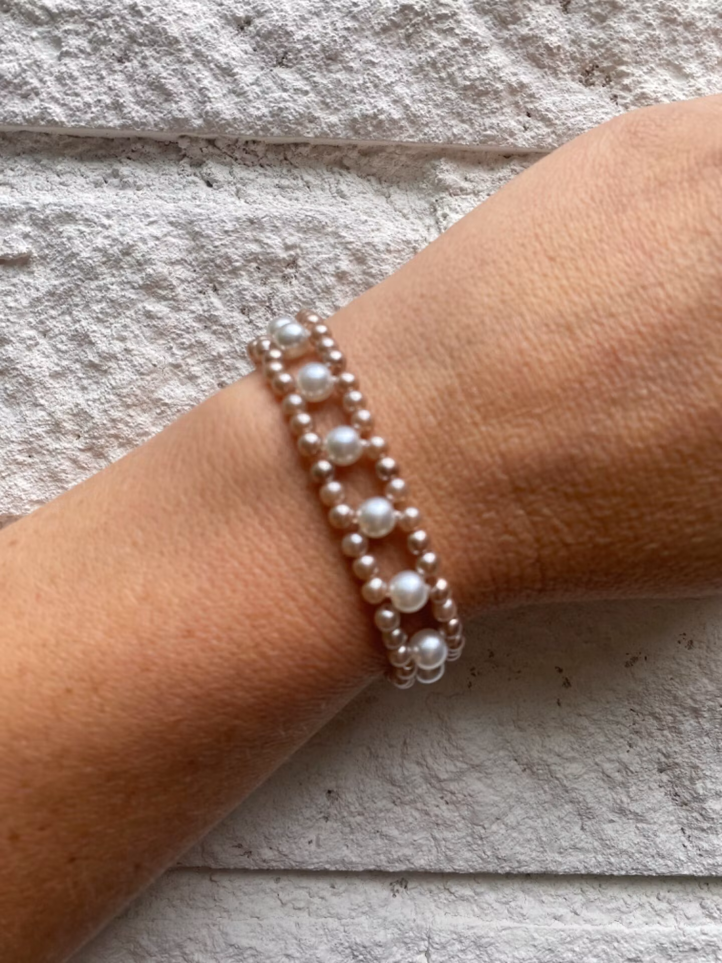 Armband i treradigt mönster av beige/champagnefärgade pärlor och vita aningen större pärlor i mittenraden