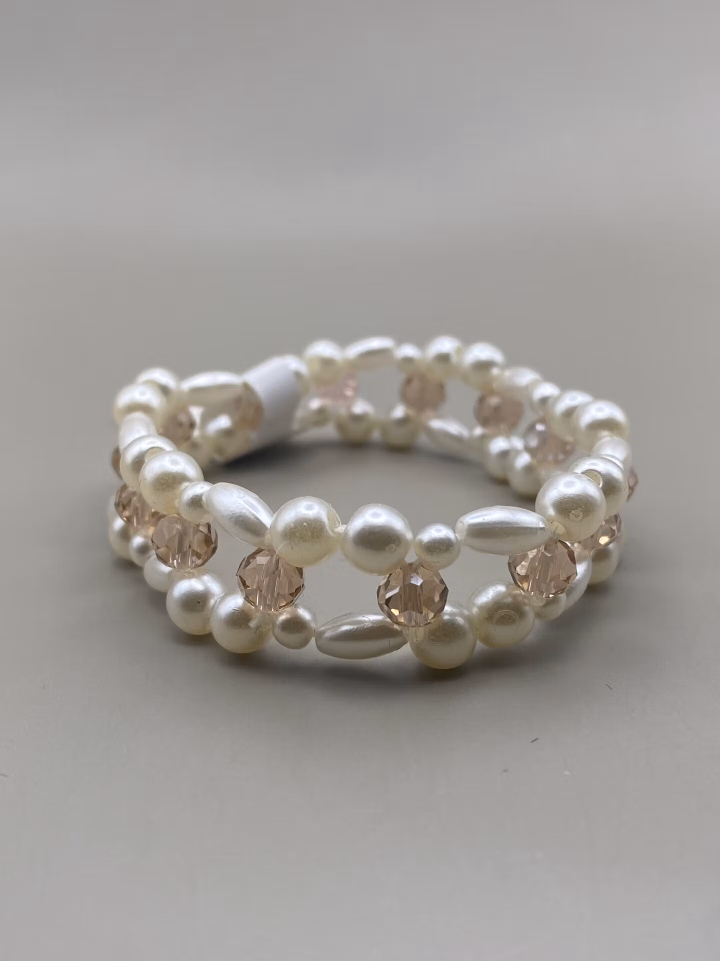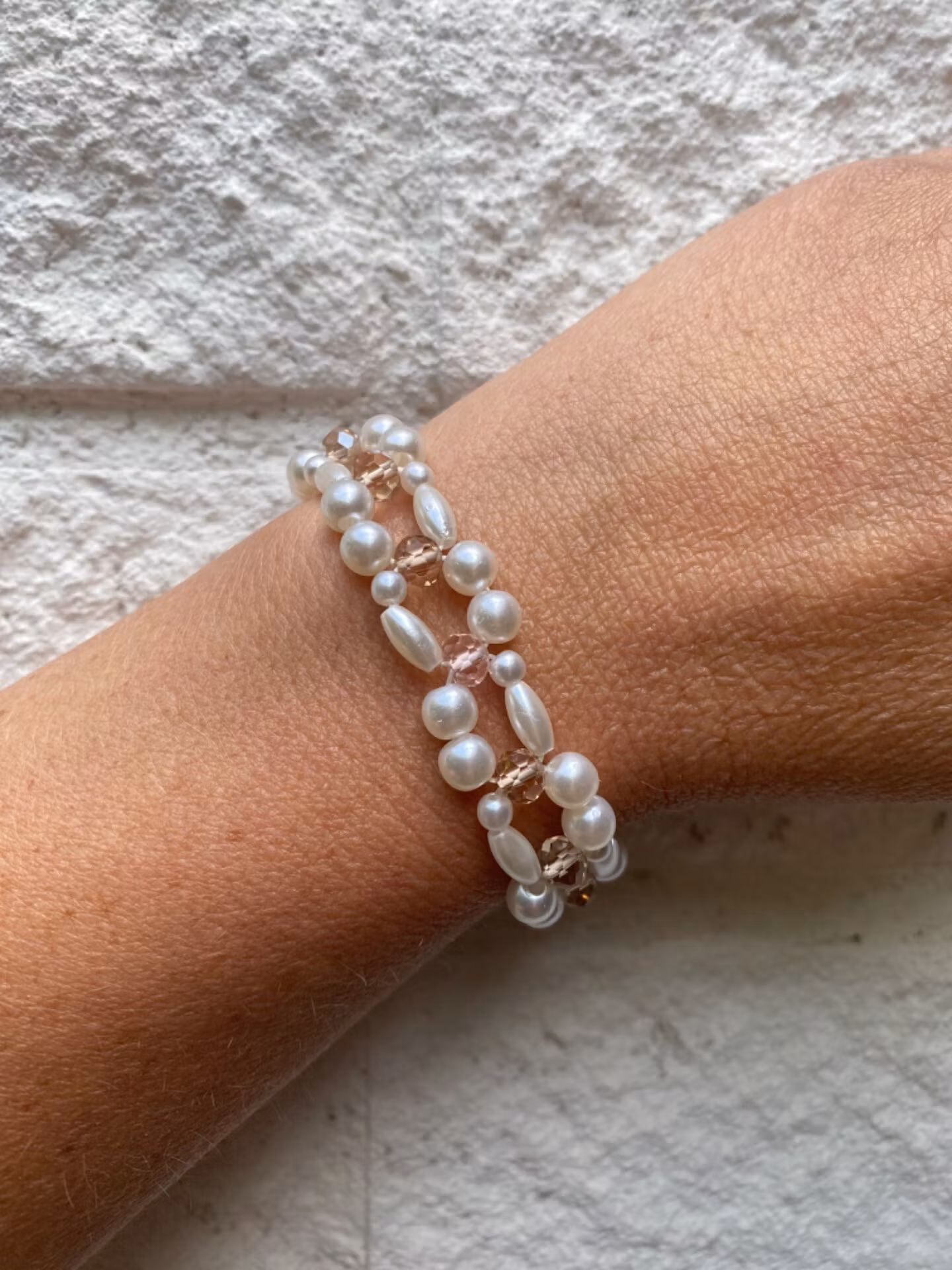 Armband i treradigt mönster av benvita olika pärlor varvat med champagnefärgade glaspärlor