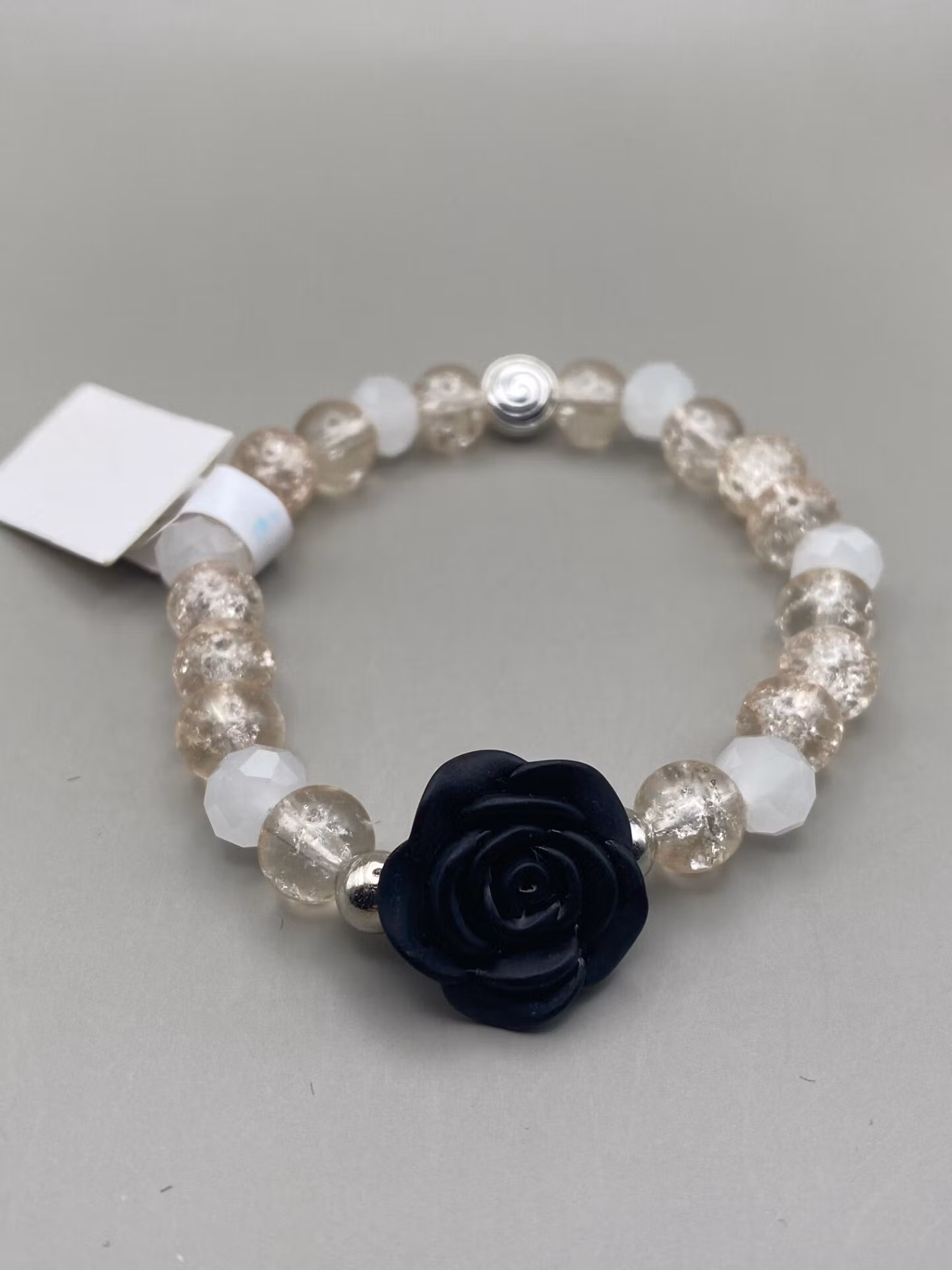 Armband i beiga mönstrade glaspärlor, varvat med frostade glaspärlor, silverfärgade pärlor samt stor svart ros i blickfånget