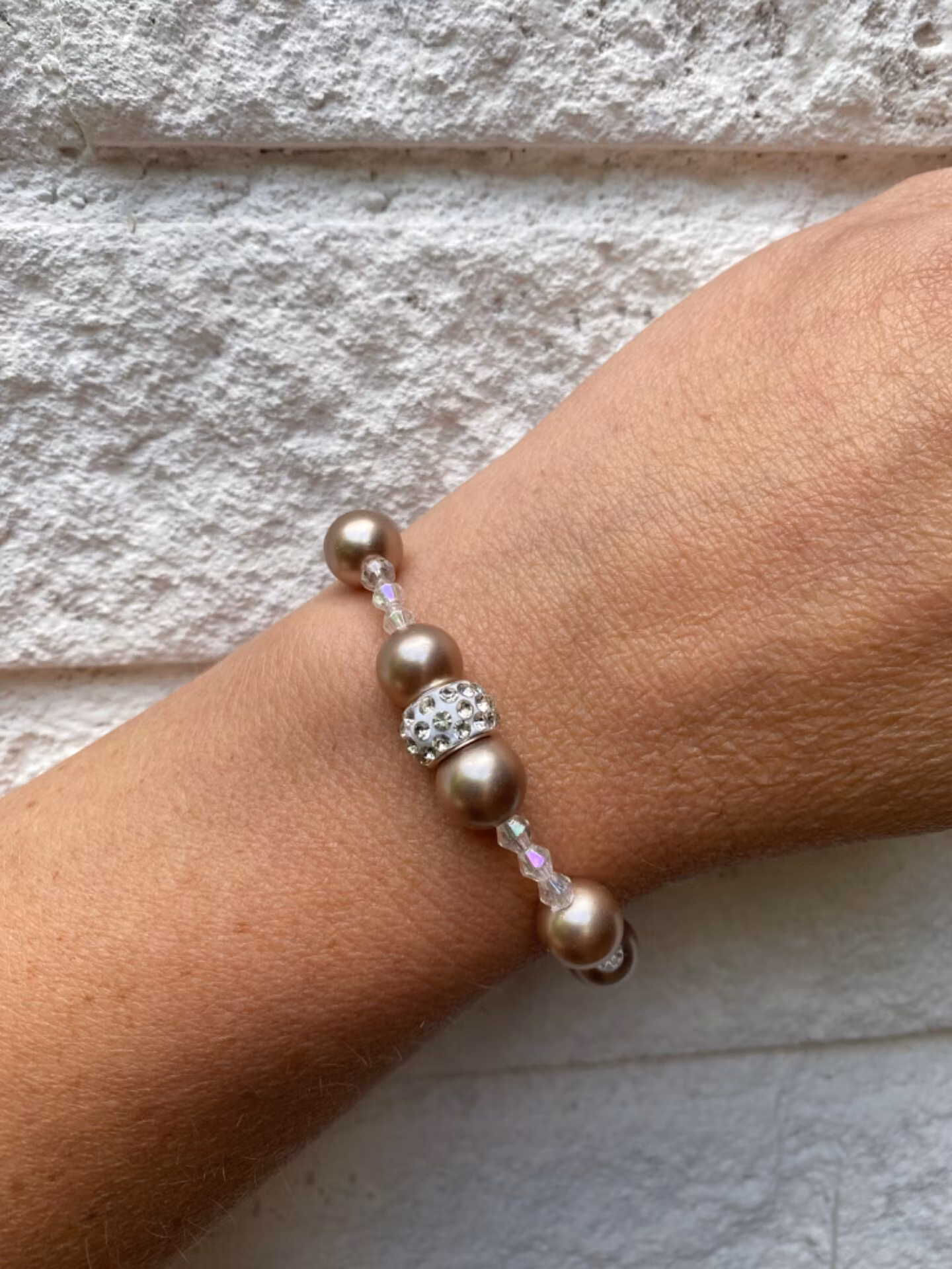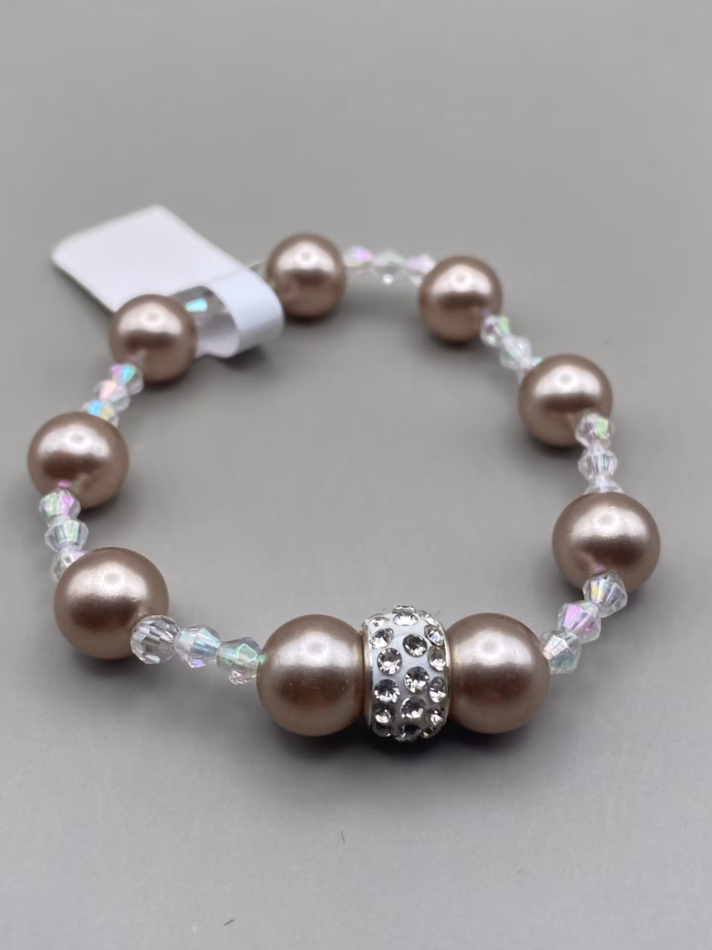 Armband i vita genomskinliga glaspärlor varvat med beiga större pärlor, stor strass detalj i blickfånget