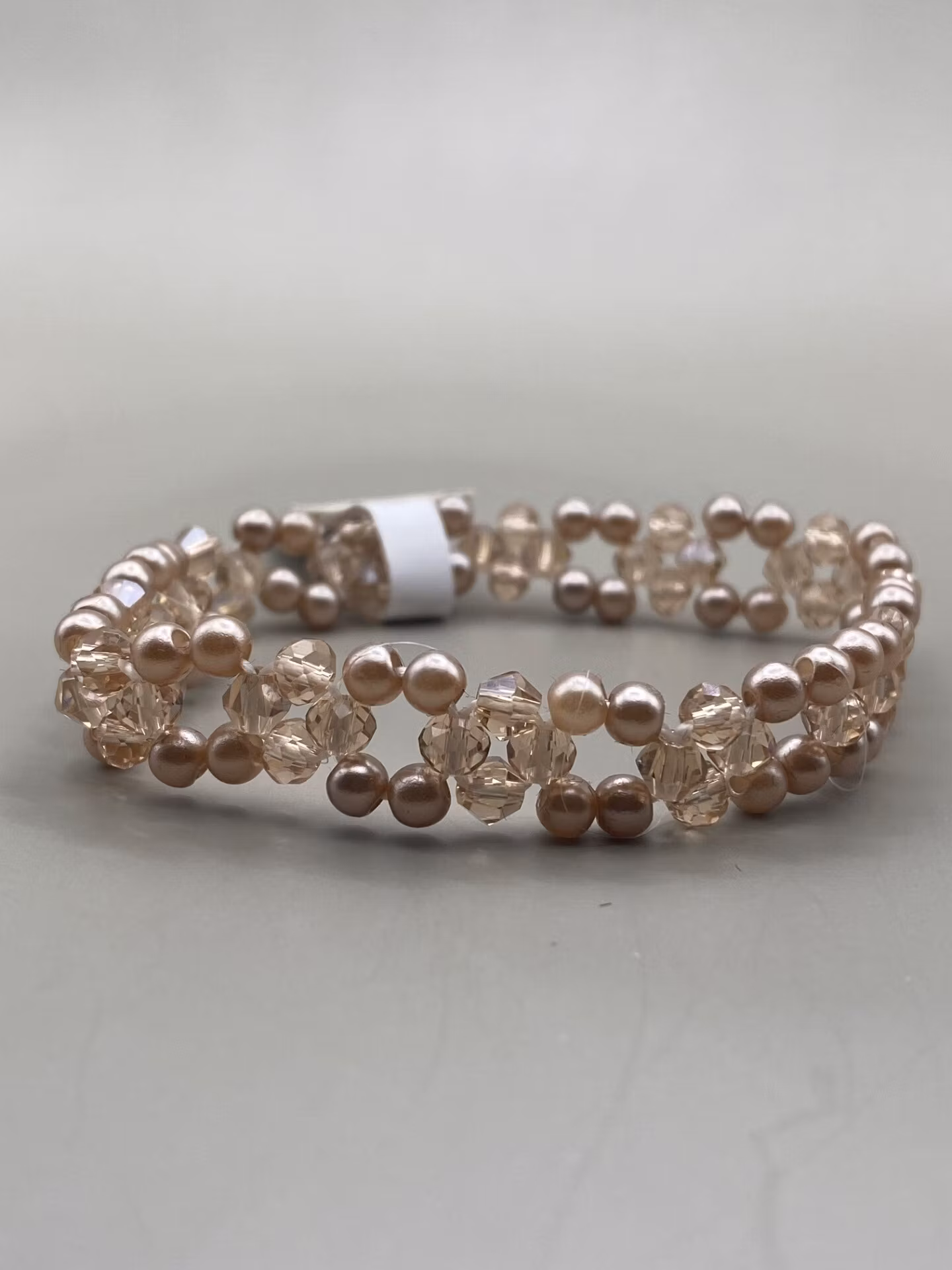 Armband i fint mönster av mindre beiga pärlor samt champagnefärgade glaspärlor
