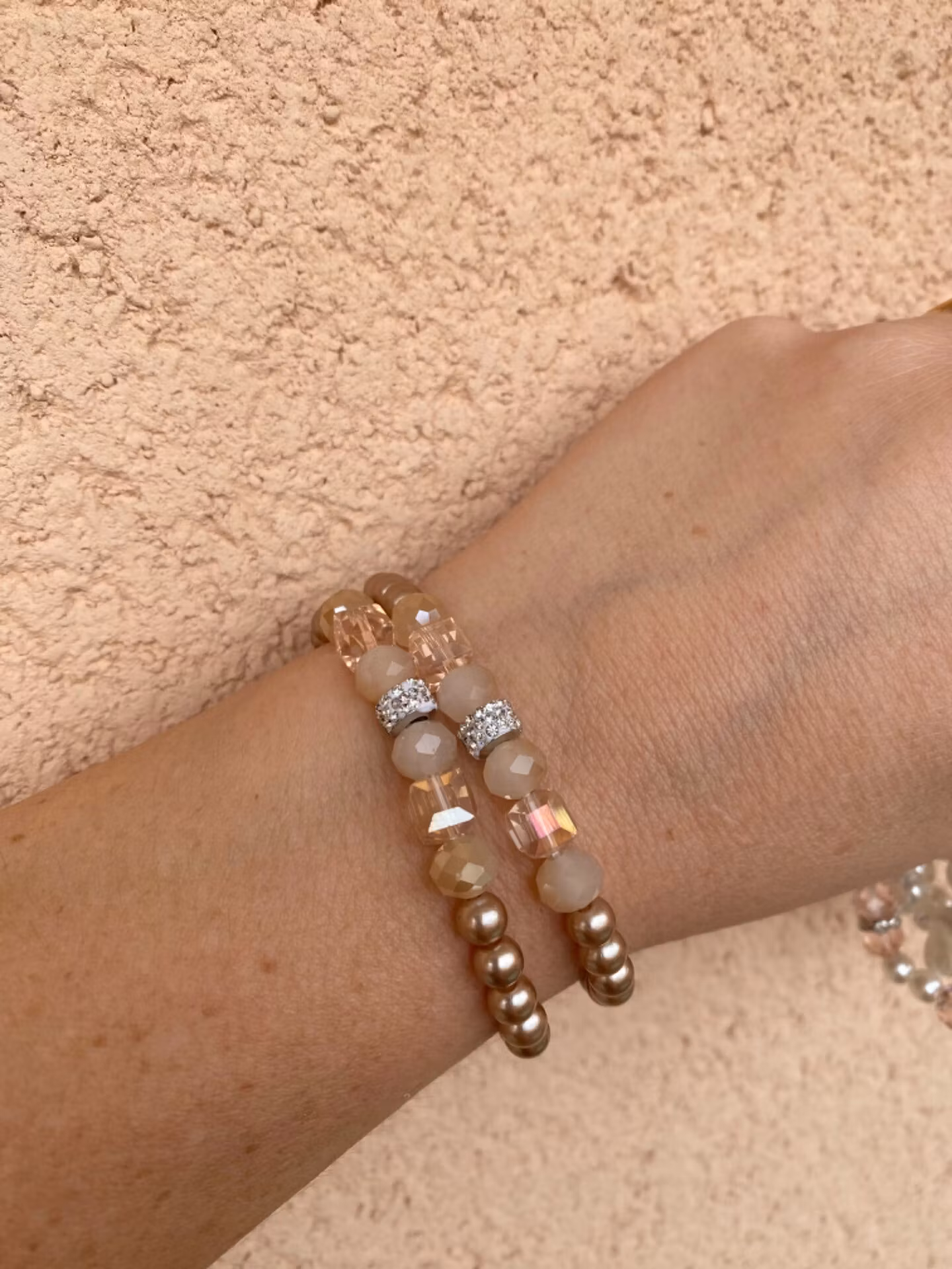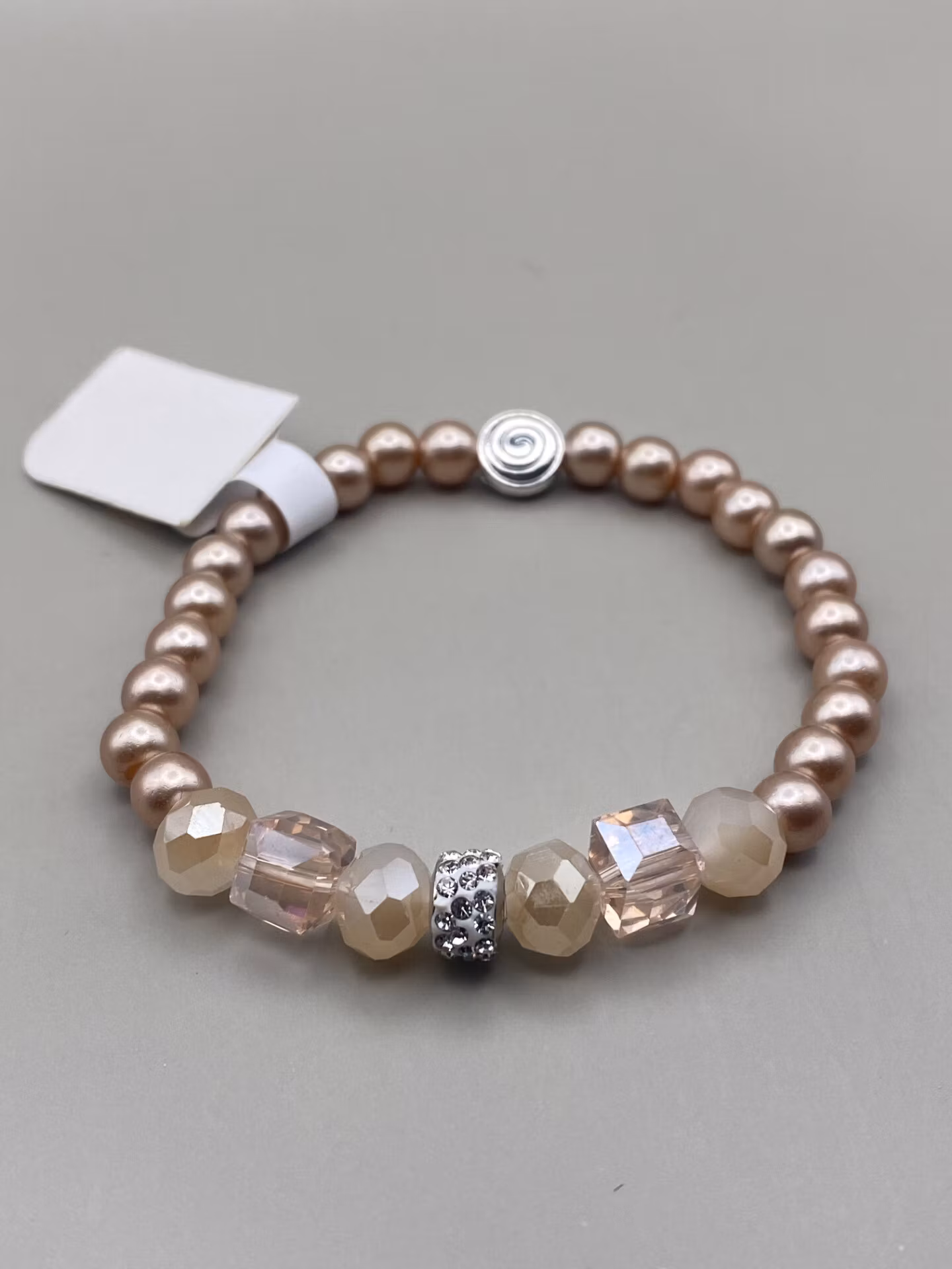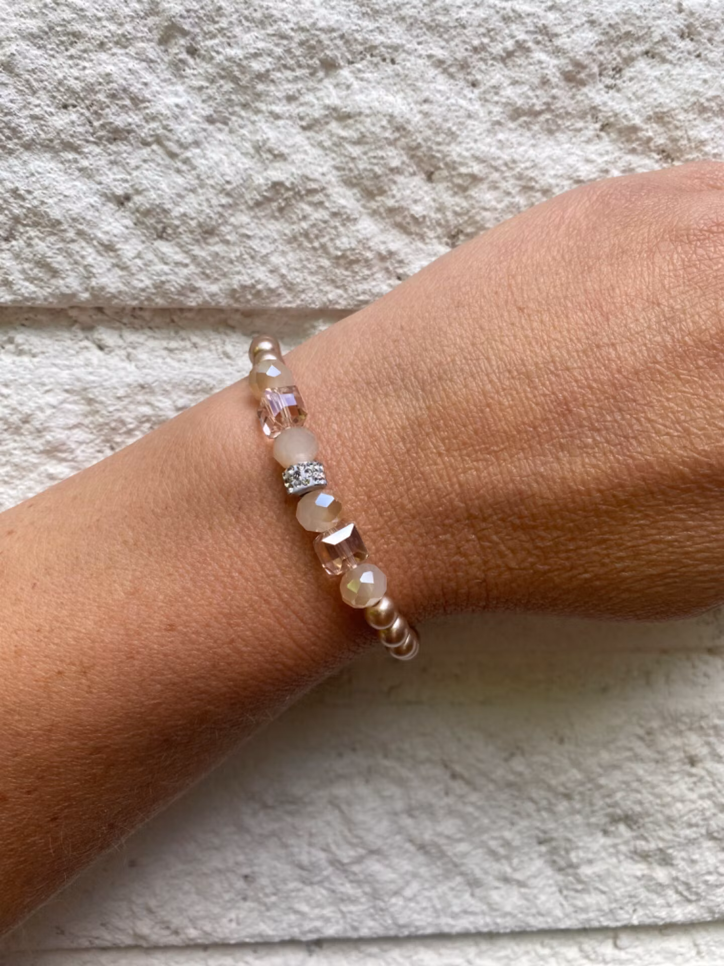Armband i champagnefärgade pärlor runt om, aprikosfärgade glaspärlor varvat med ljusrosa fyrkantiga glaspärlor samt strassdetalj i blickfånget.