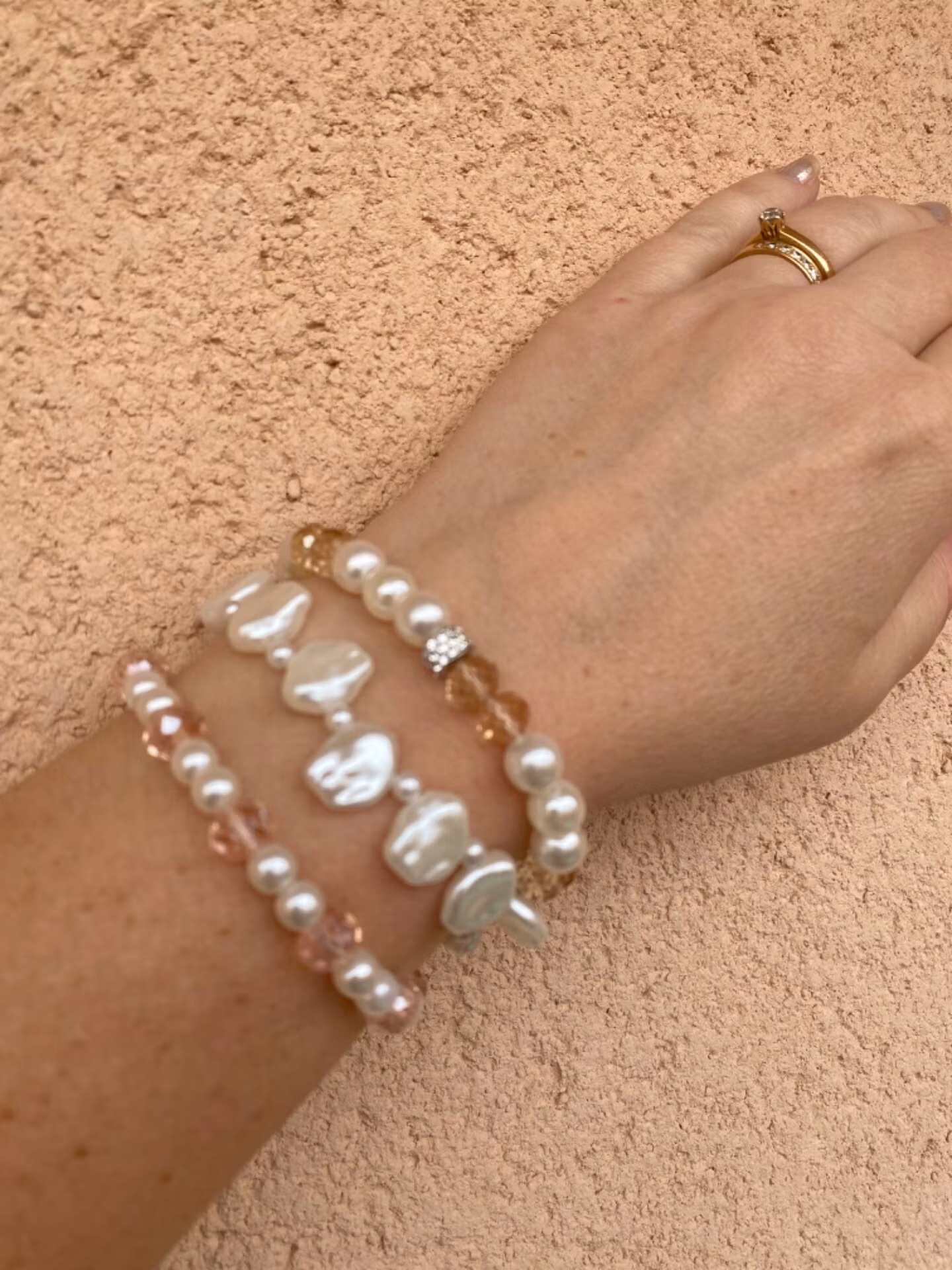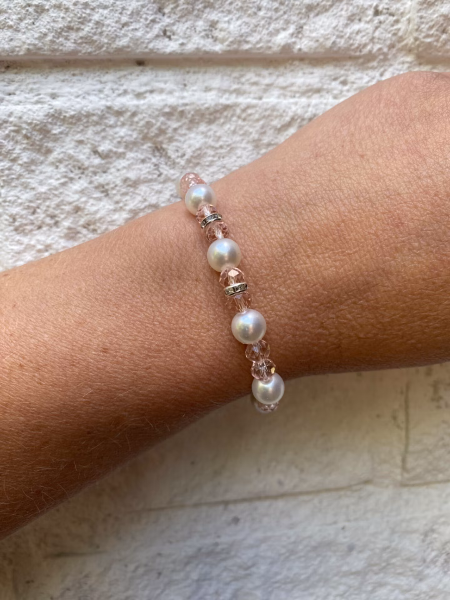 Armband i benvita pärlor varvat med ljusrosa glaspärlor, strassdetalj i blickfånget