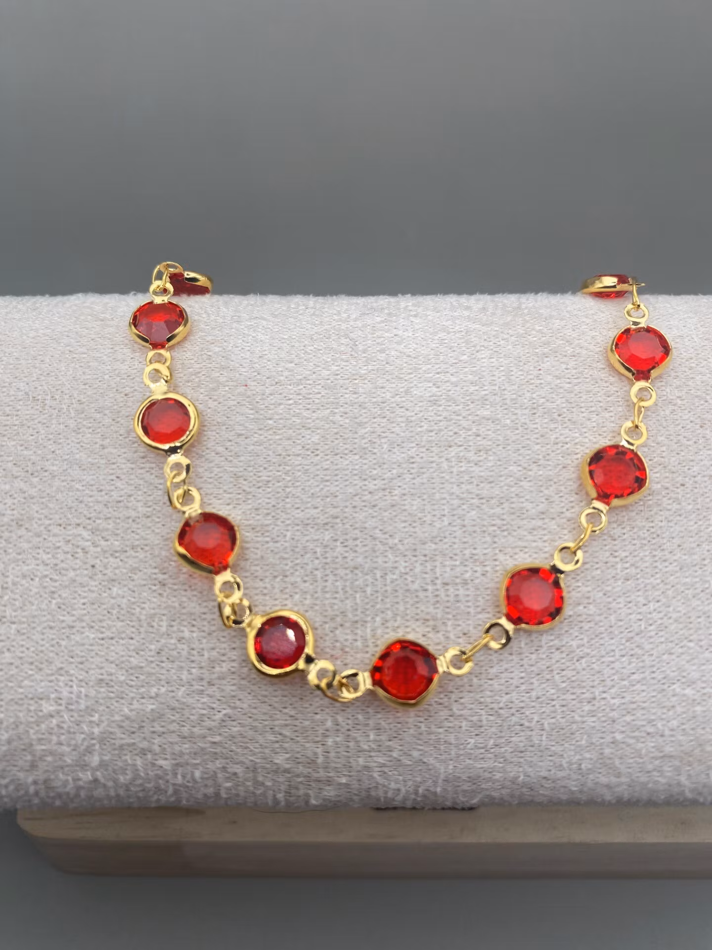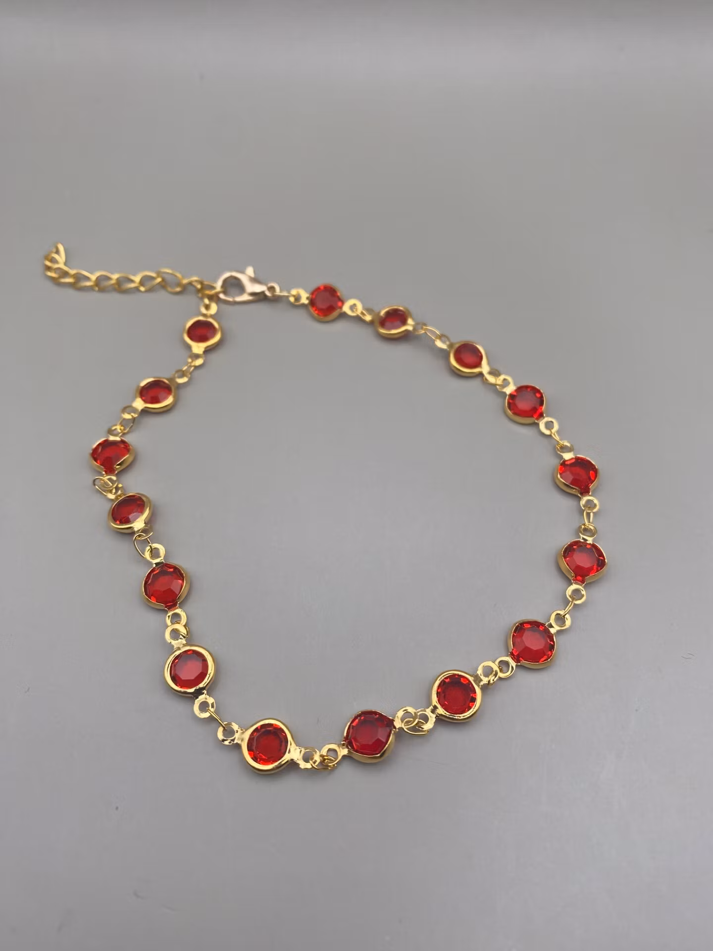 Snygg fotlänk i guldfärgad kedja med röda glas stenar