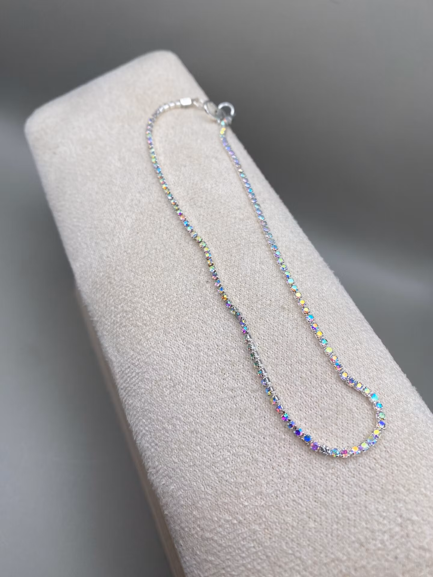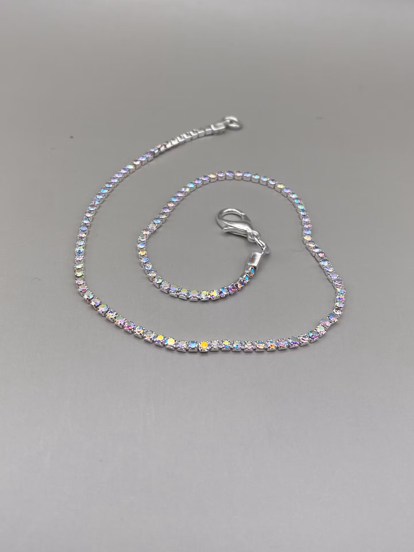 Vacker fotlänk i skimrande strass, silverfärgad strass som skimrar svagt i olika färger.Beställ i din storlek (måtta din fotled och välj den cm-storlek som är c