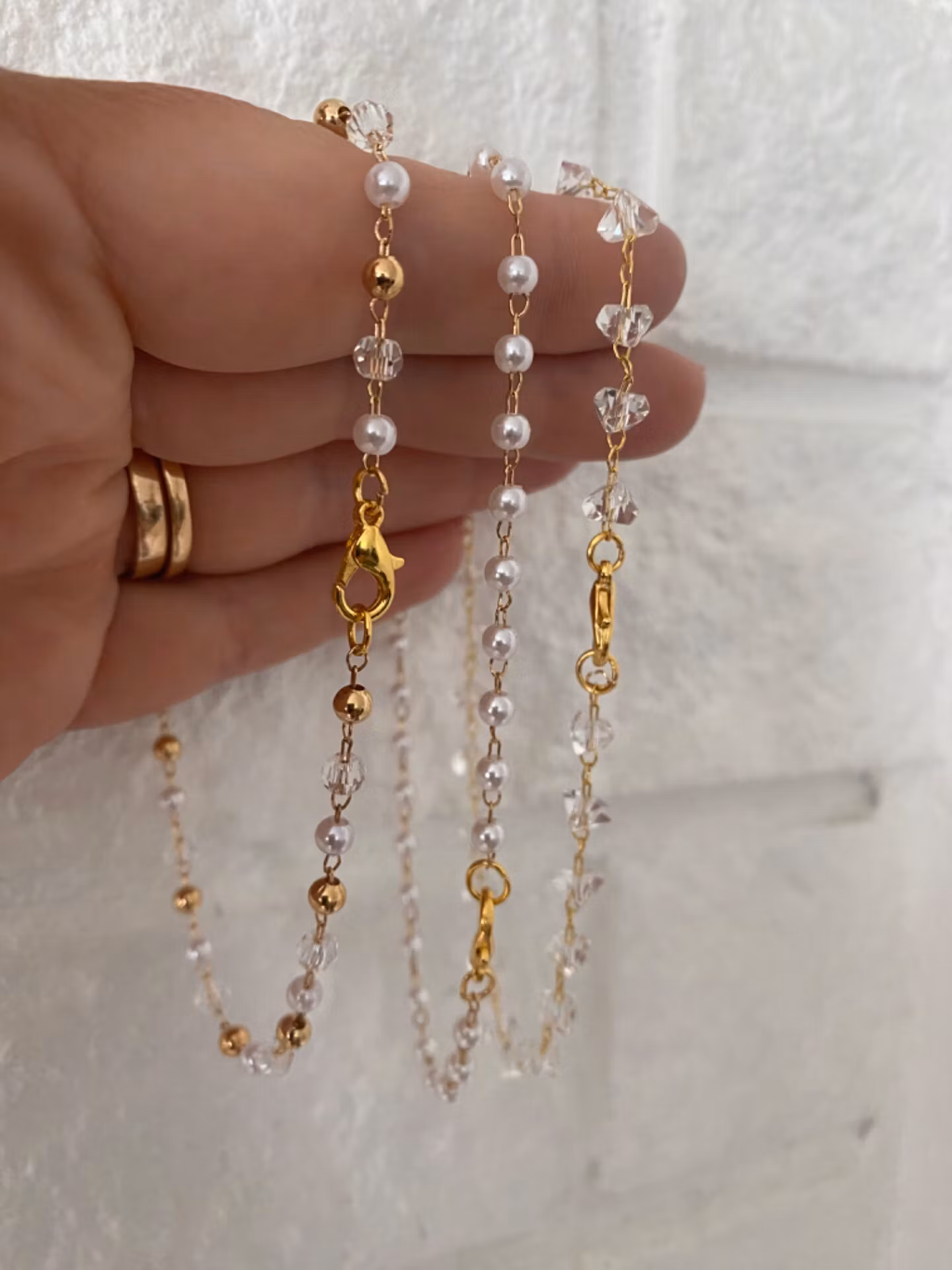 Snygg fotlänk i guldfärgad kedja och genomskinliga pärlor.