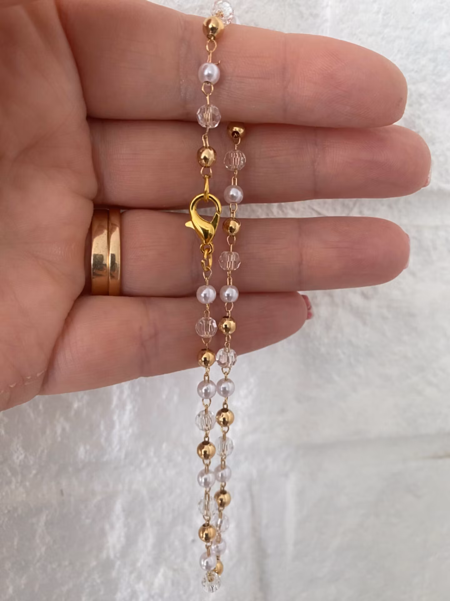 Snygg fotlänk i guldfärgad kedja och varvat små vita pärlor, guldfärgade pärlor wamt genomskinliga pärlor.Beställ i din storlek (måtta din fotled och välj den c