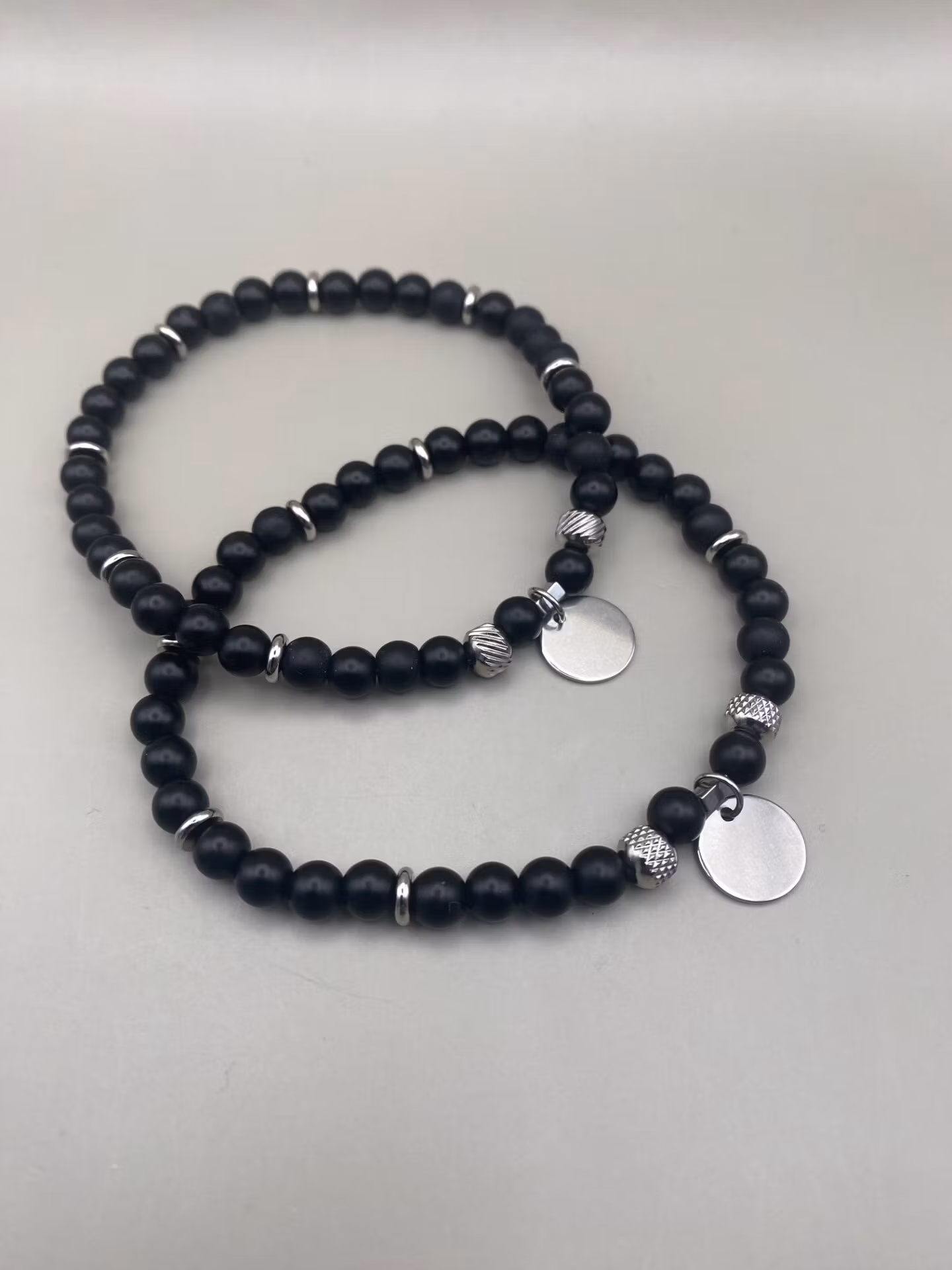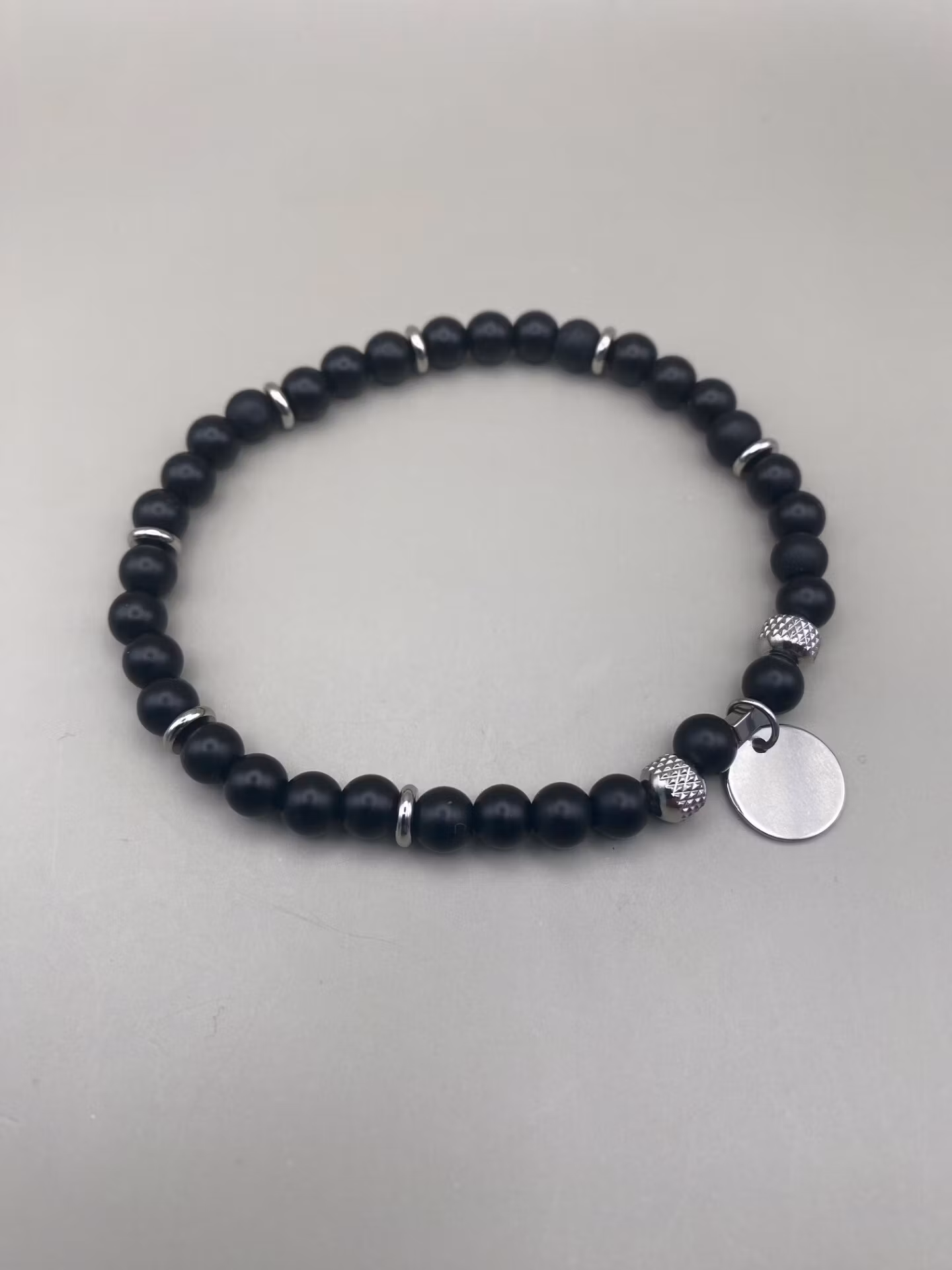 Stilrent armband i svarta mellanstora pärlor, distanser i silverfärgat rostfritt stål och stilren silverfärgad bricka som berlock i blickfånget i rostfritt stål