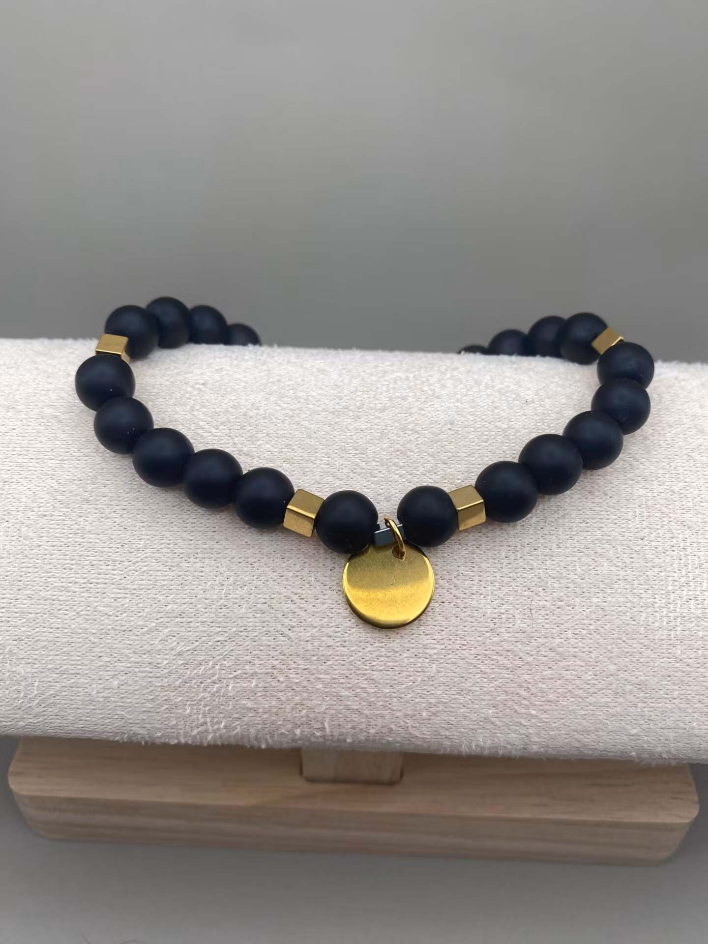 Stilrent armband i något matta svarta stora pärlor med tyngd varvat med fyrkantiga guldfärgade hematitpärlor och vacker guldfärgad bricka som berlock i blickfånget.