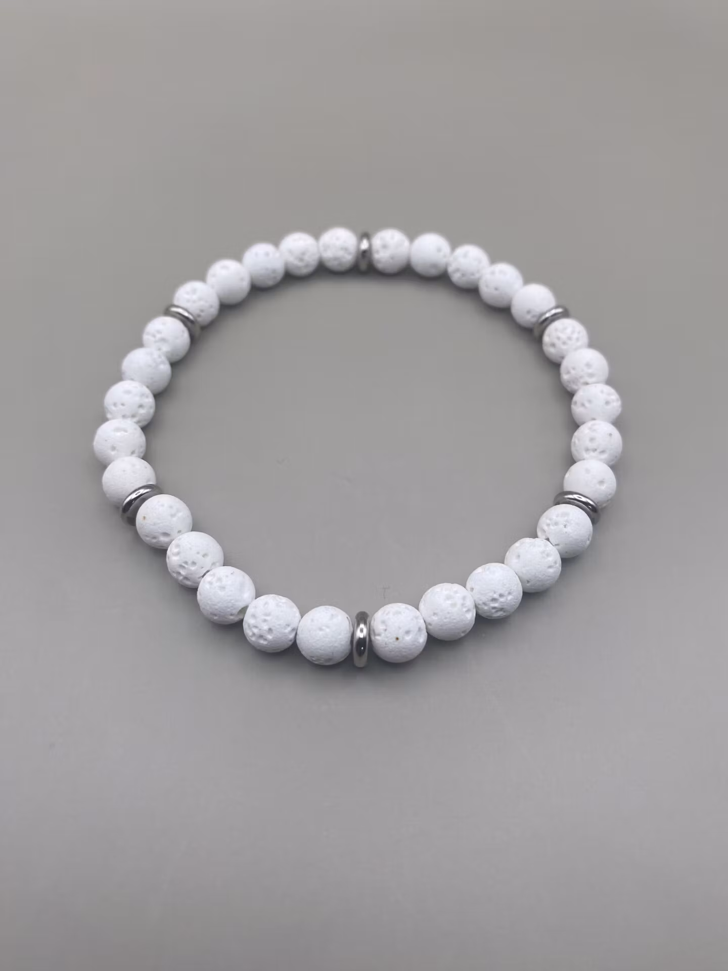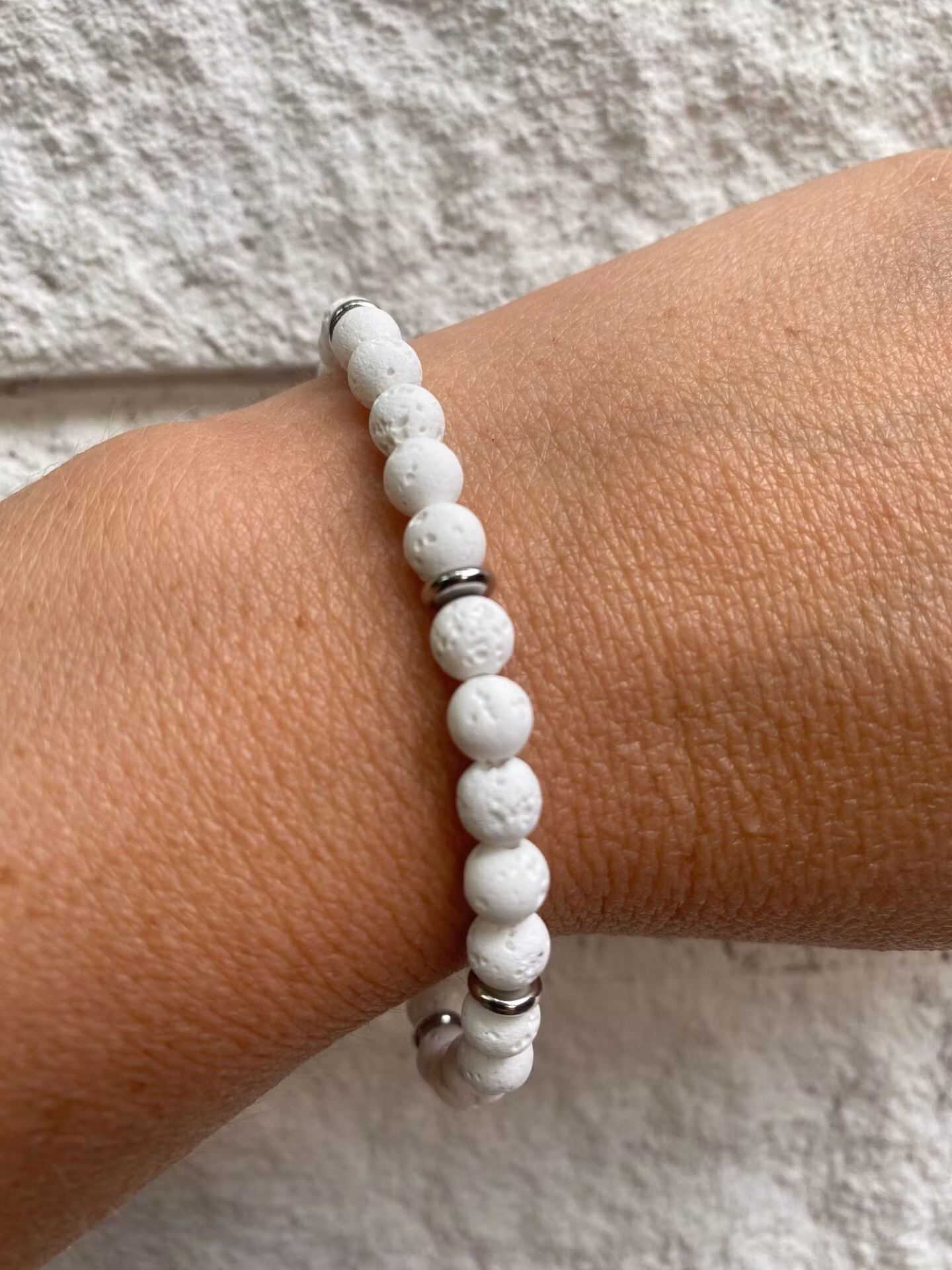 Lekfullt armband i vita hålmönstrade mellanstora stenpärlor med snygg detalj av varvade silverfärgade brickor i rostfritt stål.Pärlor 6mm*Visas produkten "Tillf
