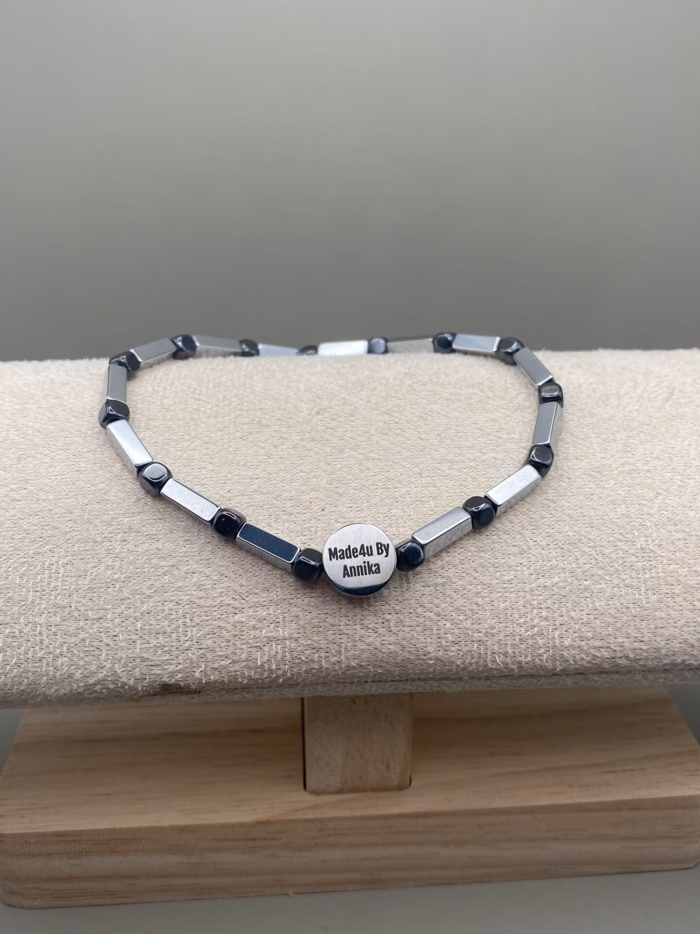 Stiligt armband med vackra rektangulära pärlor i rostfritt stål varvat med små fyrkantiga mörkgrå hematitpärlor och stor avsluts-signaturpärla i rostfritt stål.