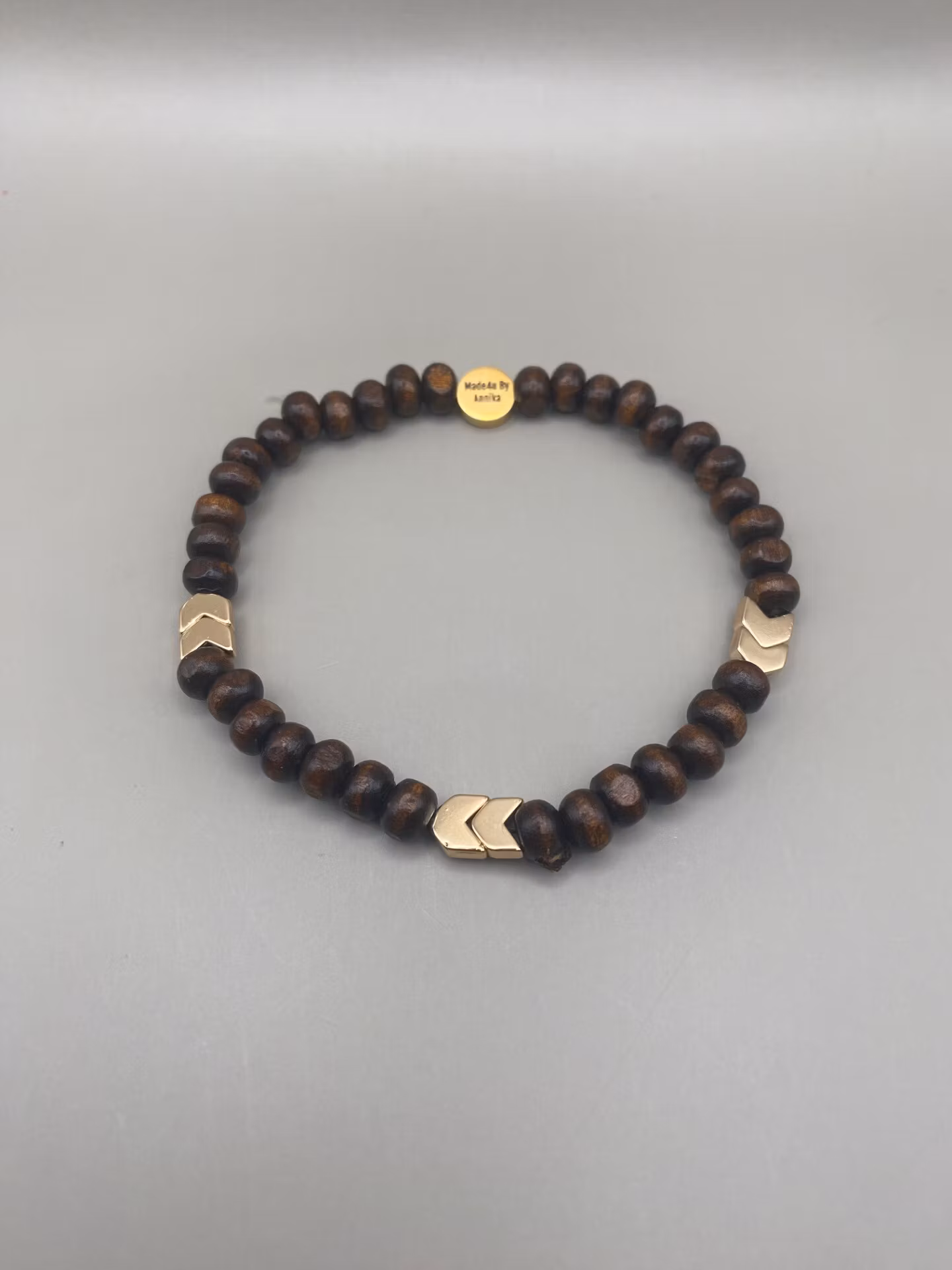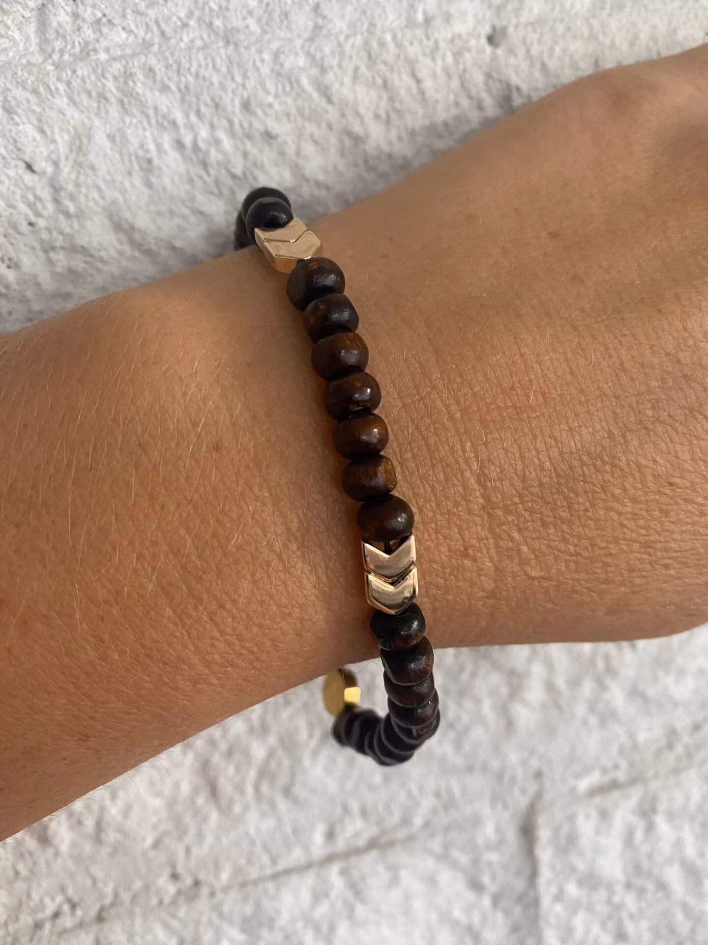 Stiligt armband med vackra brunmellerade träpärlor varvat med guldfärgade hematitpärlor med pilmönster och fin avslutspärla.Pärlor 6mmVisas produkten "Tillfälli