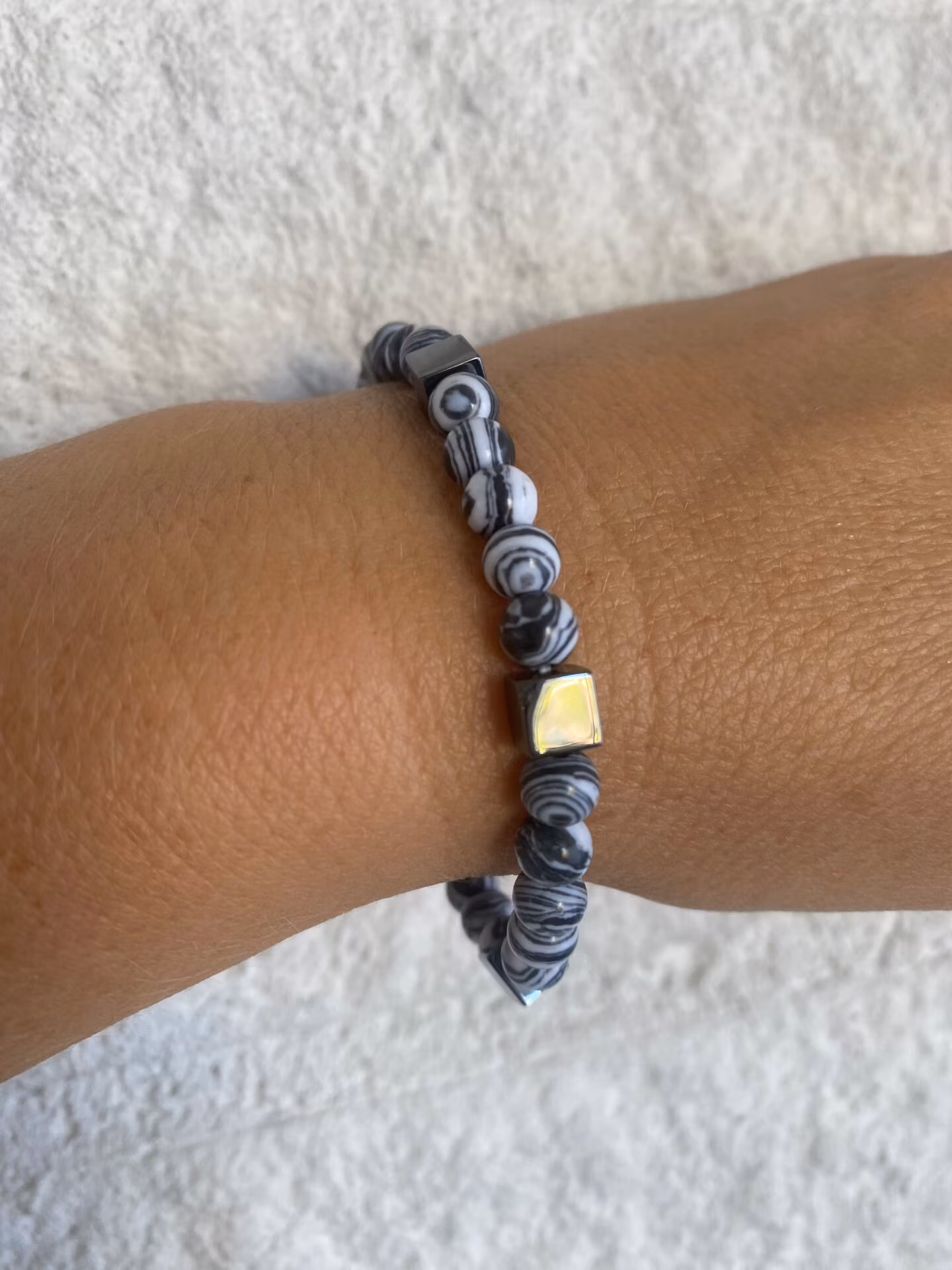 Stiligt armband med vackra svart-vit-gråmellerade pärlor varvat med stålgrå fyrkantigahematitpärlor med fin avslutspärla.