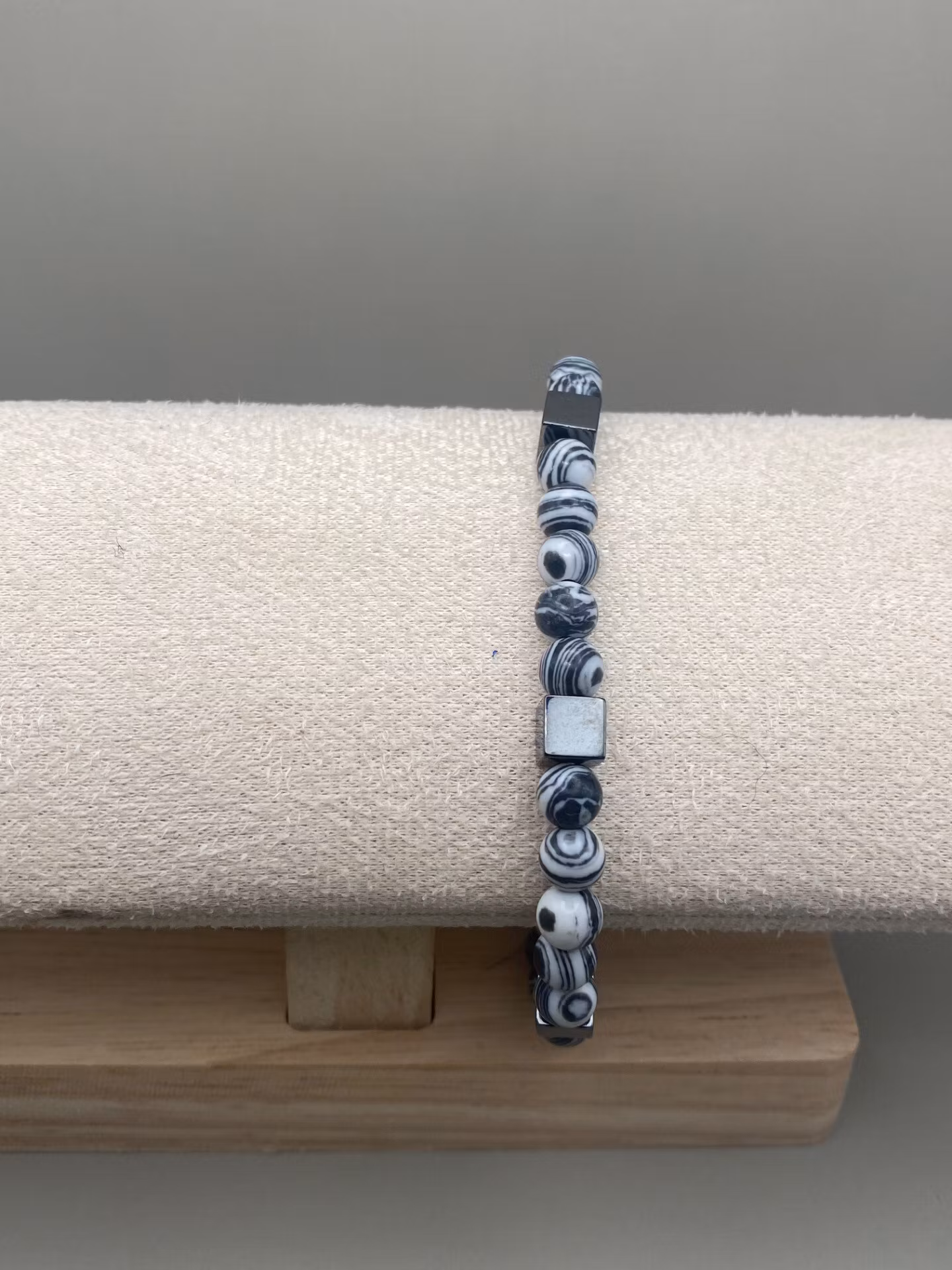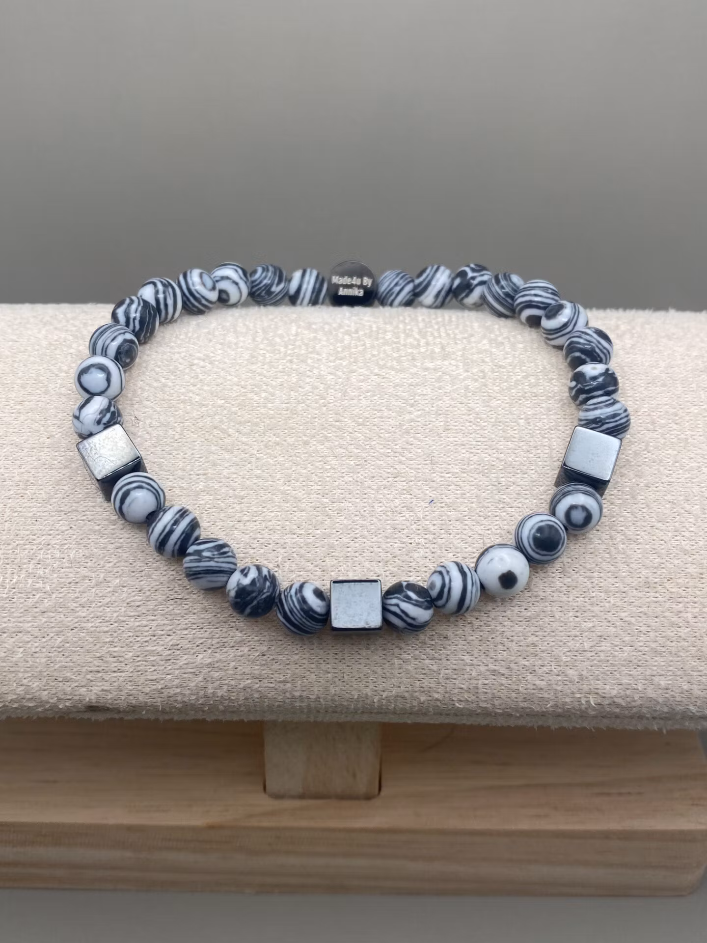 Stiligt armband med vackra svart-vit-gråmellerade pärlor varvat med stålgrå fyrkantigahematitpärlor med fin avslutspärla.Pärlor 6mmVisas produkten "Tillfälligt