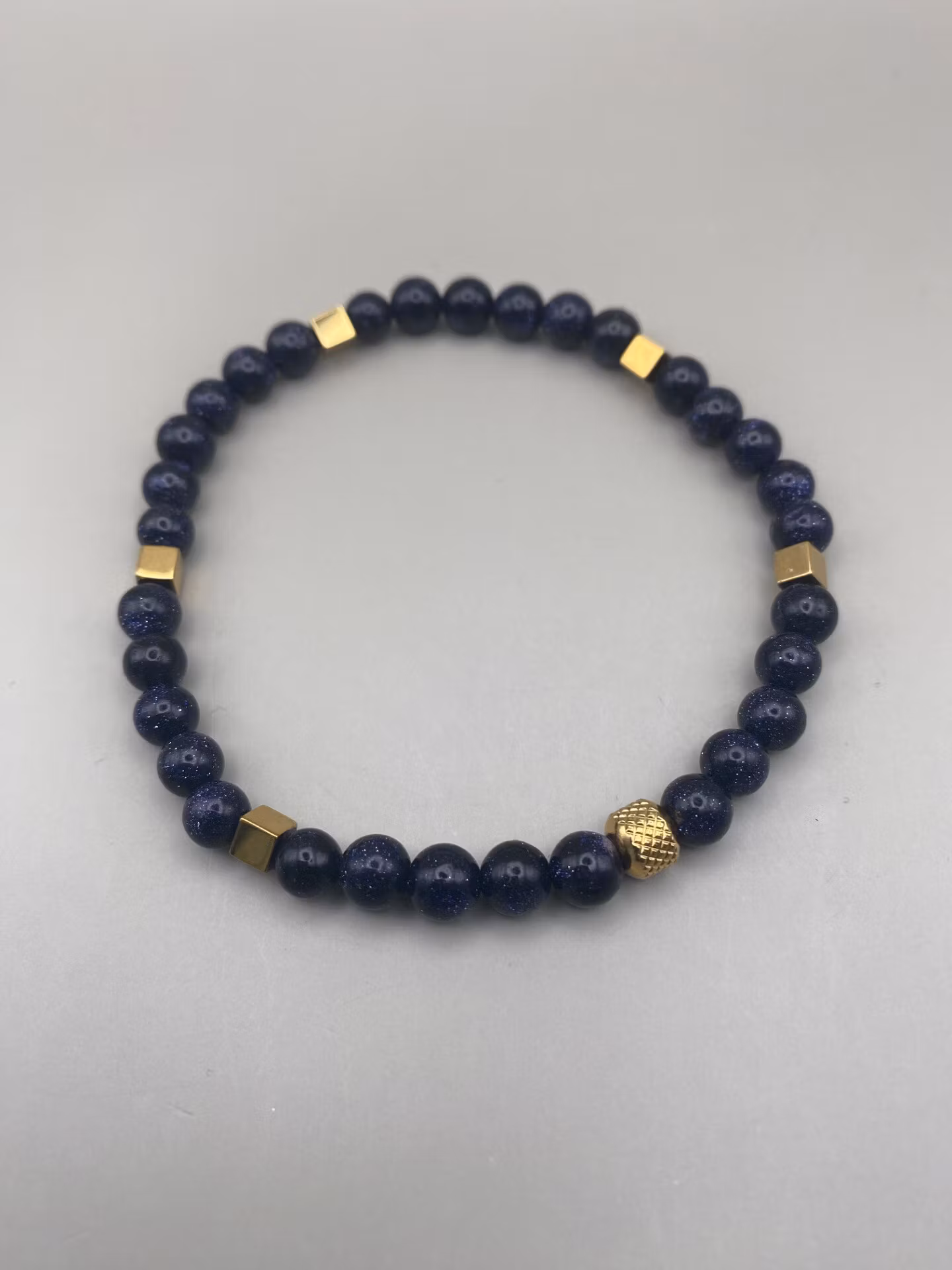 Stilrent armband i mörkt mörkblå mellanstora pärlor med lite tyngd och är aningen skimrande, guldfärgade fyrkantiga hematit pälror och stilren mönstrad pärla i