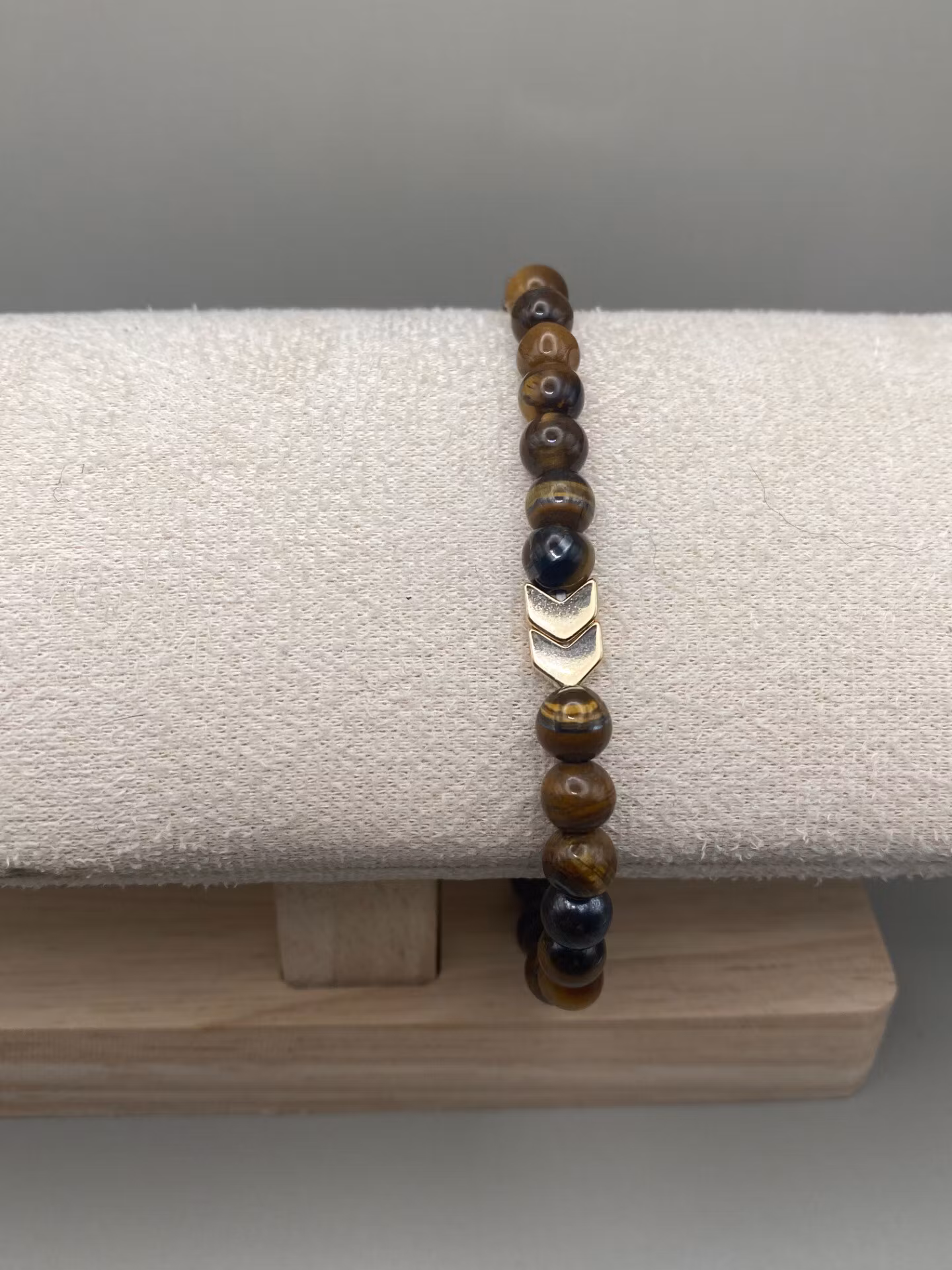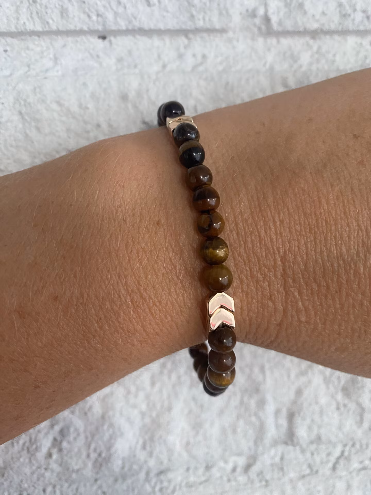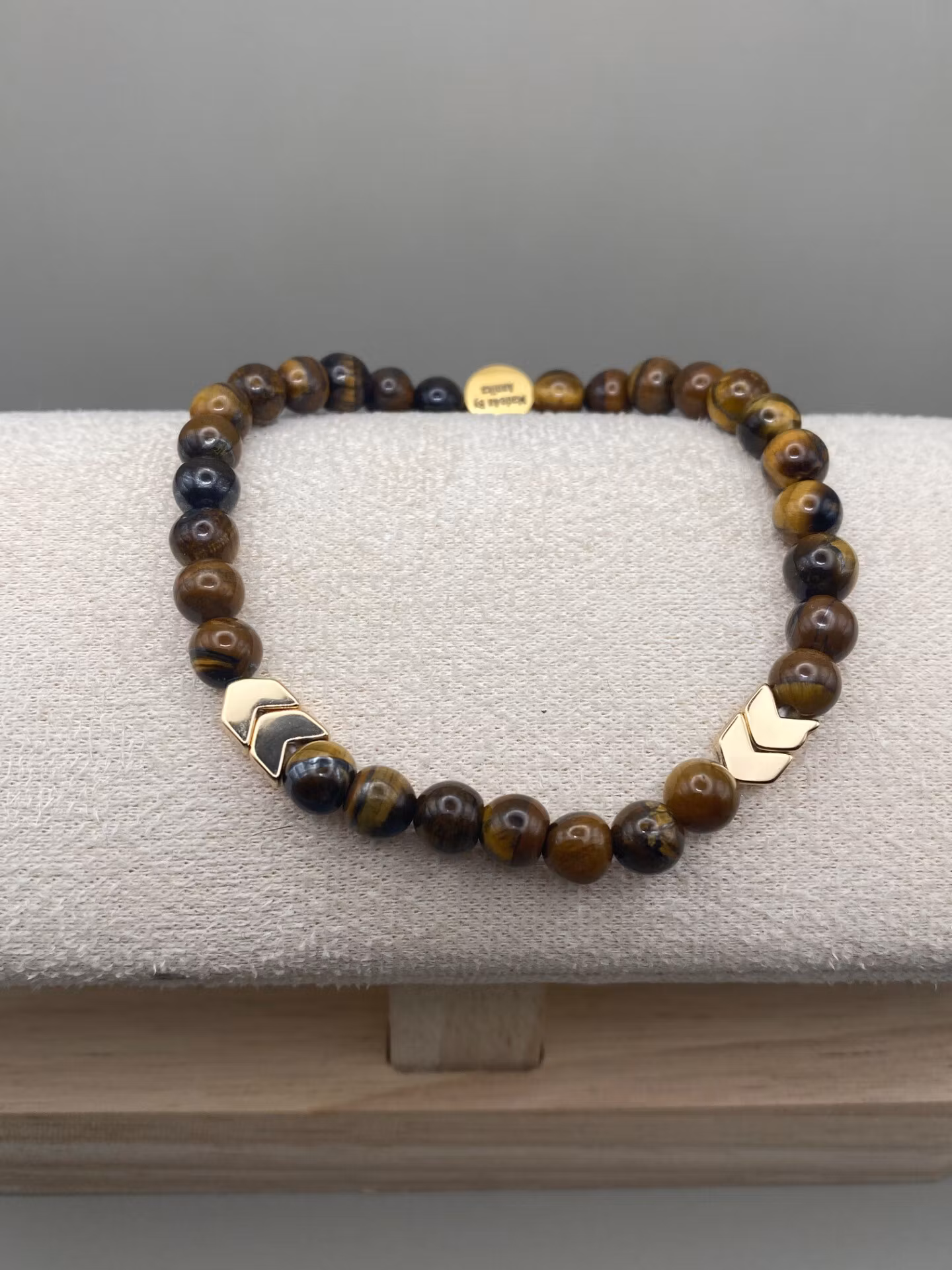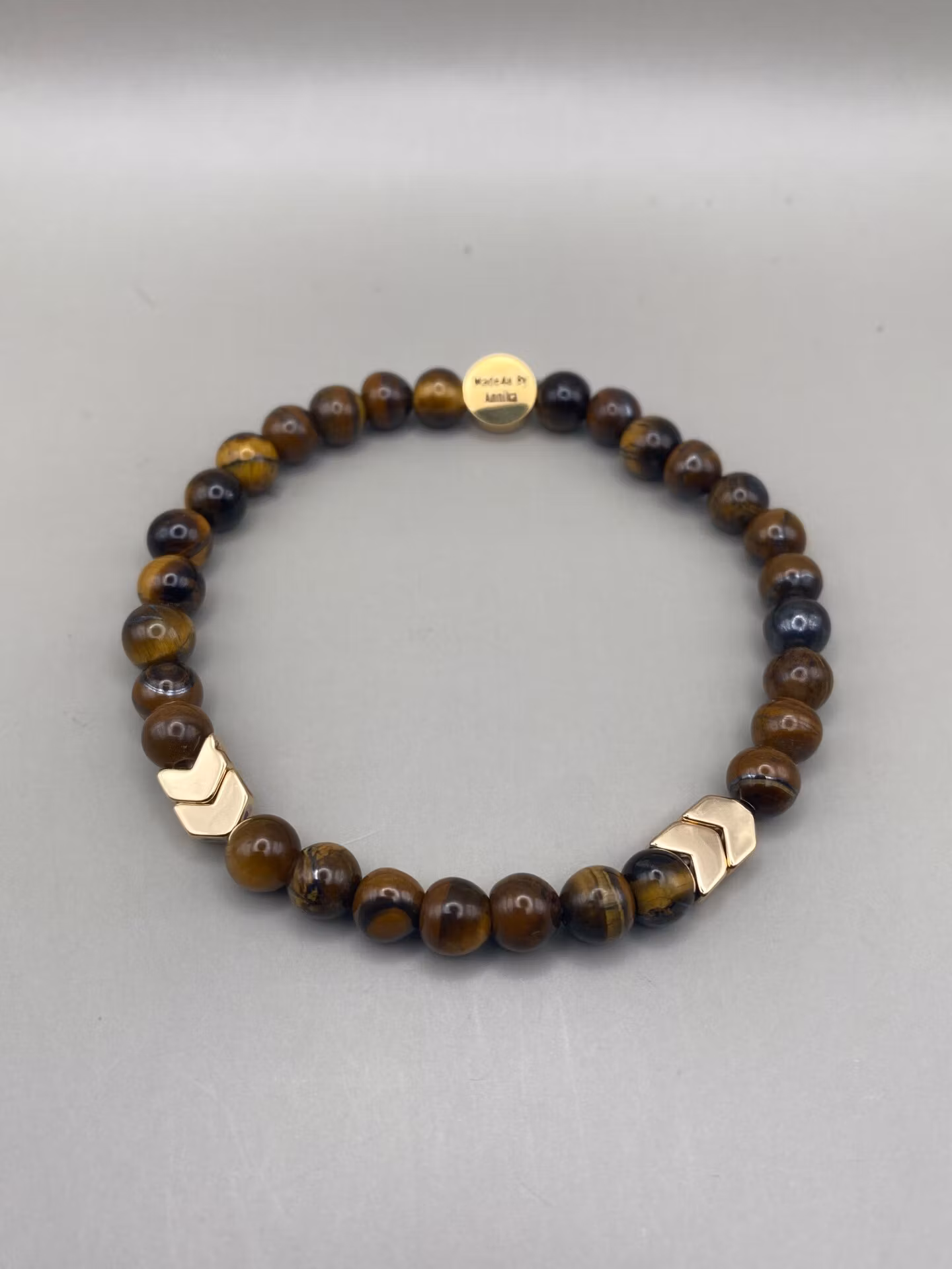 Stiligt armband med vackra brunmellerade stenpärlor tigeröga och stiliga guldfärgade hematitpärlor och fin avslutspärla.Pärlor 6mmVisas produkten "Tillfälligt s