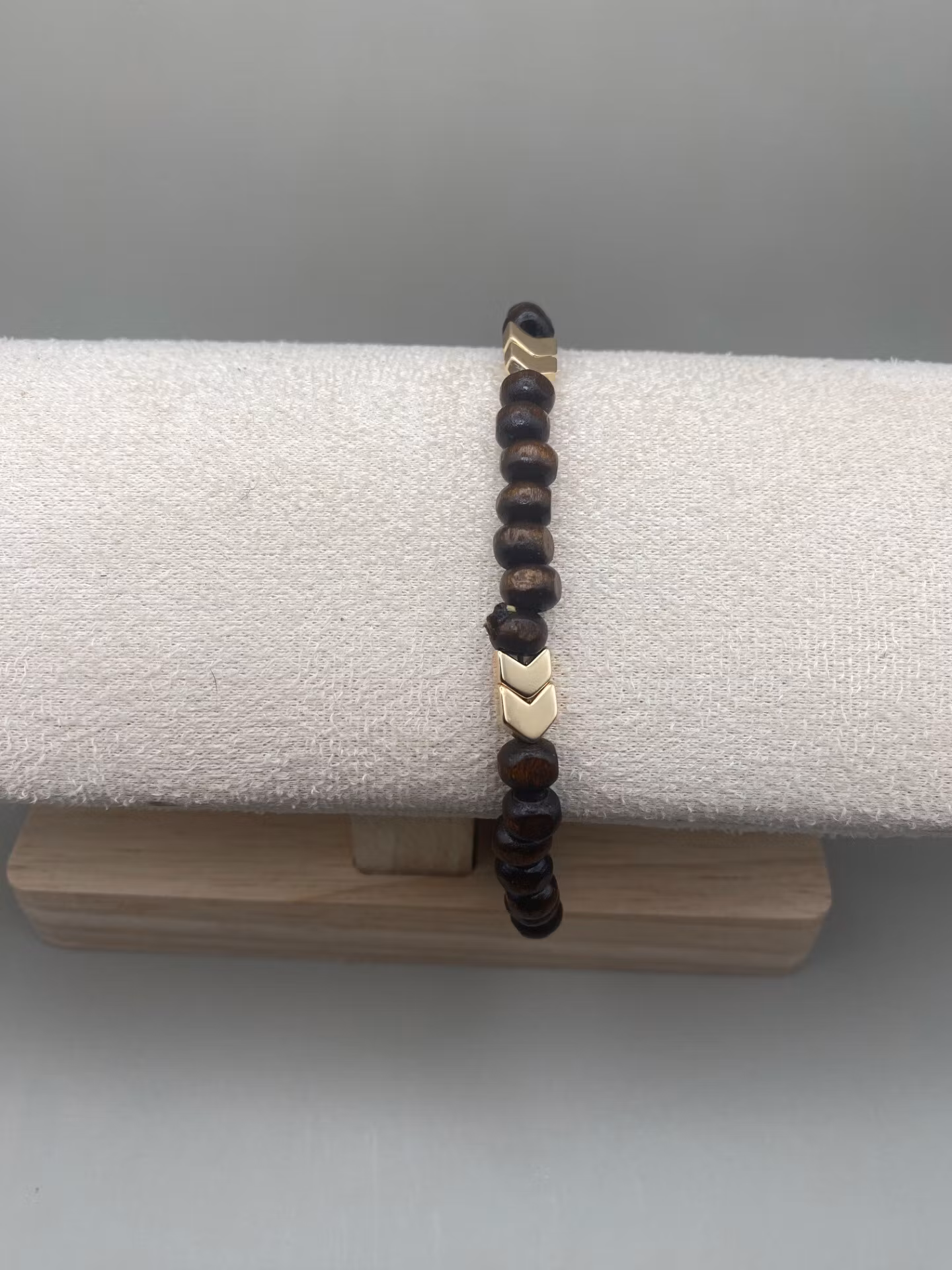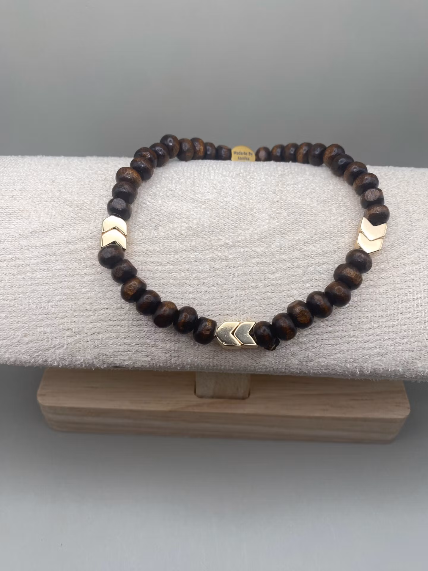 Stiligt armband med vackra brunmellerade träpärlor varvat med guldfärgade hematitpärlor med pilmönster och fin avslutspärla.