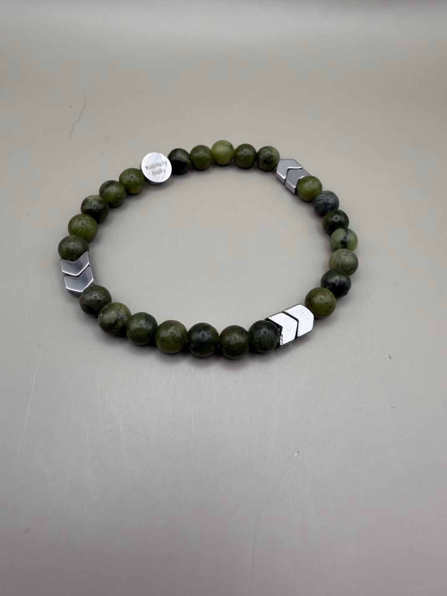 Stiligt armband med gröna naturliga Nephrite Jade pärlor och snyggt mönster med stålfärgade hematitpärlor och avslutas med min signaturpärla..Pärlor 6mmVisas pr