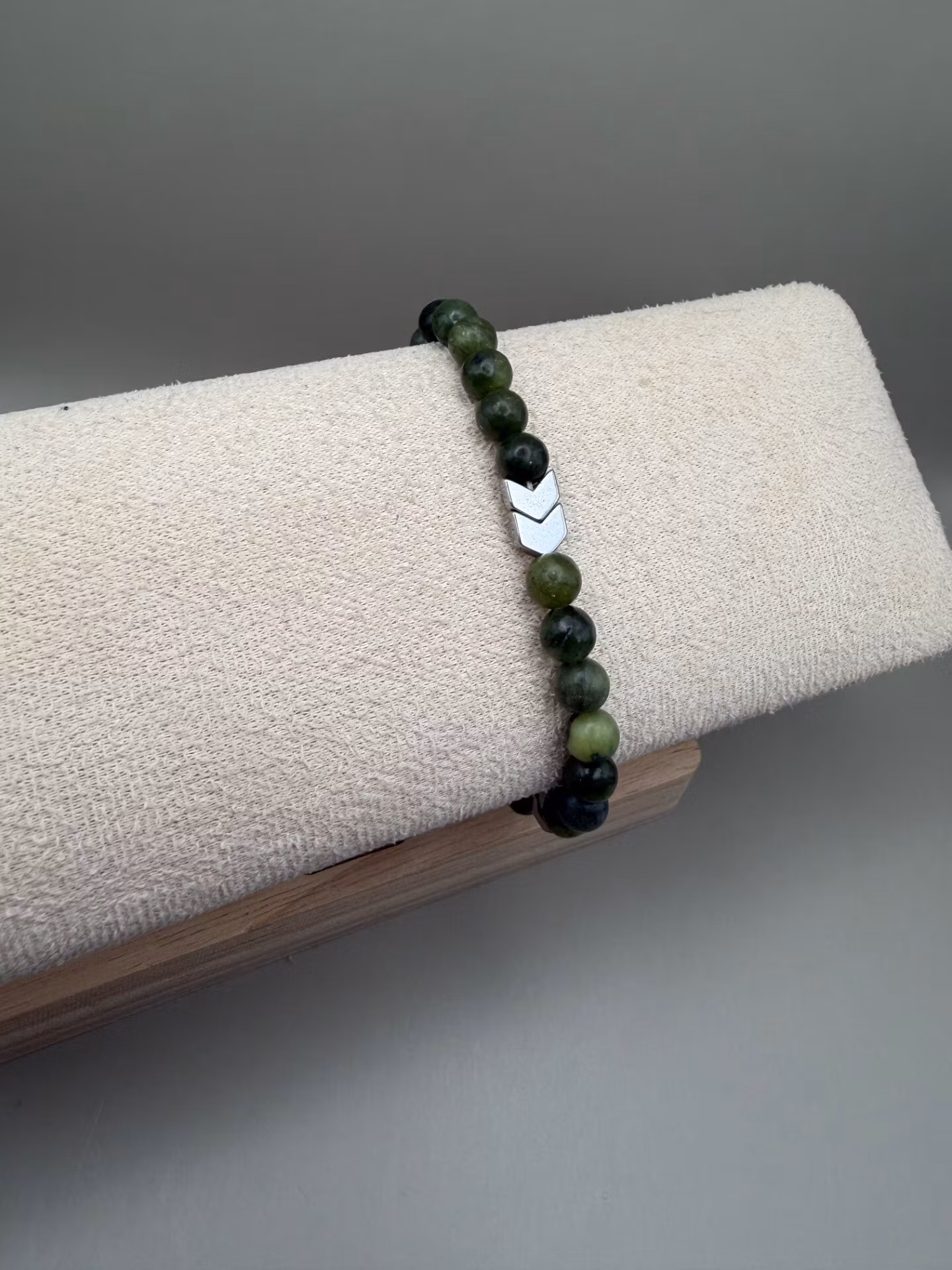 Stiligt armband med gröna naturliga Nephrite Jade pärlor och snyggt mönster med stålfärgade hematitpärlor och avslutas med min signaturpärla..