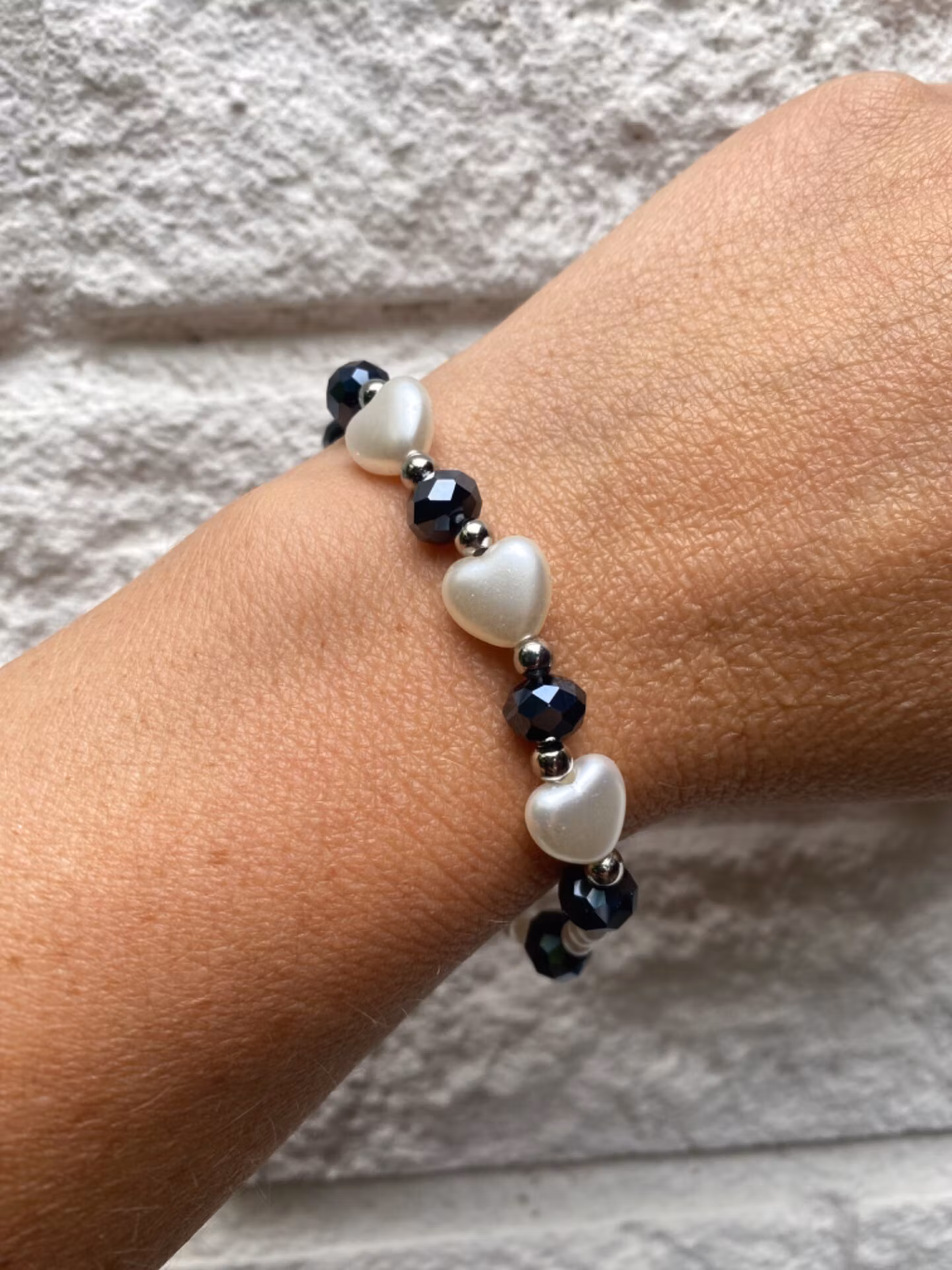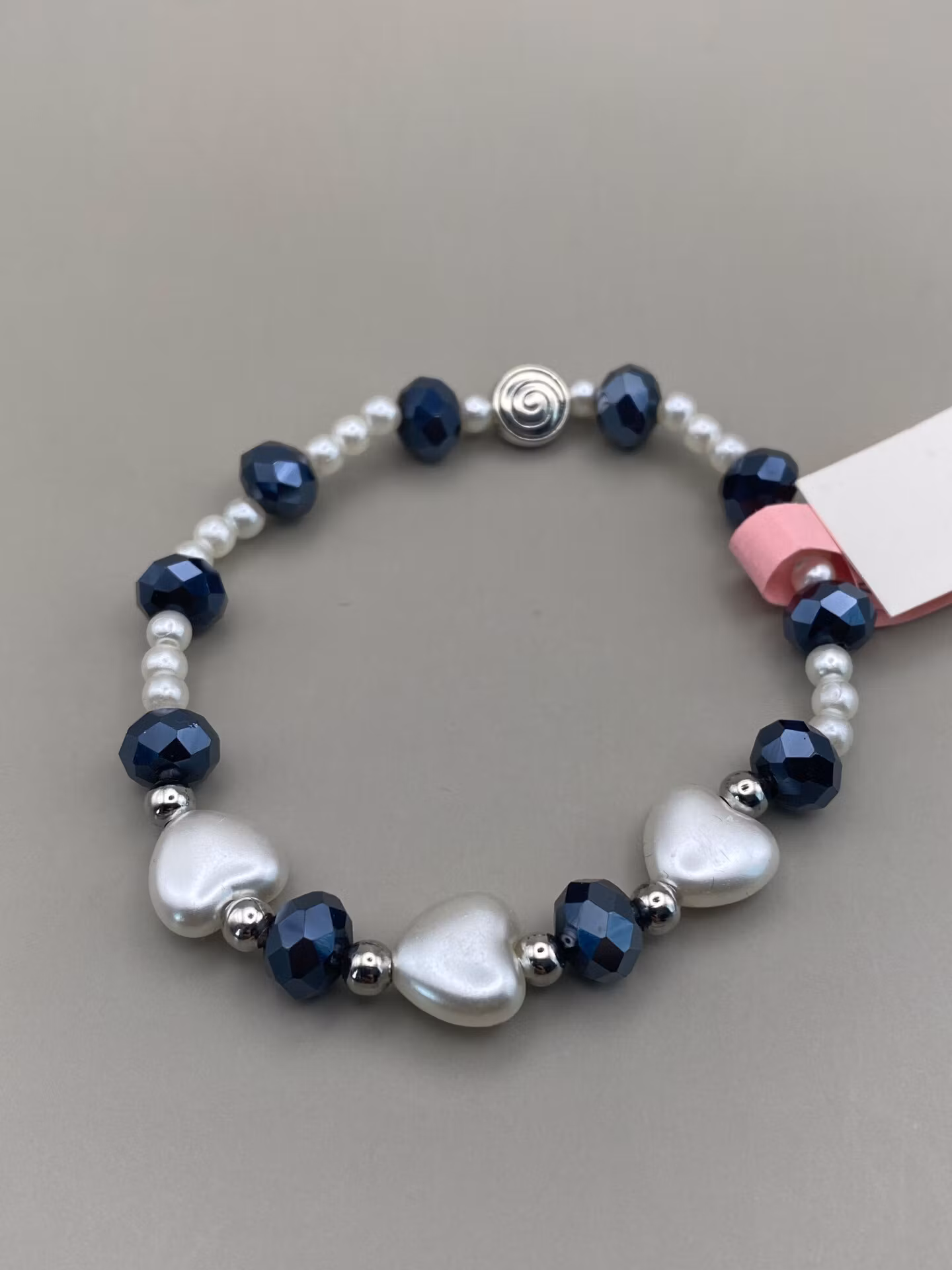 Fint armband av mörkt midnattsblå glaspärlor varvat med benvita hjärtan och silverfärgade pärlor i blickfånget och midnattsblå glaspärlor varvat med små benvita pärlor runt om.