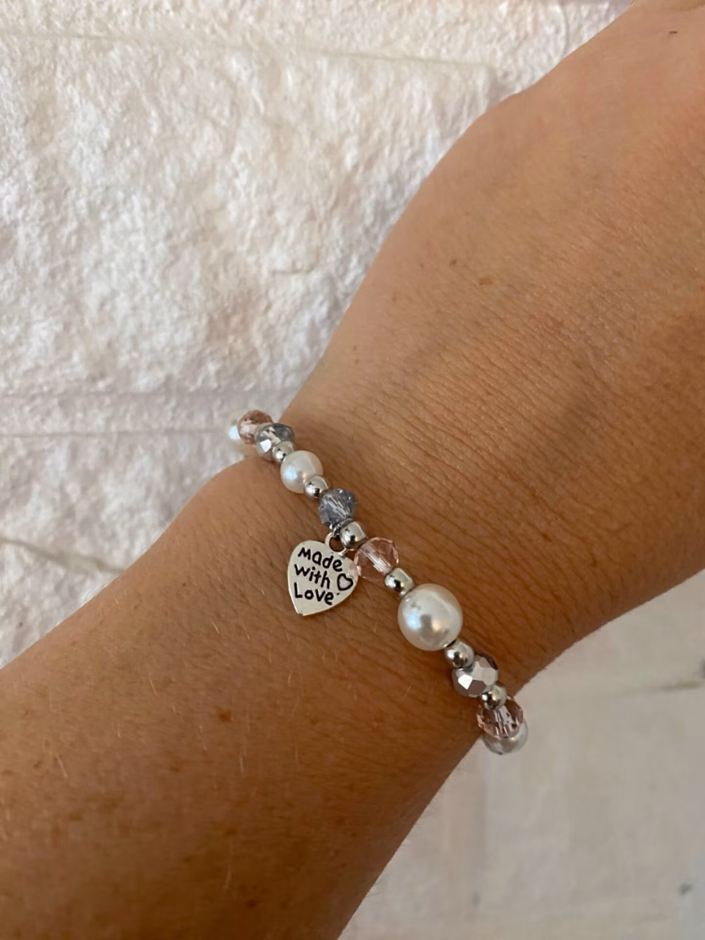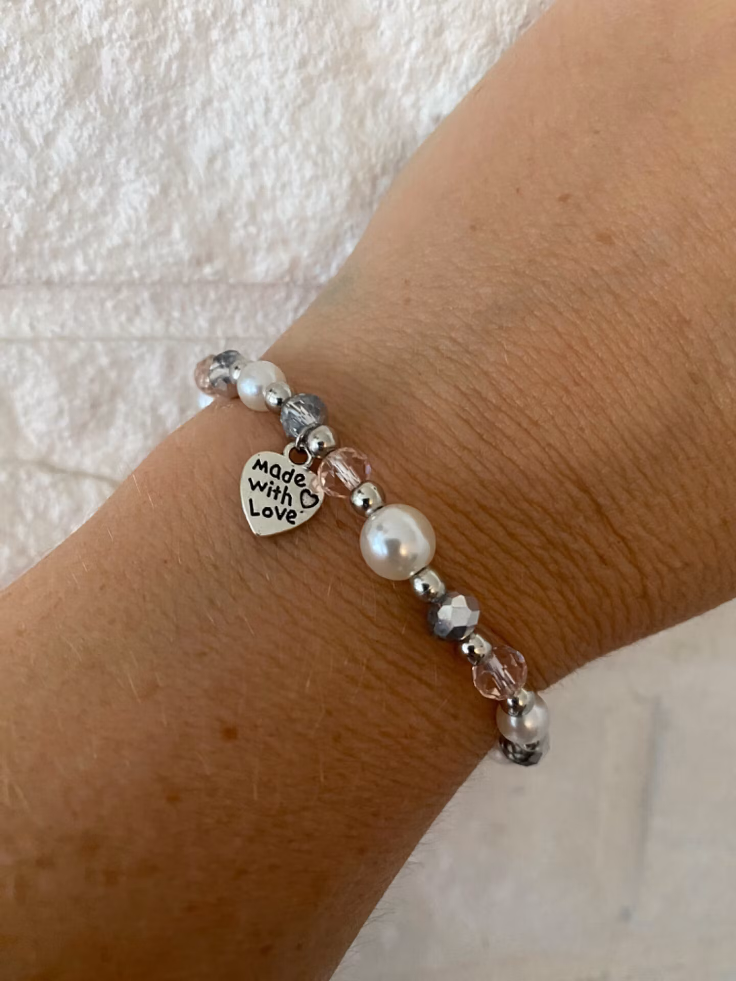 Vackert armband i fin mix av varvat ljust silvergrå glaspärlor, ljusrosa glaspärlor, benvita vaxade pärlor och silverfärgade pärlor.