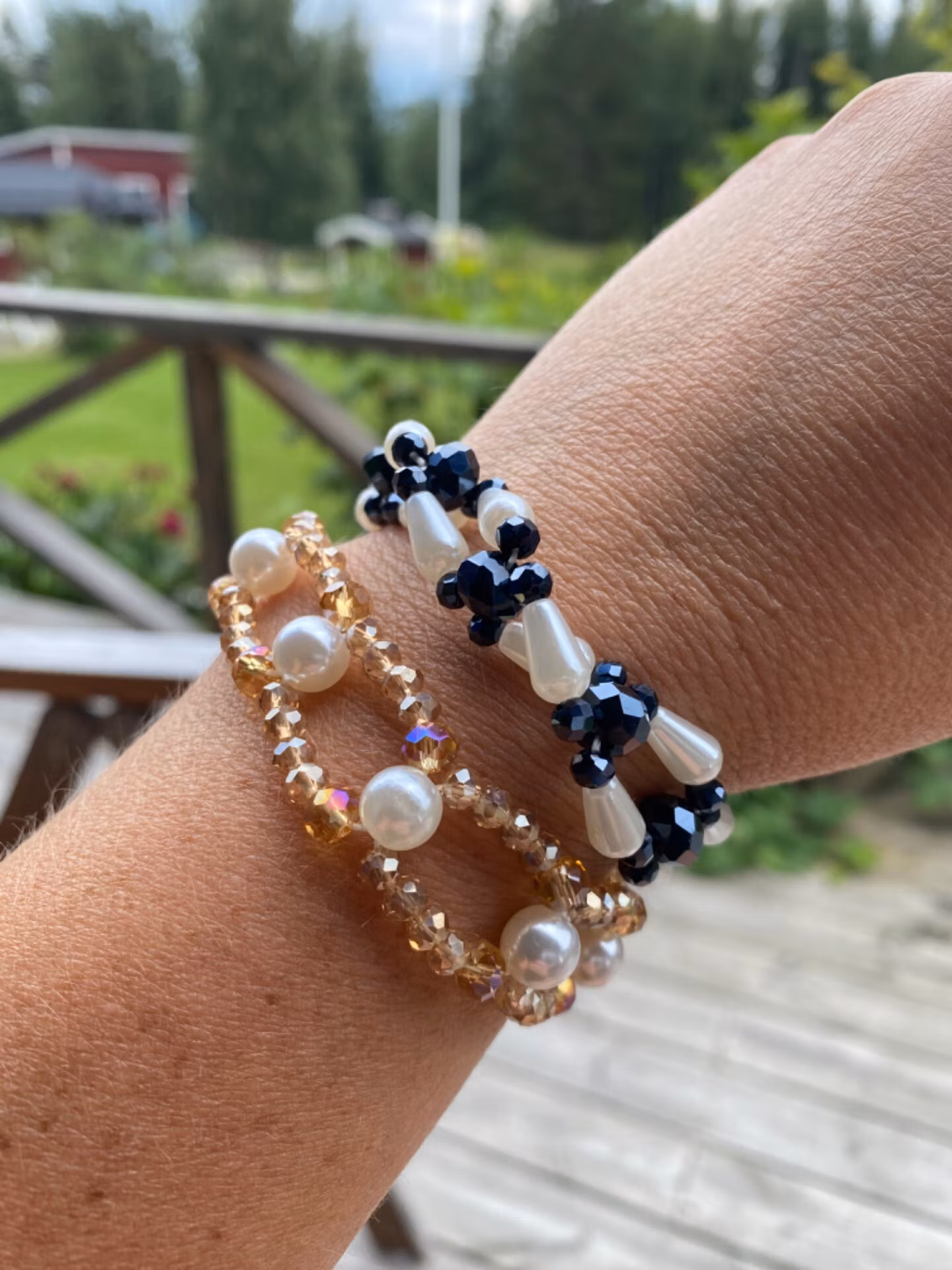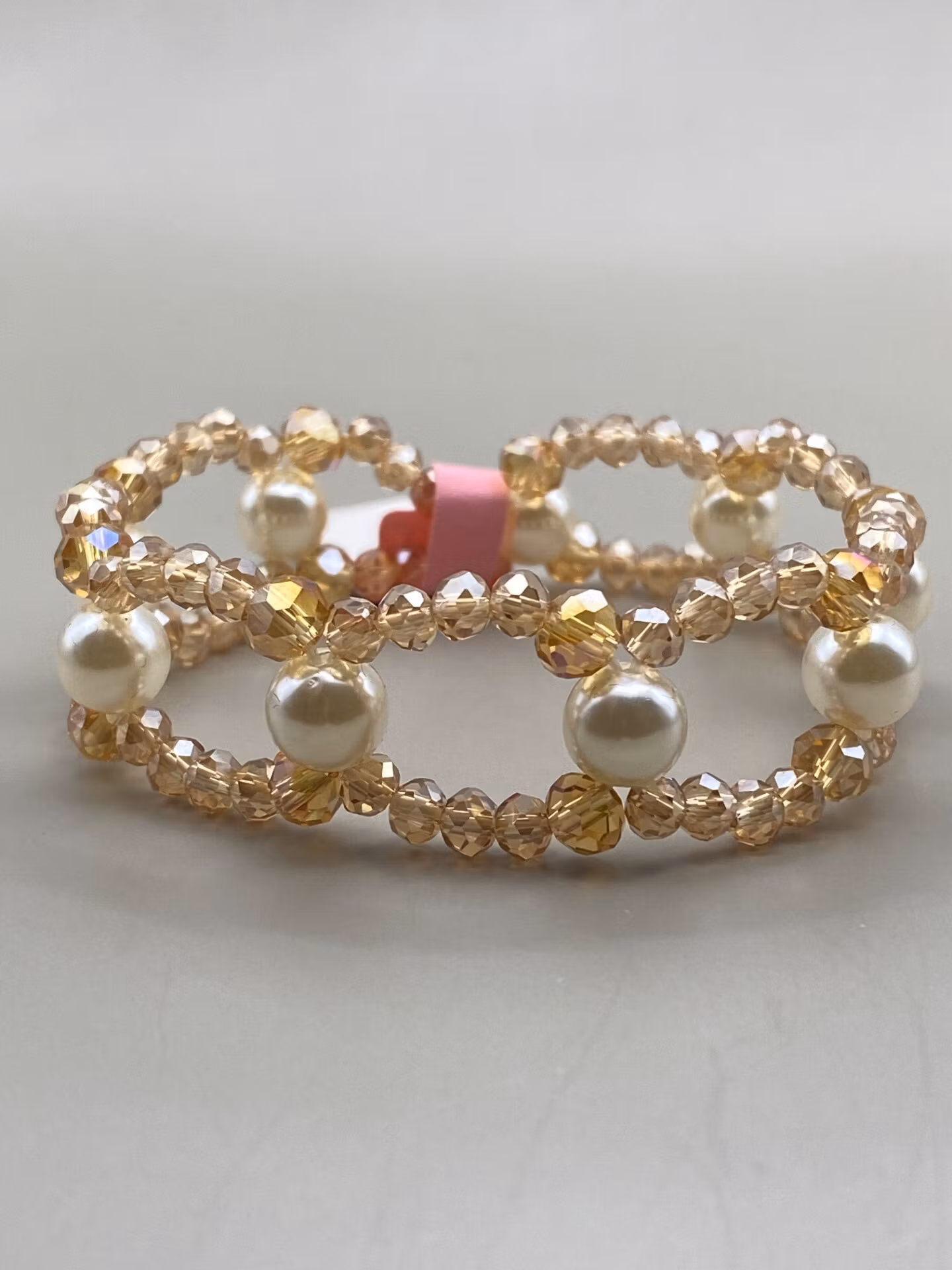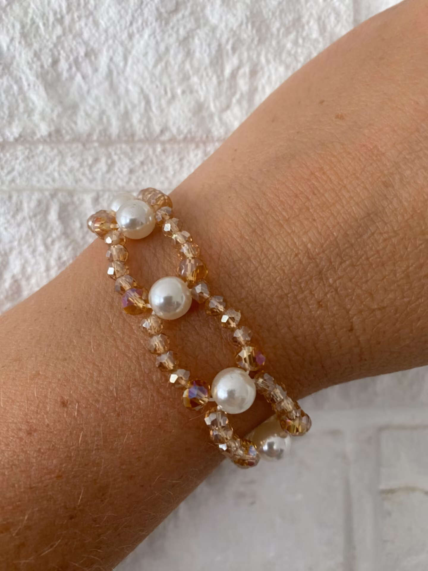 Armband i vackert brett mönster av skimrande små aningen mörkare champagnefärgade glaspärlor varvat med större kritvita pärlor.