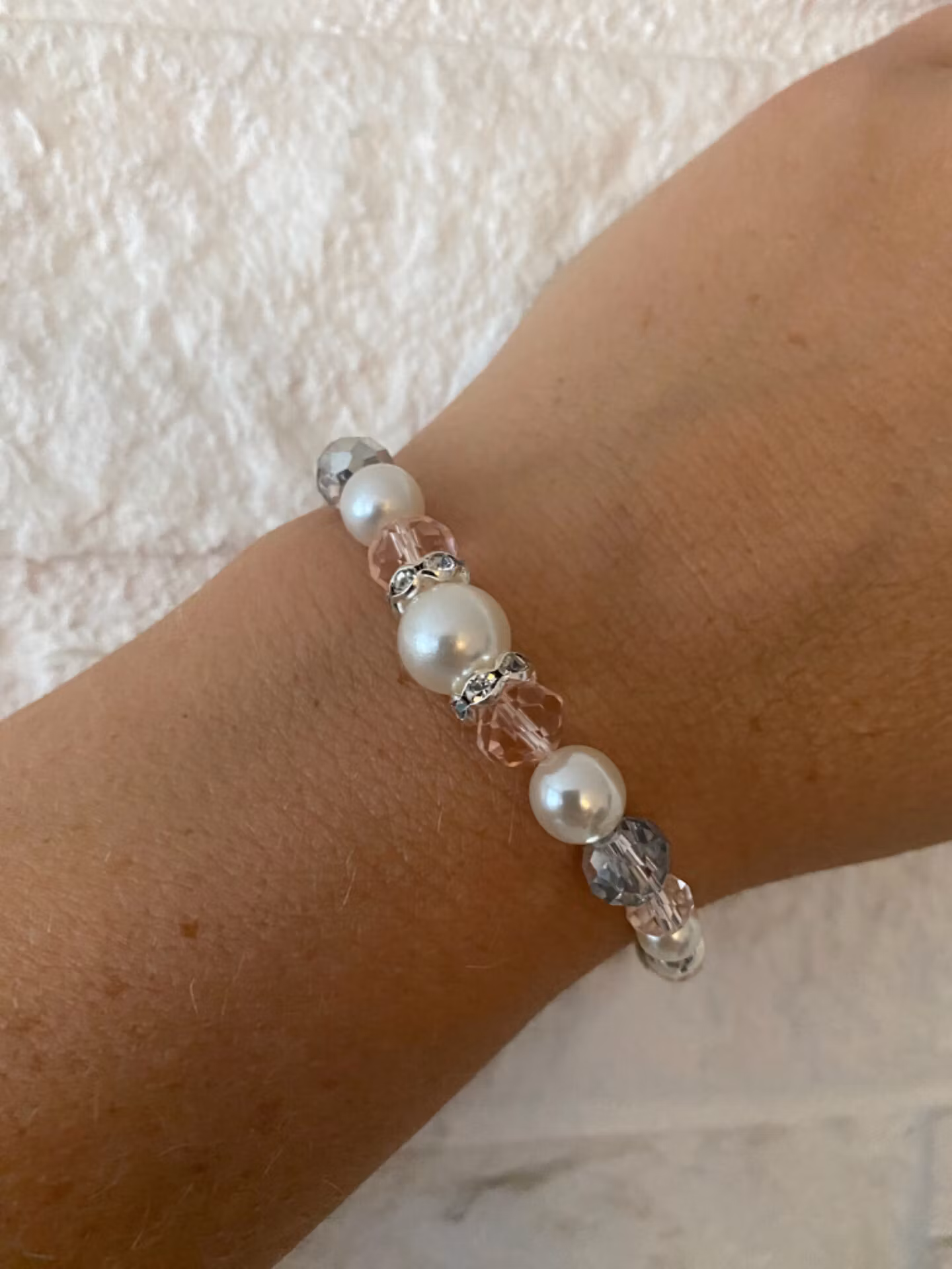 Armband i vackert mönster av benvita pärlor varvat med ljusrosa glaspärlor och silverfärgade pärlor i blickfånget. Mindre benvita pärlor runtom, samt silverfärg