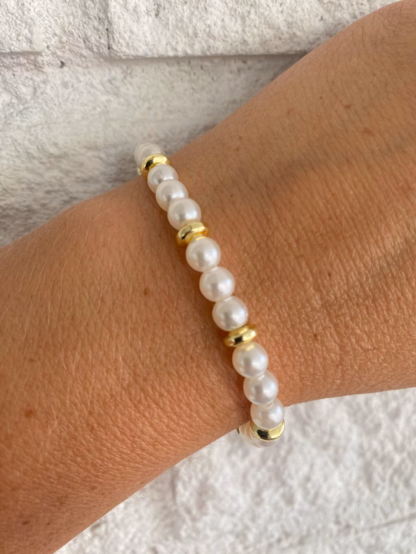 Vackert och stilrent armband i fint mönster av benvita högblanka pärlor och guldfärgade distanspärlor.