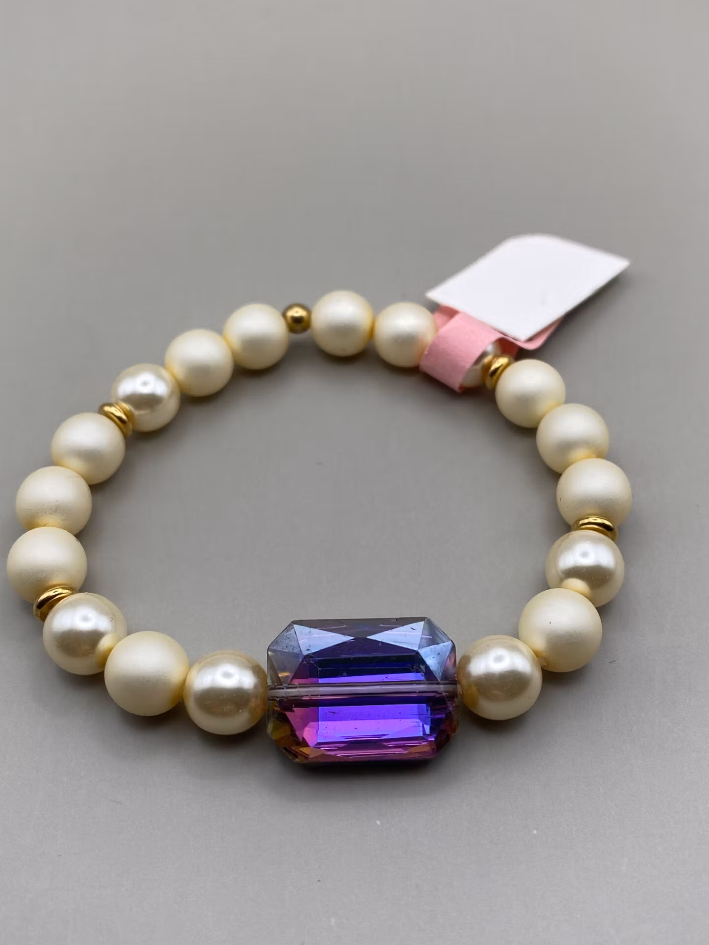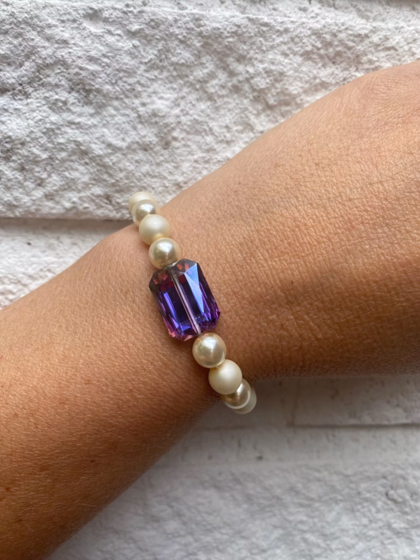 Tjustgt armband i beiga matta pärlor varvat med enstaka blanka beiga pärlor och guldfärgade detaljer. Stor platt rektangulär glaspärla i blickfånget, ena sidan är skimrande lila och den andra sidan är skimrande guld/gul. Välj vilken sida av pärlan som passar bäst till outfiten.