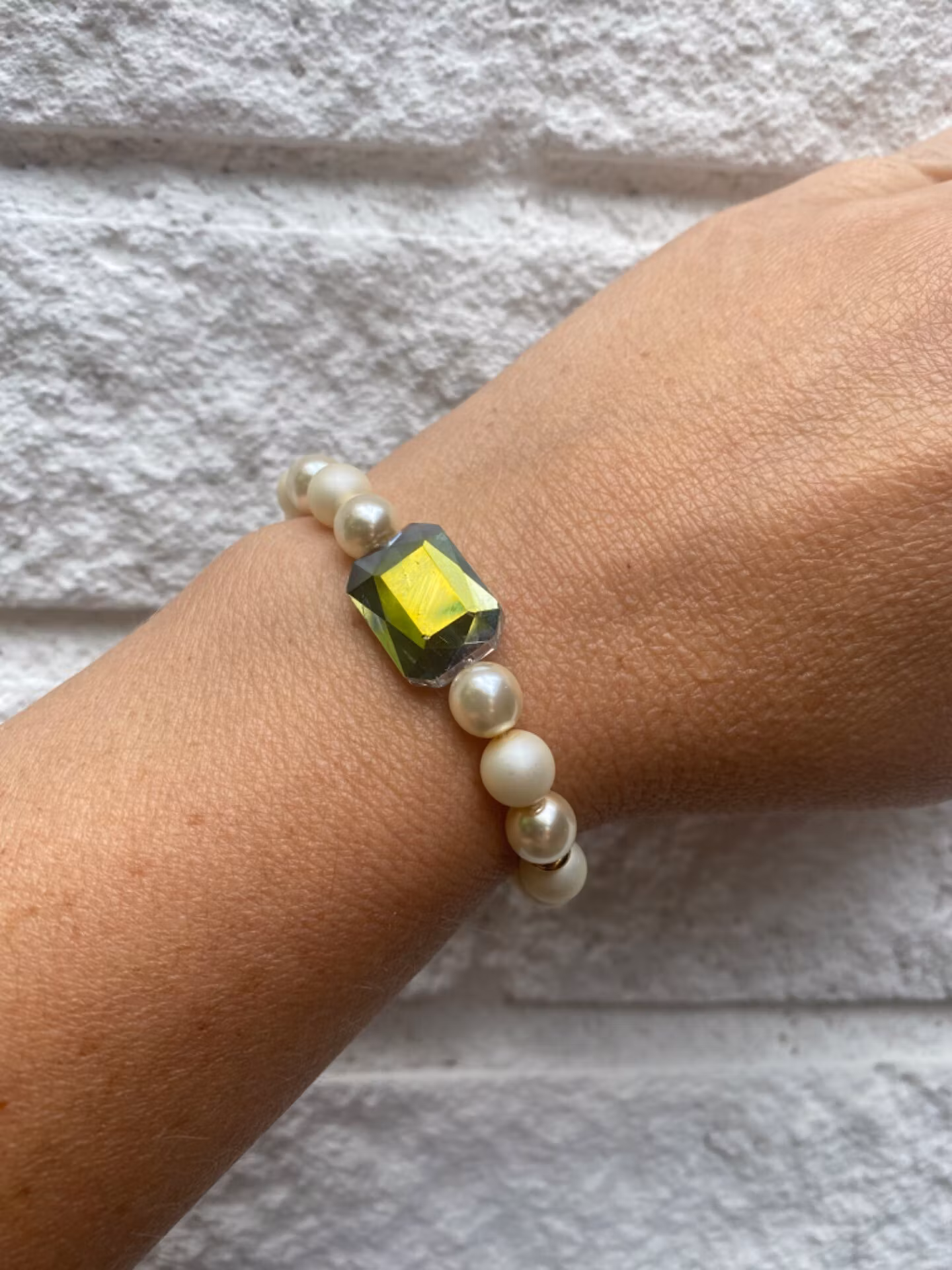 Tjustgt armband i beiga matta pärlor varvat med enstaka blanka beiga pärlor och guldfärgade detaljer. Stor platt rektangulär glaspärla i blickfånget, ena sidan