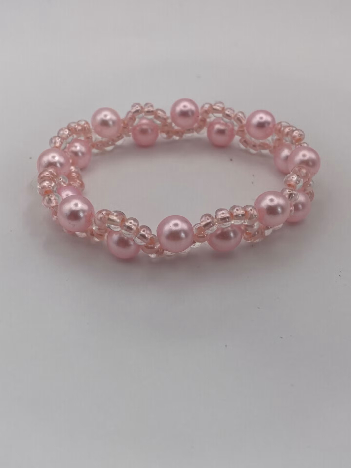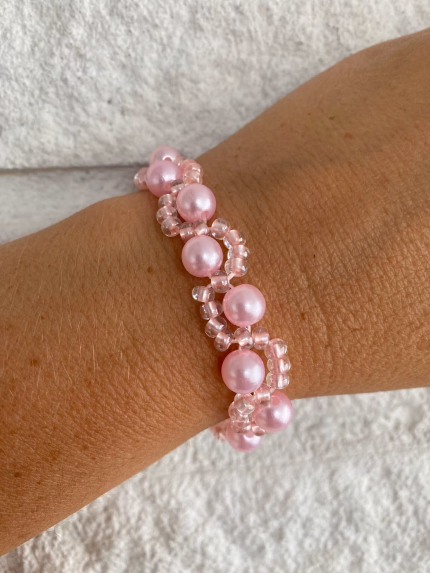 Tjustgt flerradigt armband i rosa toner, rosa glansiga pärlor varvat i fint mönster av ljusrosa glaspärlor.