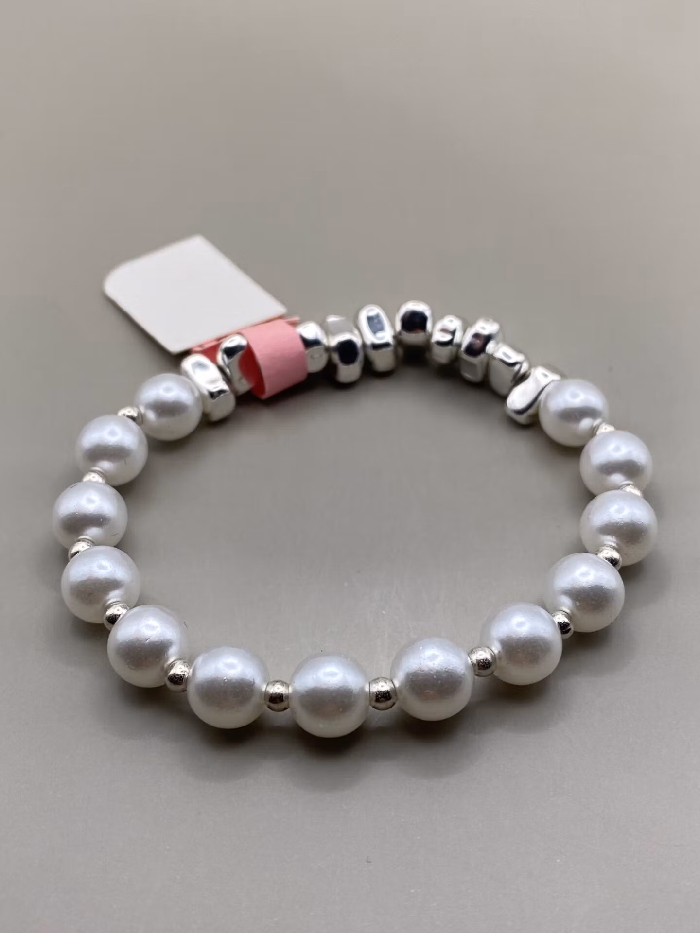 Stiligt armband av kritvita högblanka pärlor varvat med små silverfärgade pärlor, större oregelbundna silverfärgade pärlor i blickfånget.