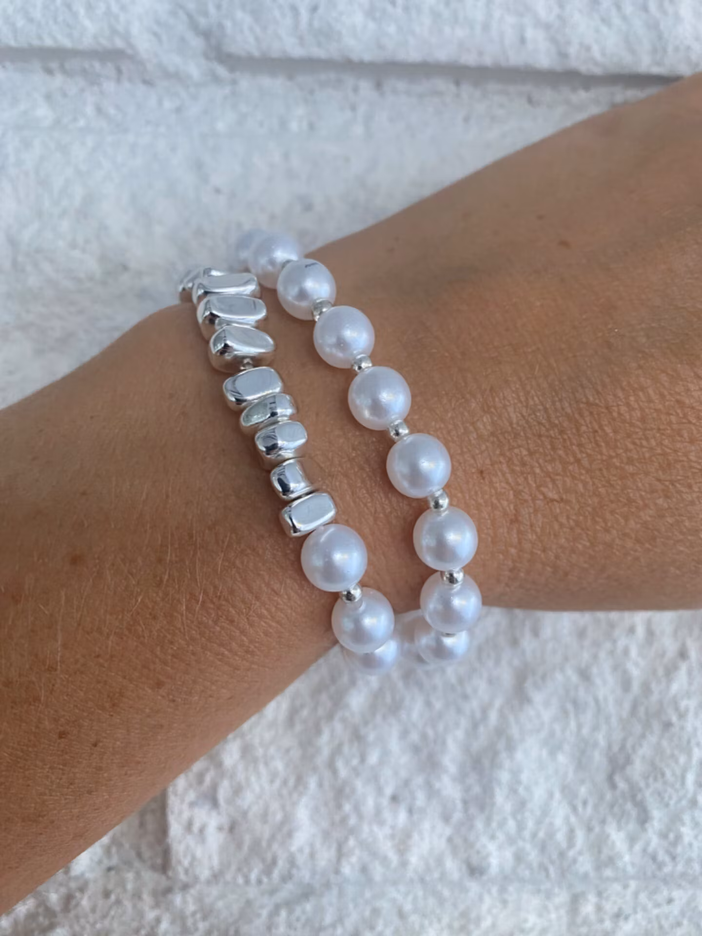 Stiligt armband av kritvita högblanka pärlor varvat med små silverfärgade pärlor, större oregelbundna silverfärgade pärlor i blickfånget.Armbandet kan användas