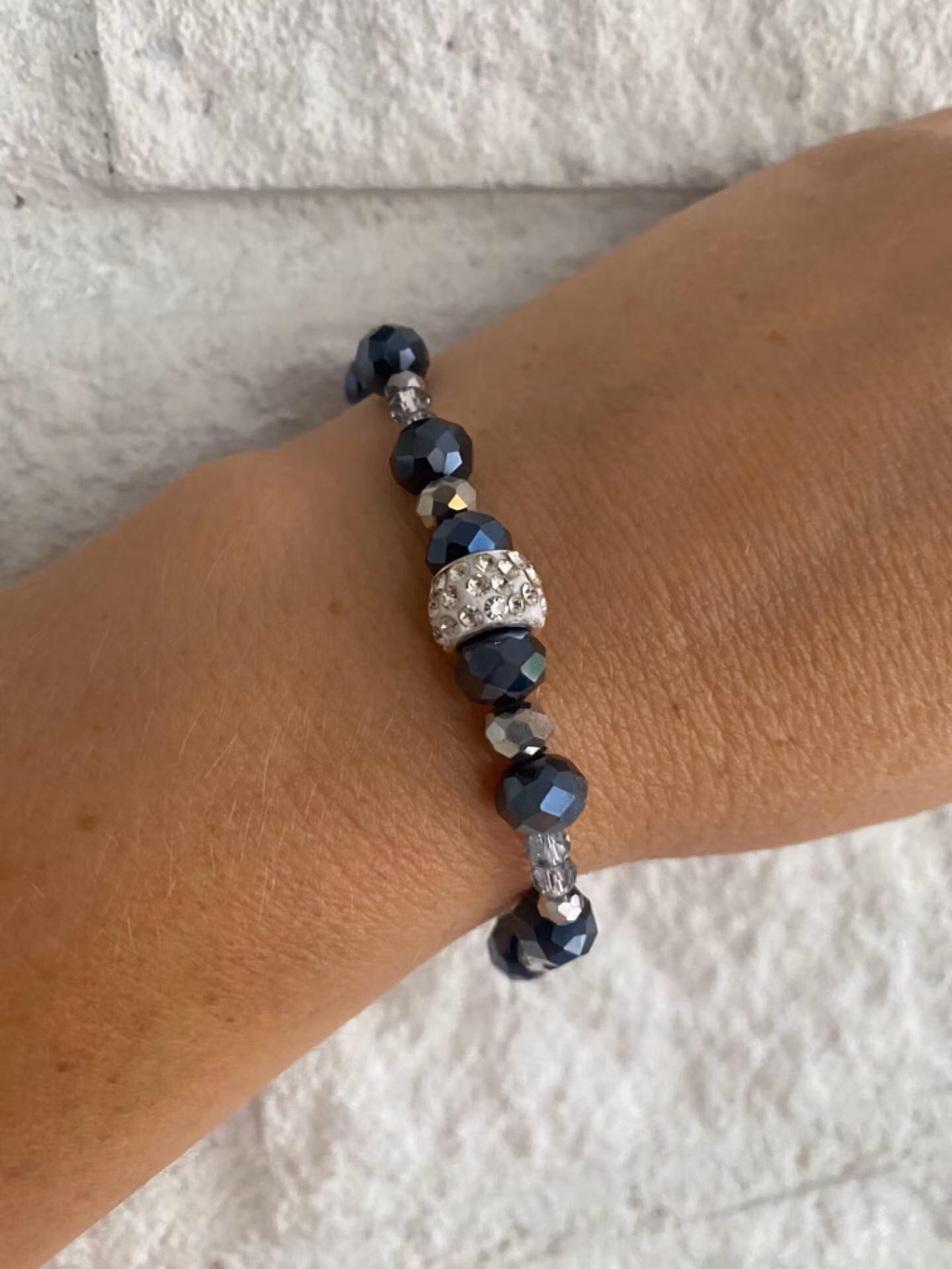 Vackert armband i fin mix av varvat ljust små silvergrå glaspärlor och stora midnattsblå glaspärlor och större strass i blickfånget. Glimrar fint på armen