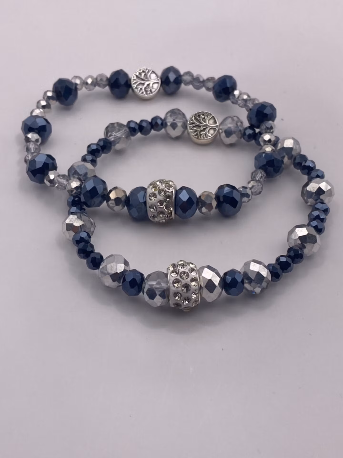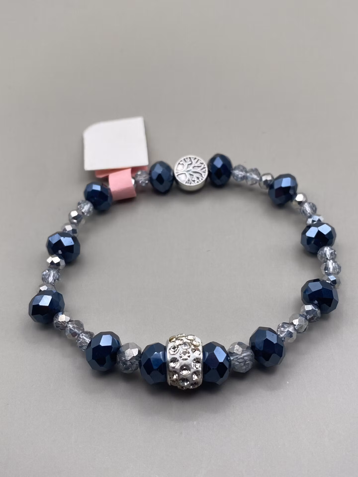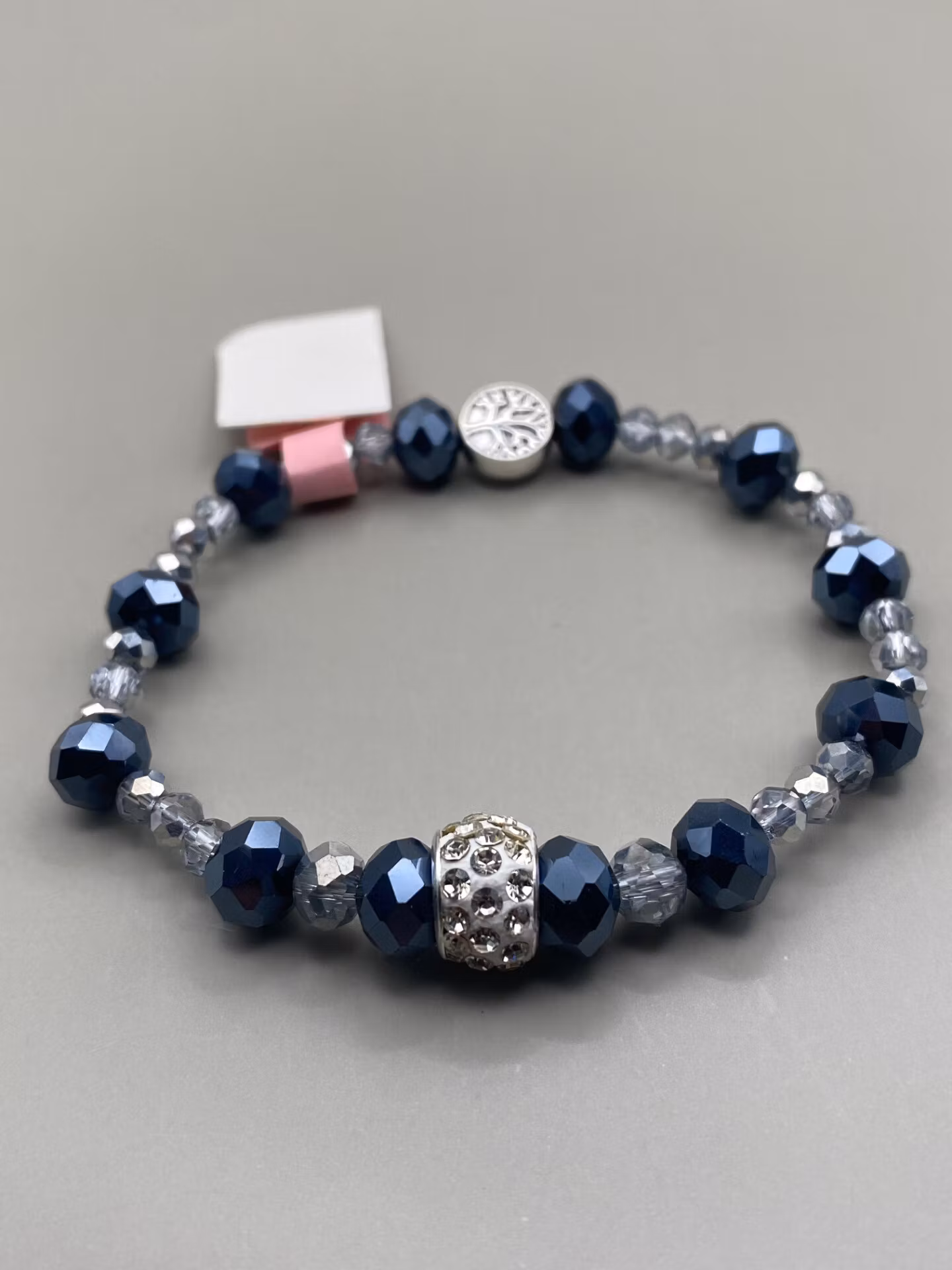 Vackert armband i fin mix av varvat ljust små silvergrå glaspärlor och stora midnattsblå glaspärlor och större strass i blickfånget. Glimrar fint på armenmatcha