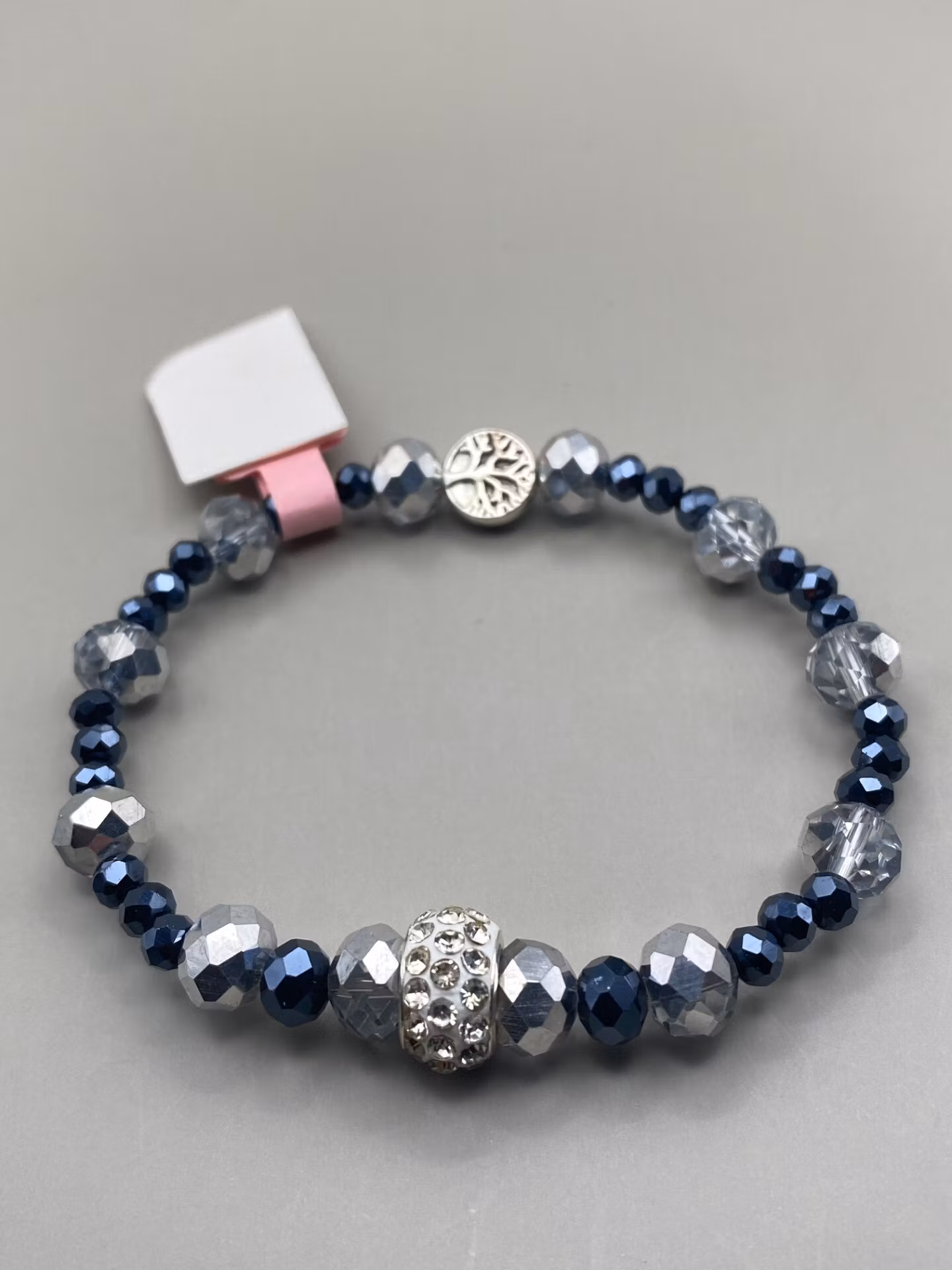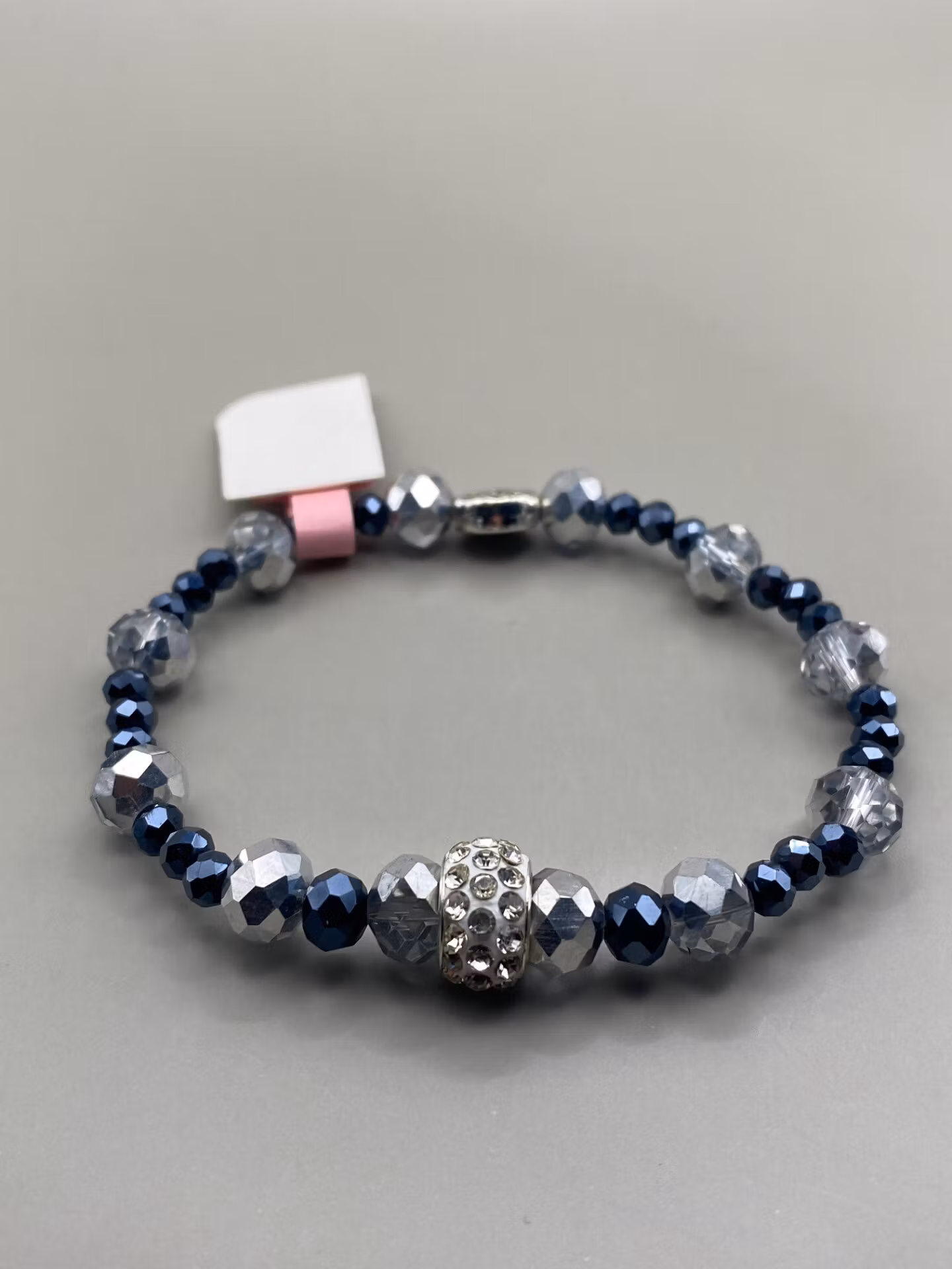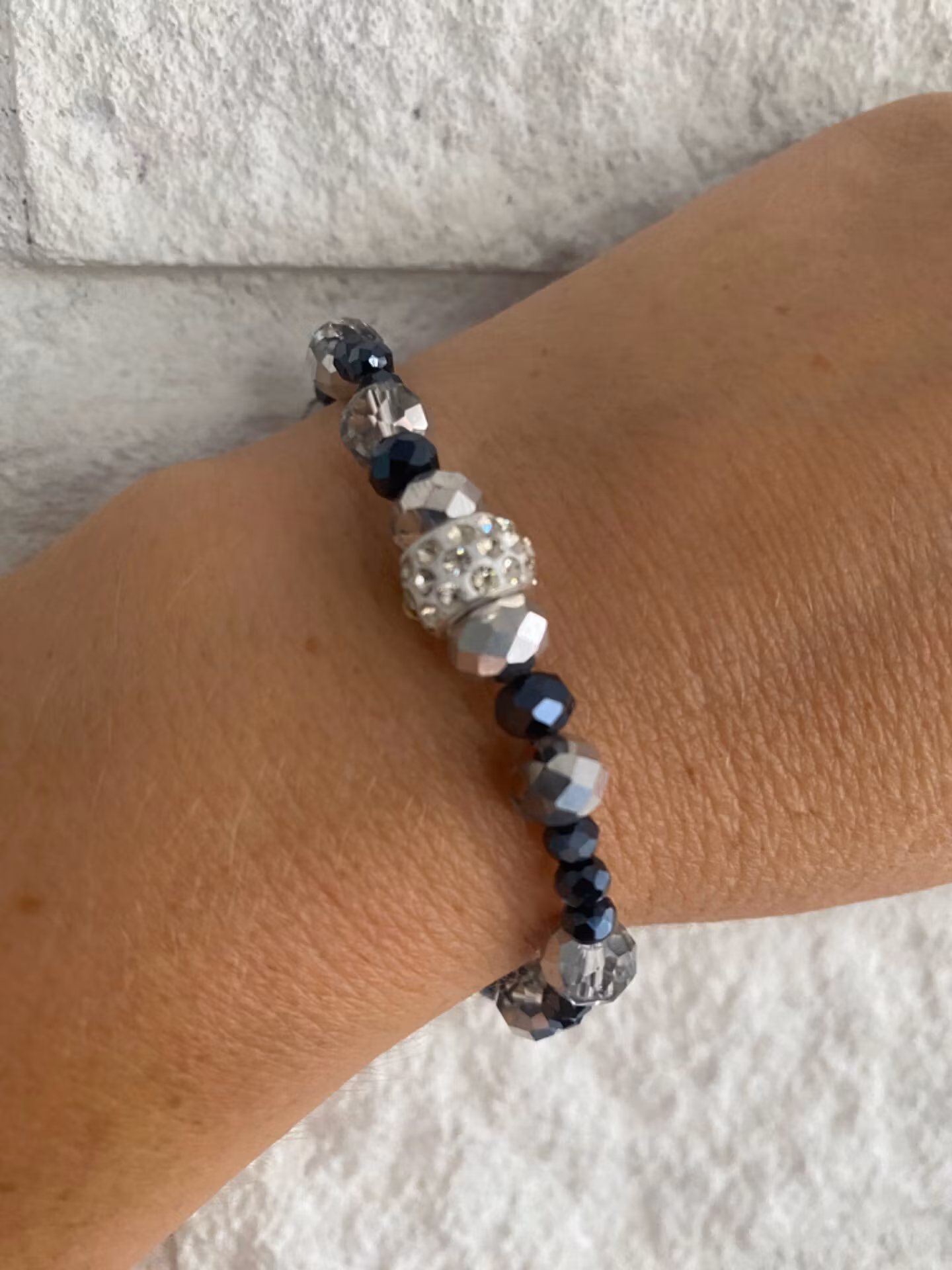 Vackert armband i fin mix av varvat små midnattsblå glaspärlor och stora silvergrå glaspärlor och större strass i blickfånget. Glimrar fint på armenmatcha med e