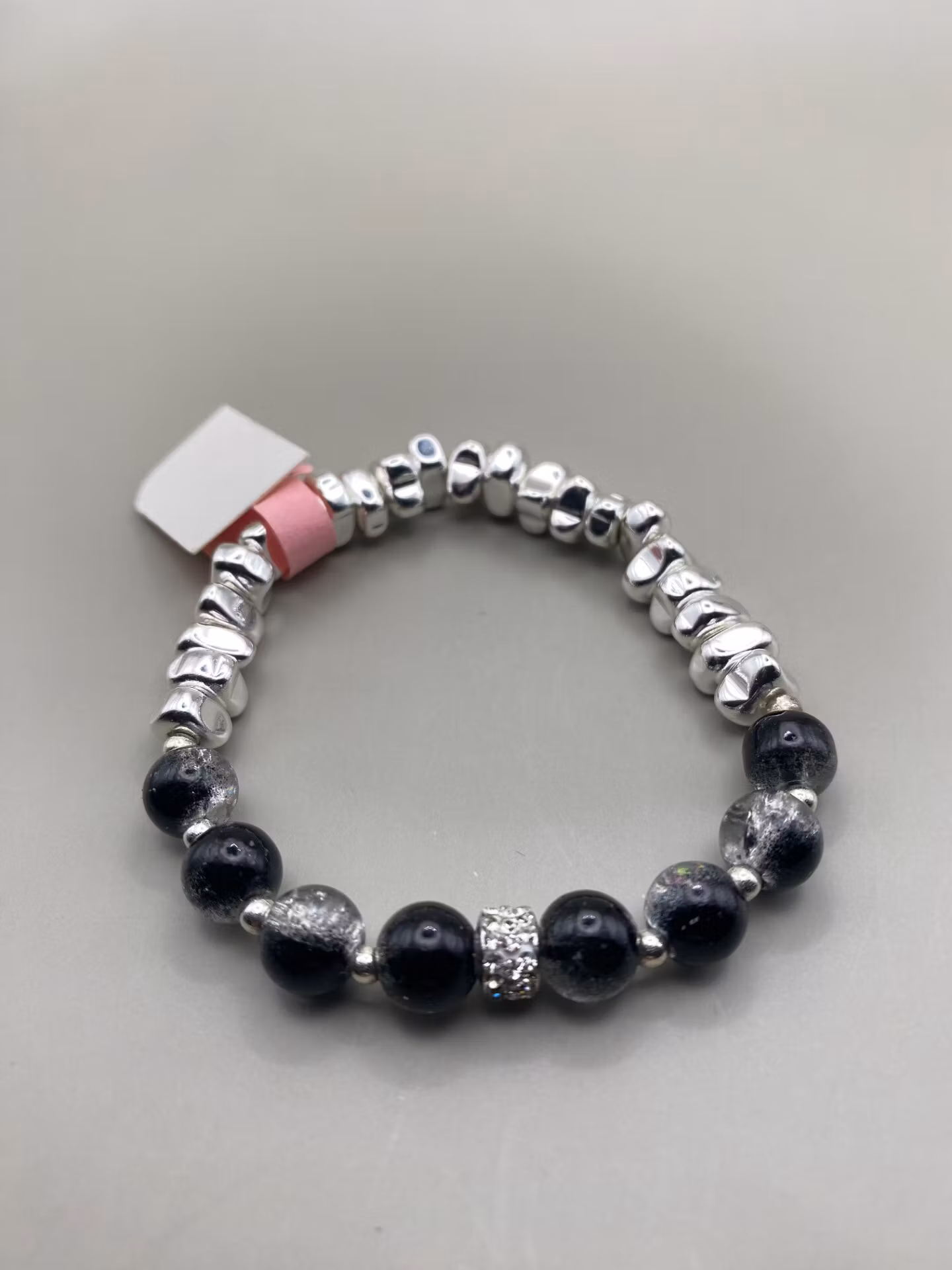 Stiligt armband av svartmellerade glaspärlor varvat med små silverfärgade pärlor och strass i blickfånget. Runt om silverfärgade oregelbundna pärlor. Härlig tyn